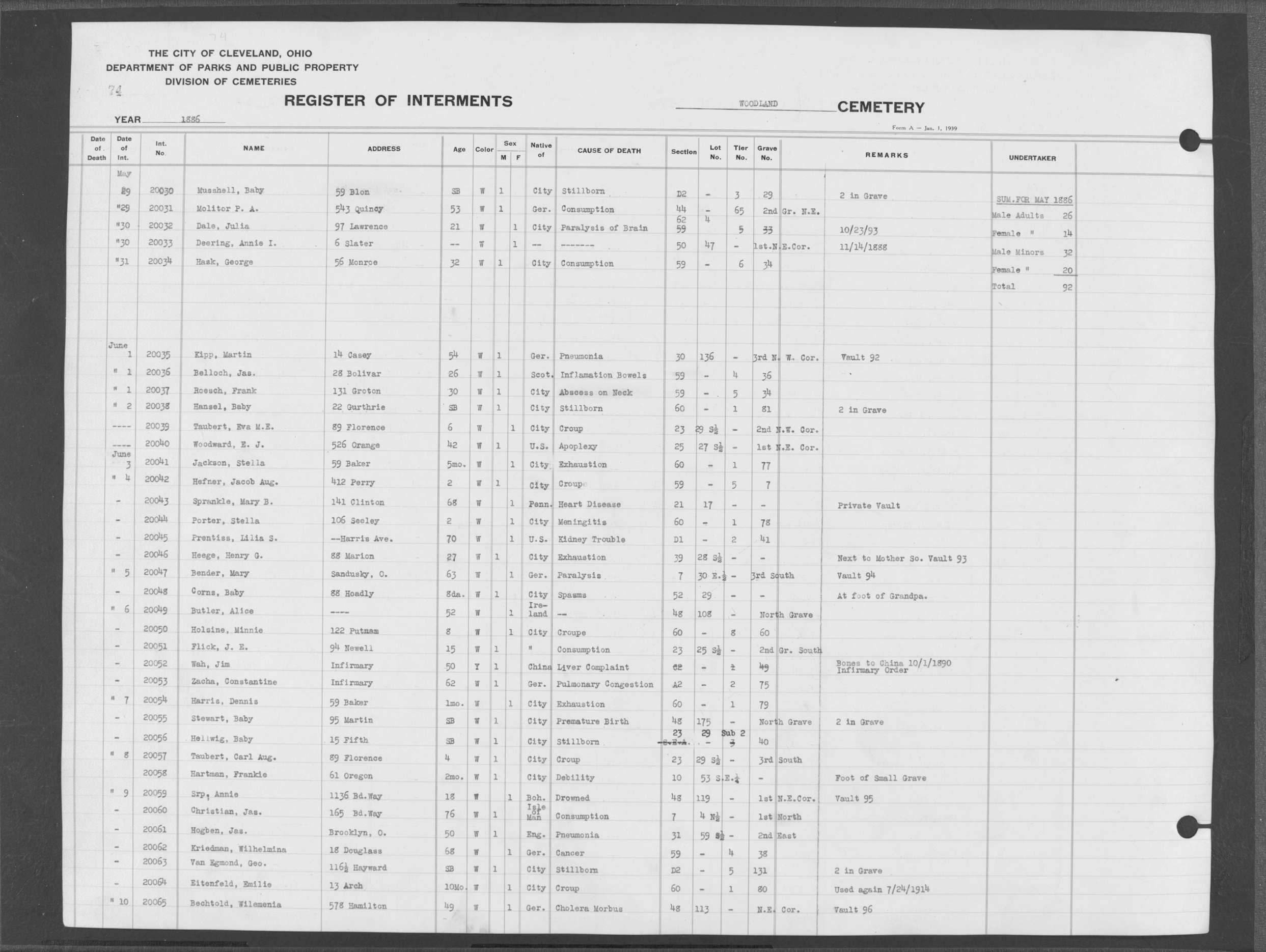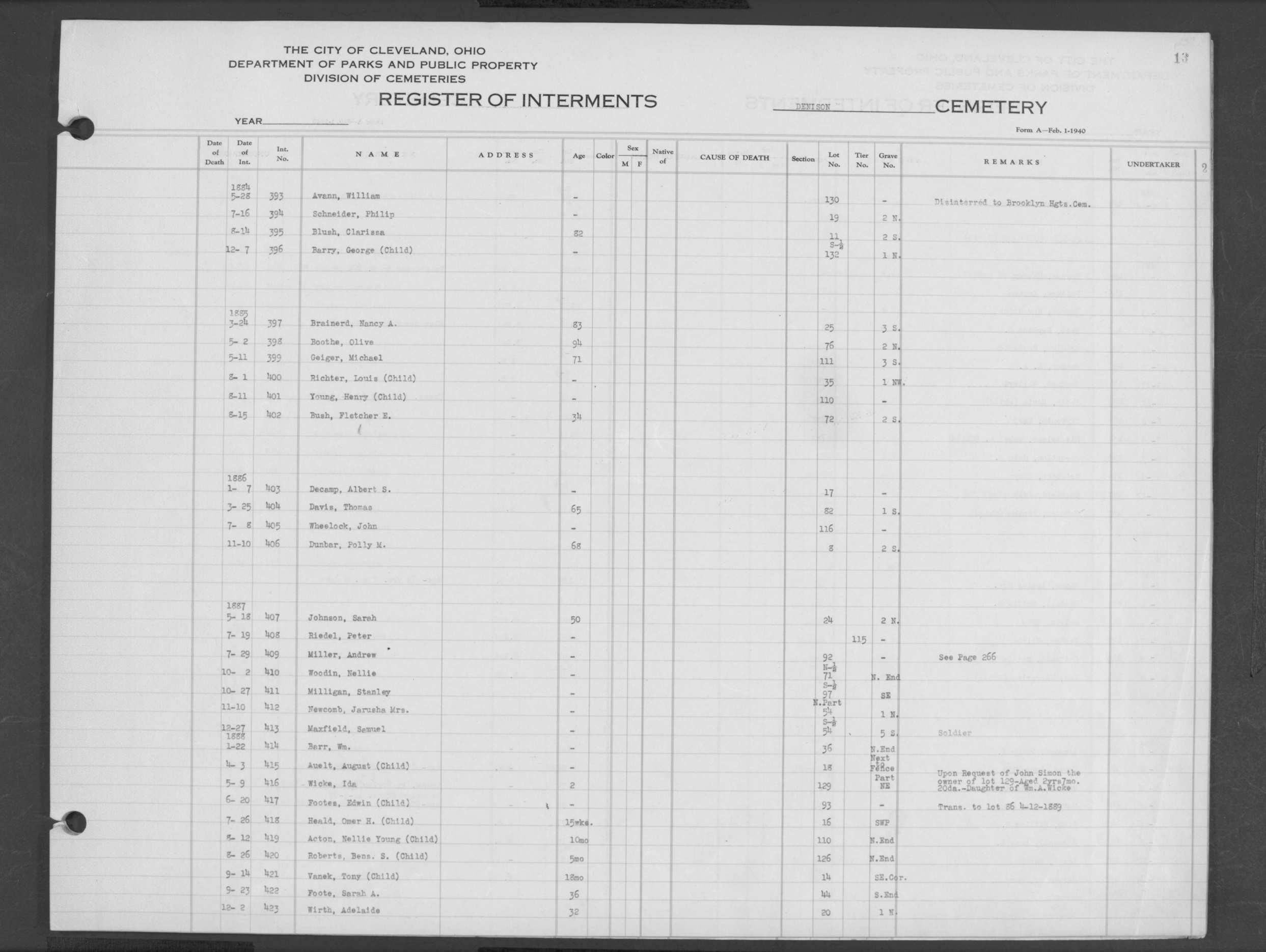 | Monroe Street | 2 | 65 | Apr | 22 | 1886 | 13636 | Dertinger, | SB | W | M | ||||