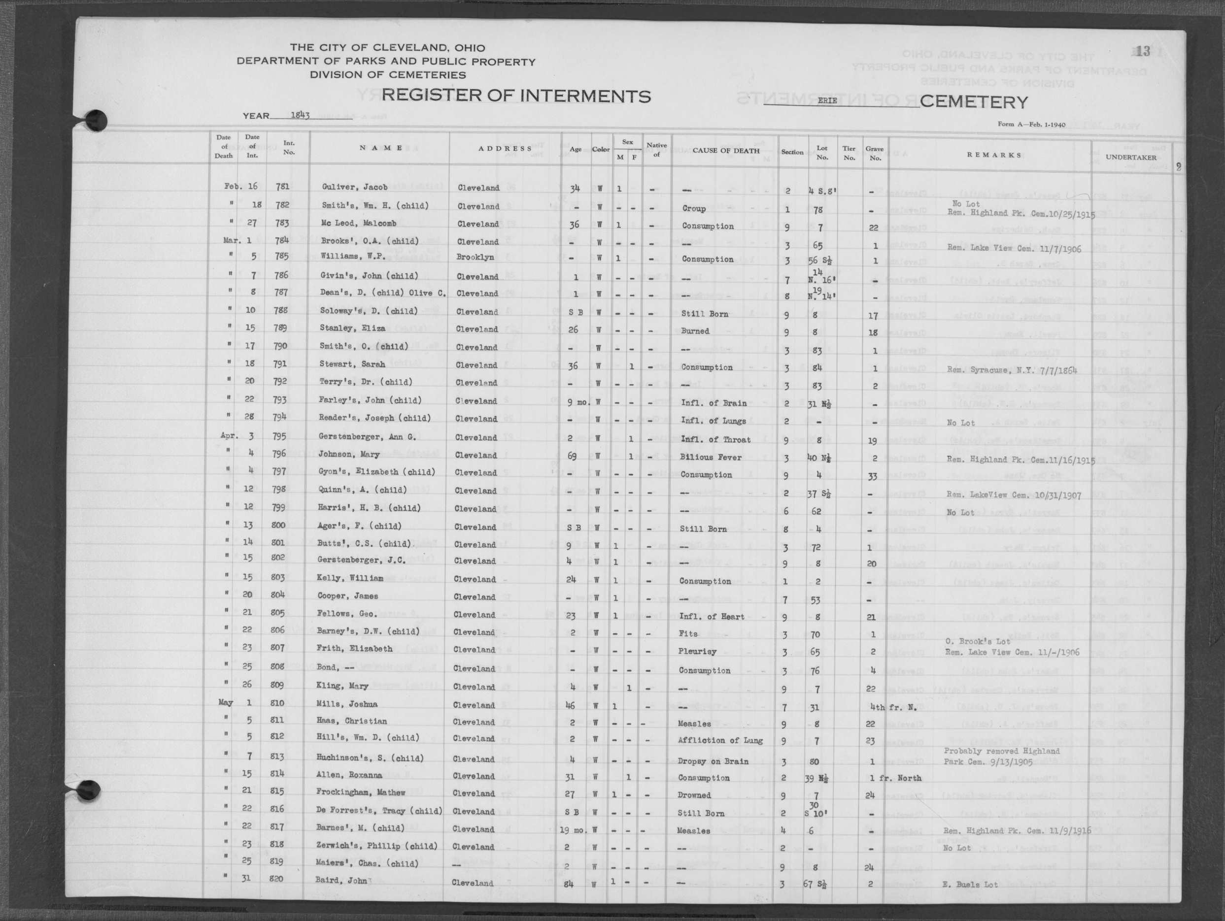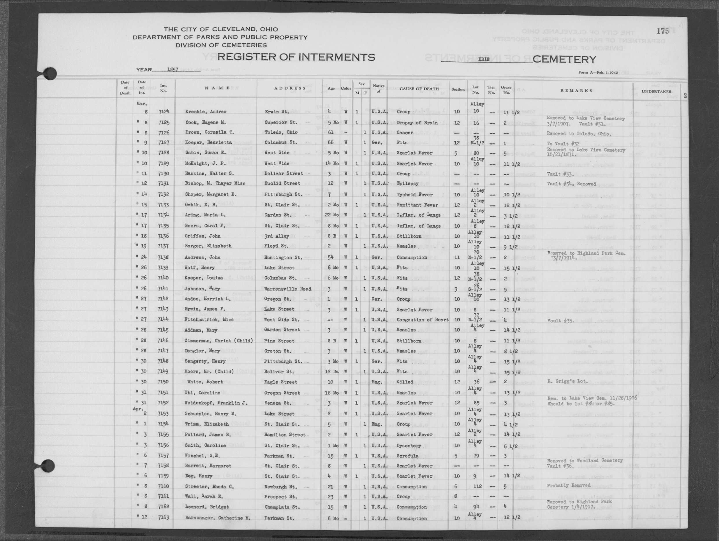 | Erie Street | 1 | 138 | Apr | 3 | 1854 | 5758 | Deal, Mary A | 38y | W | |||||