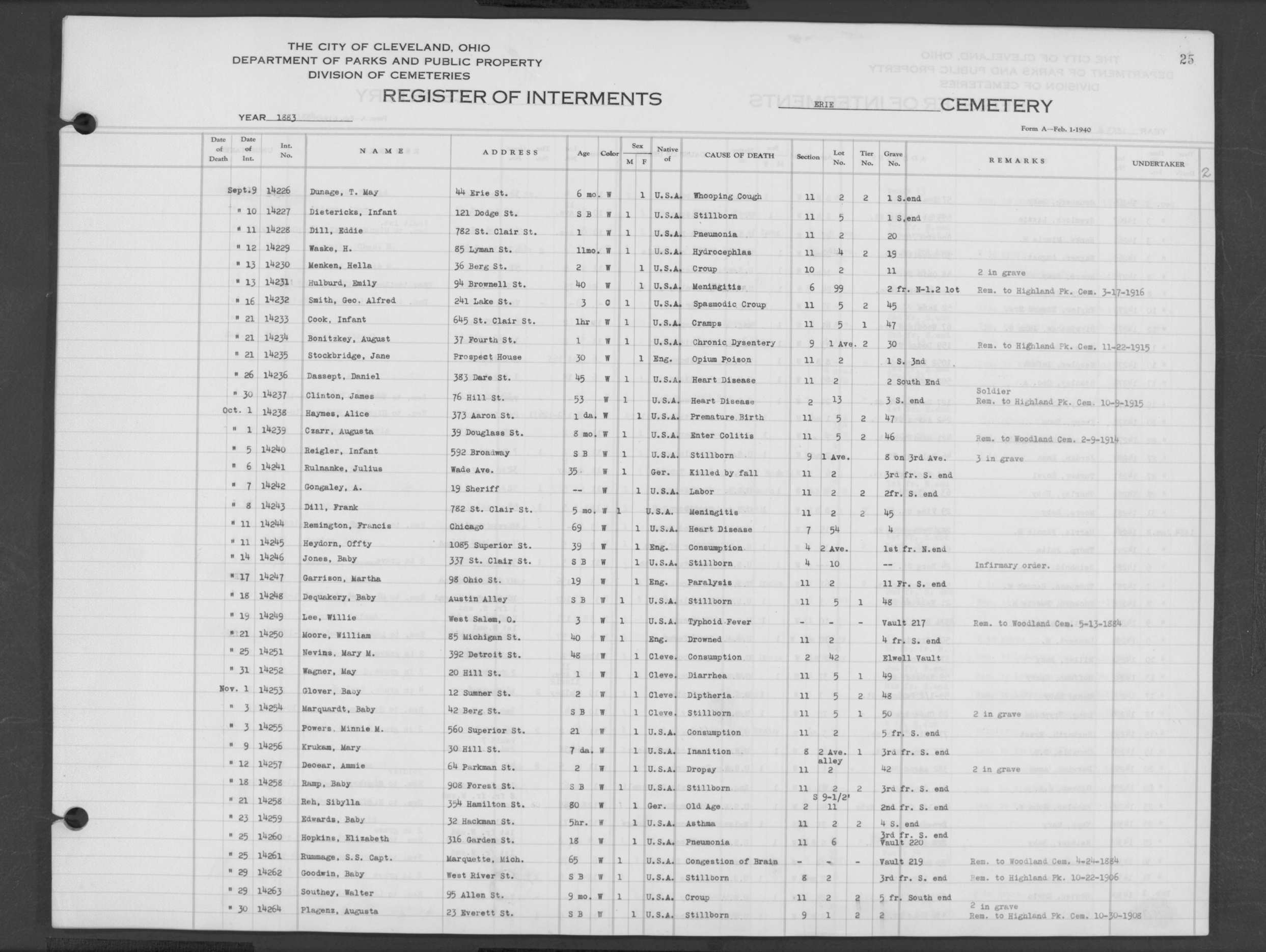 | Erie Street | 2 | 23 | Jul | 5 | 1883 | 14172 | Derning, Anna | 3m | W | F | ||||
