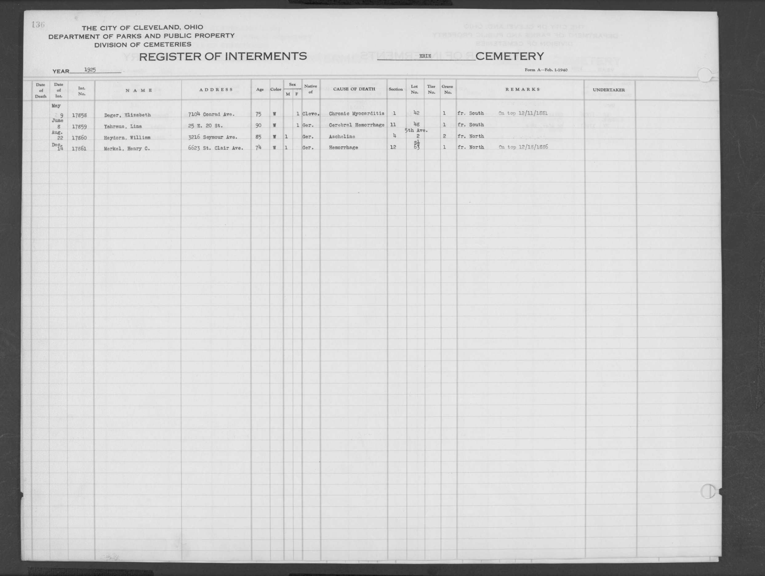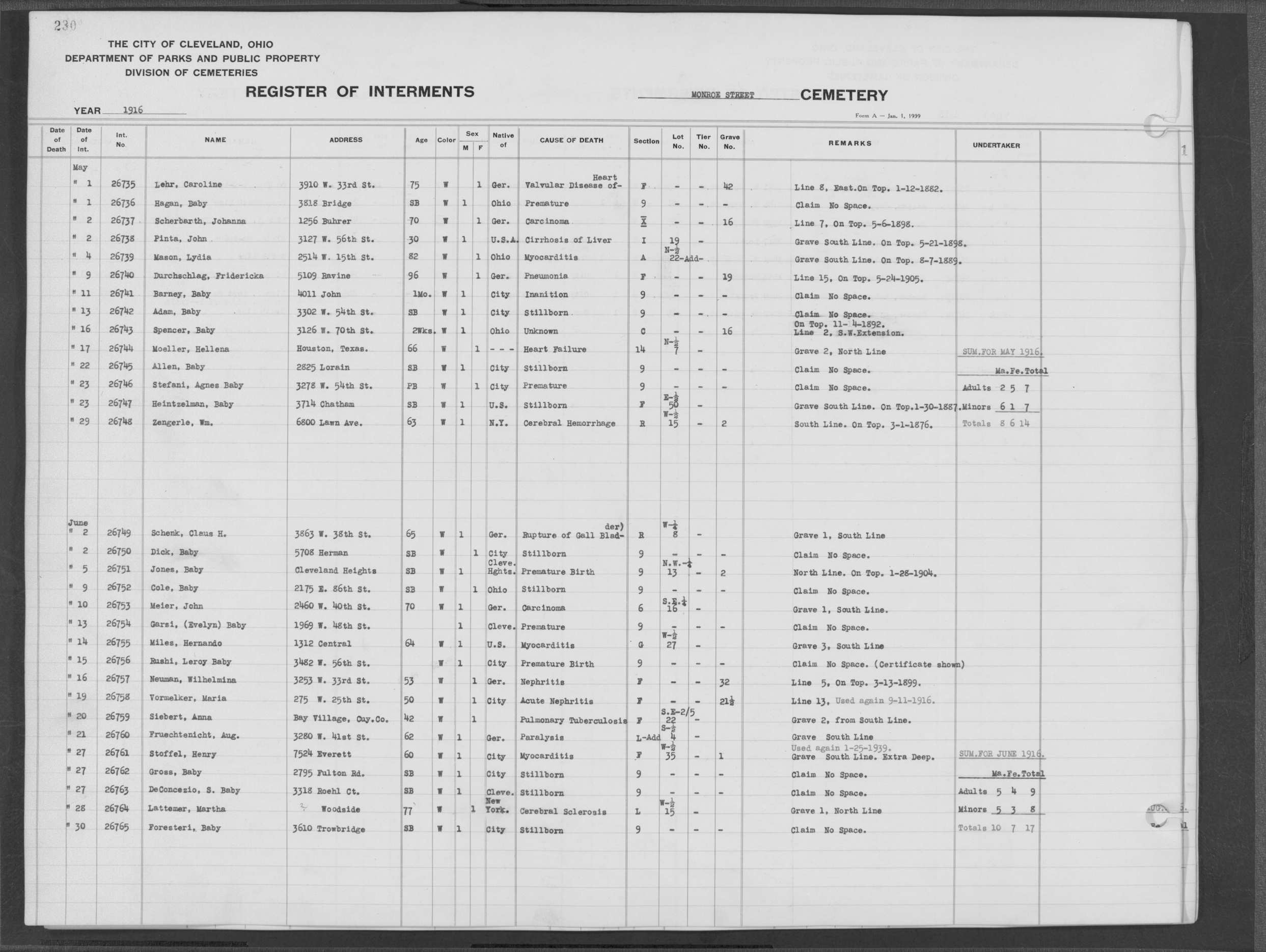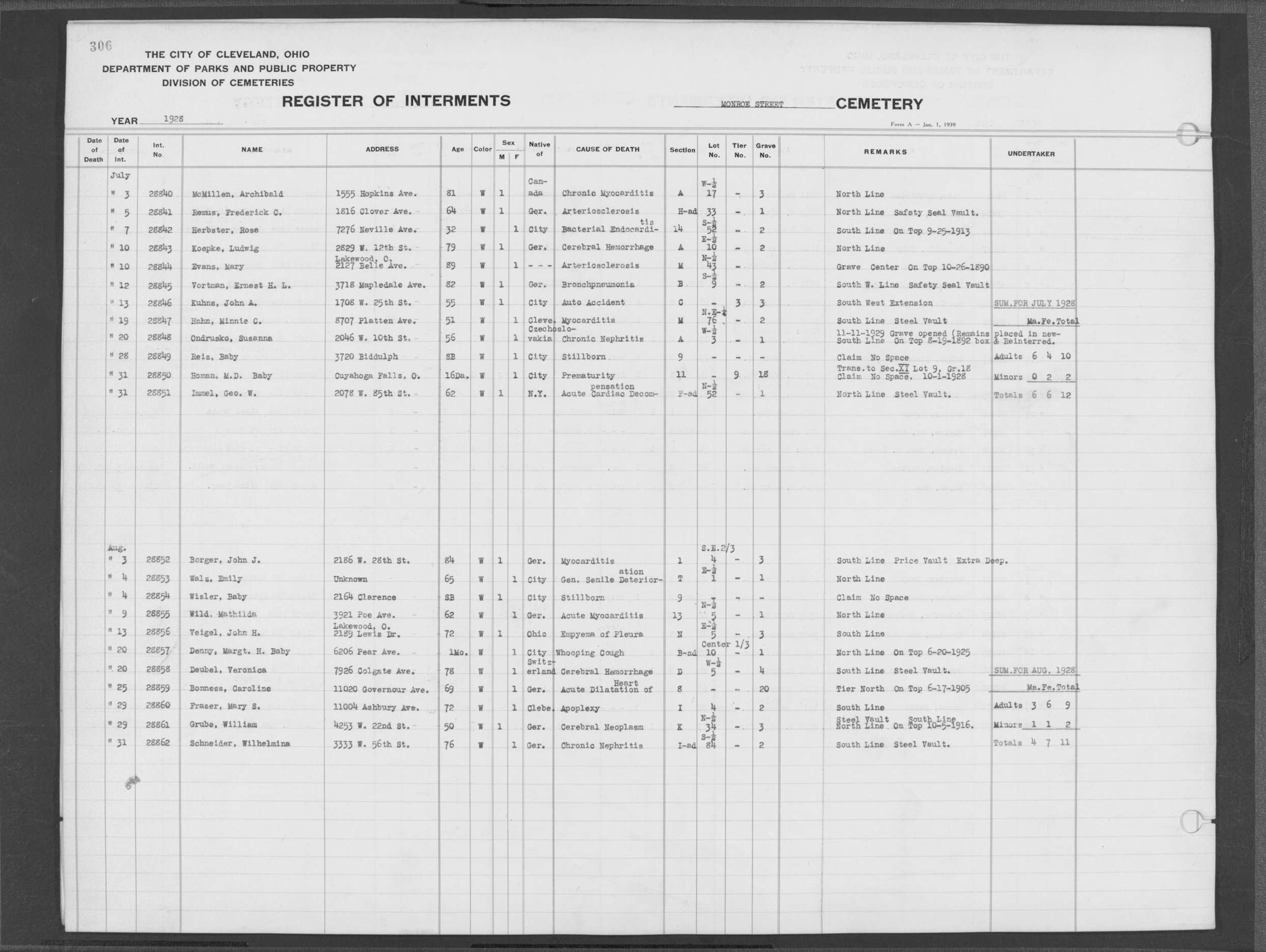| Monroe Street | 3 | 294 | May | 28 | 1926 | 28535 | Derrer, Lena | 63y | W | F | ||||