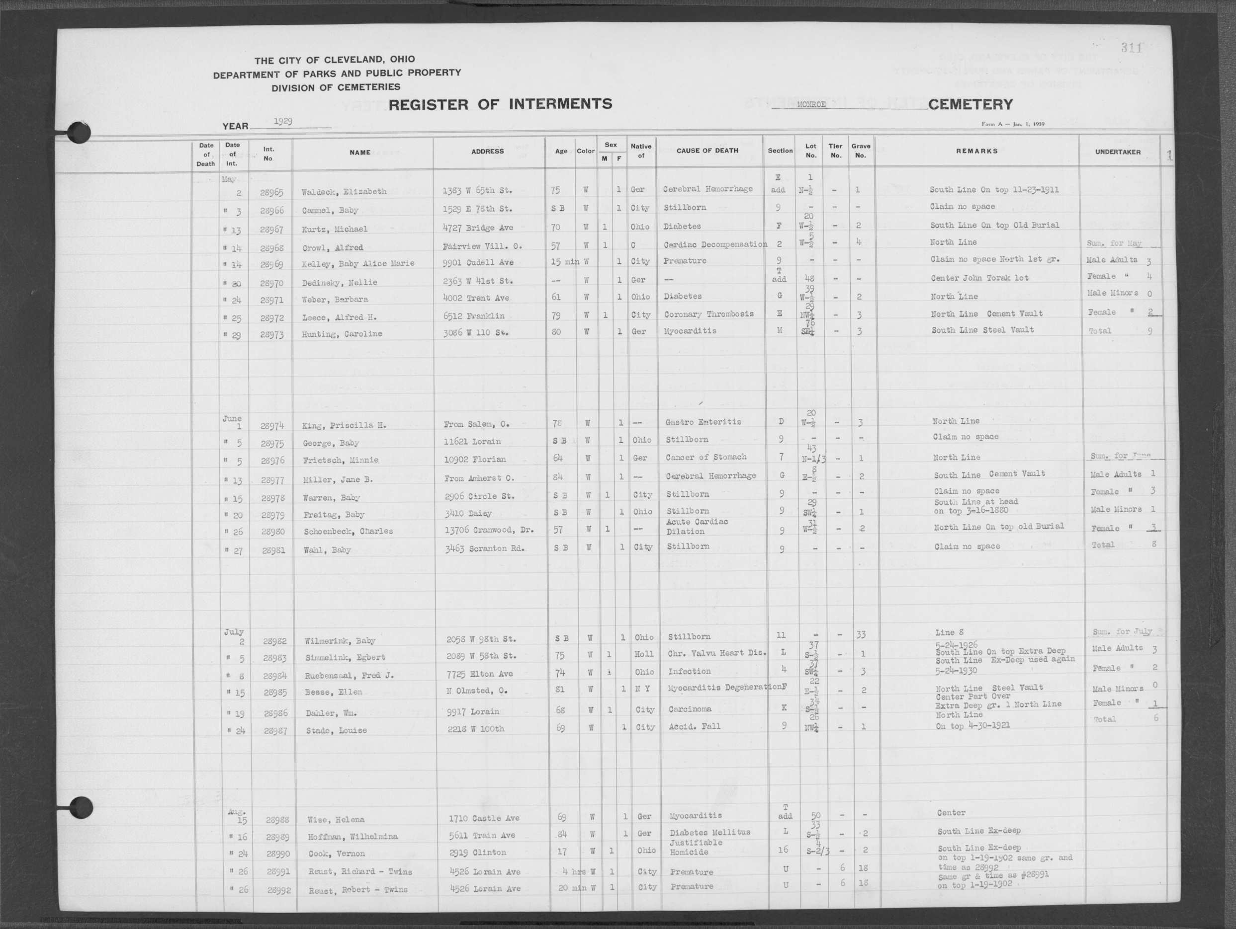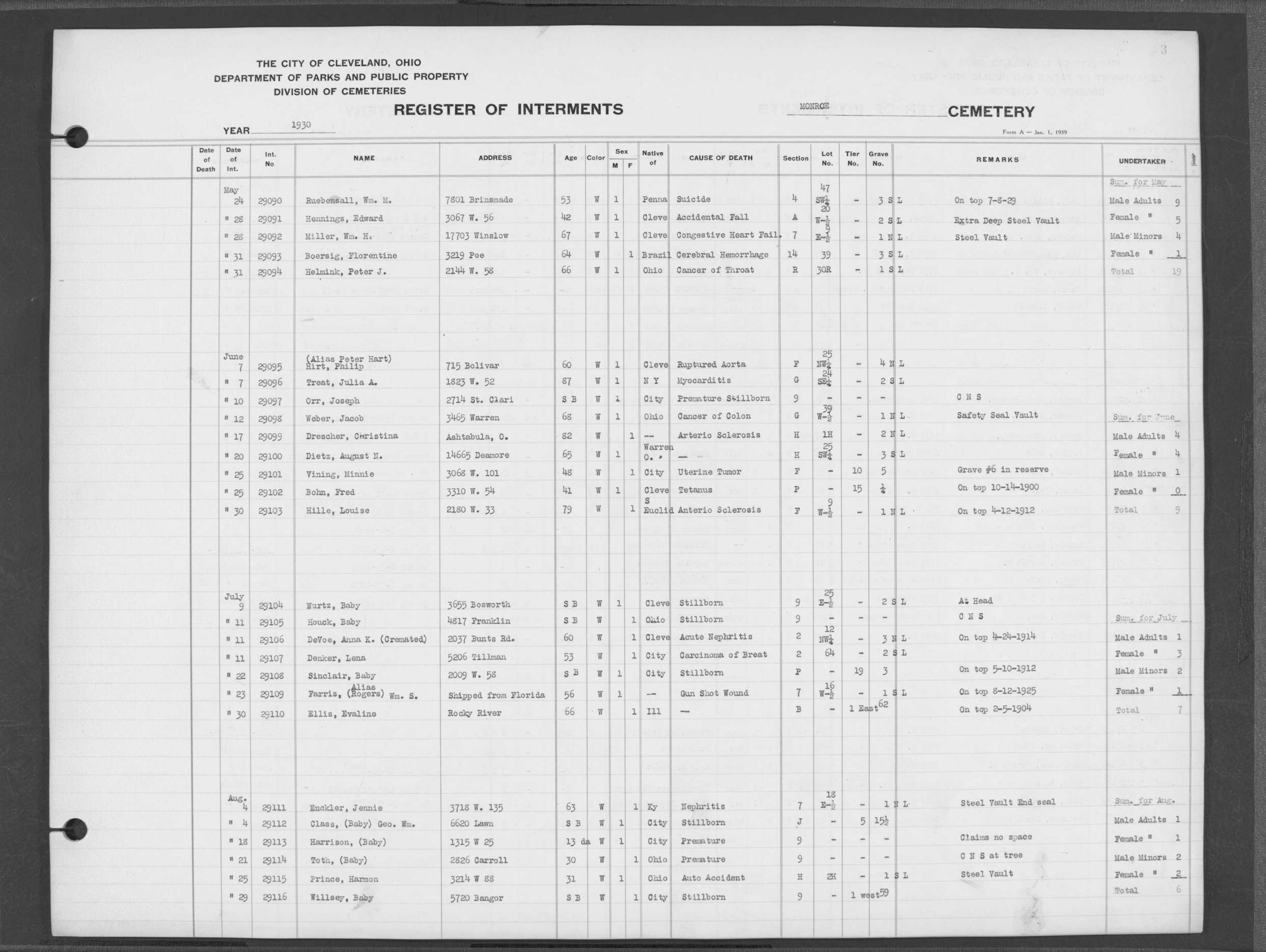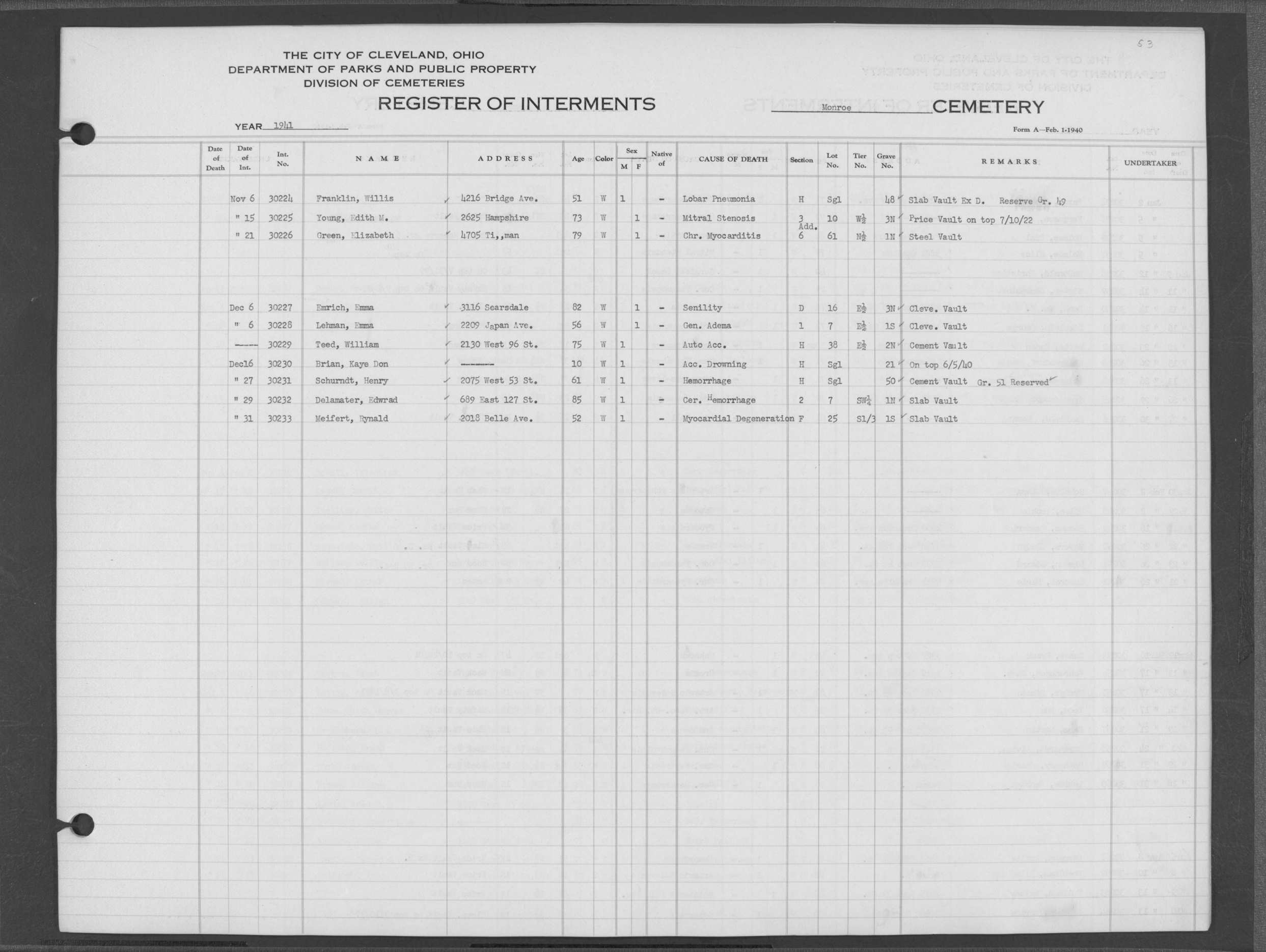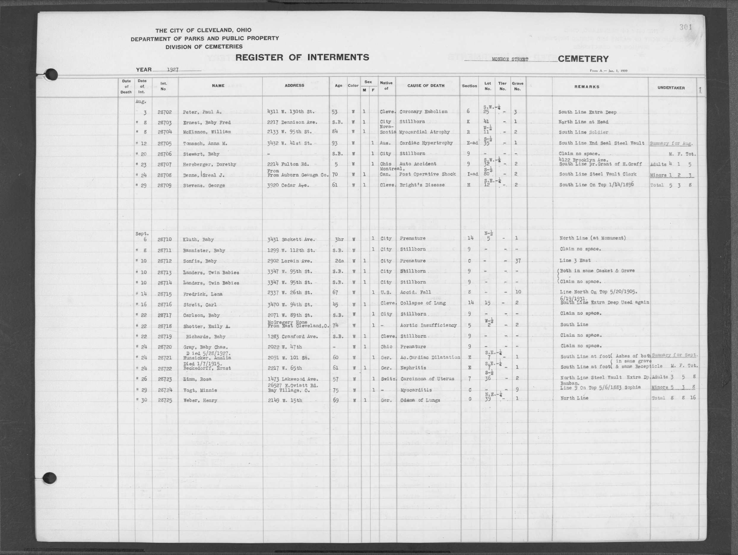 | Monroe Street | 3 | 294 | May | 28 | 1926 | 28535 | Derrer, Lena | 63y | W | F | ||||