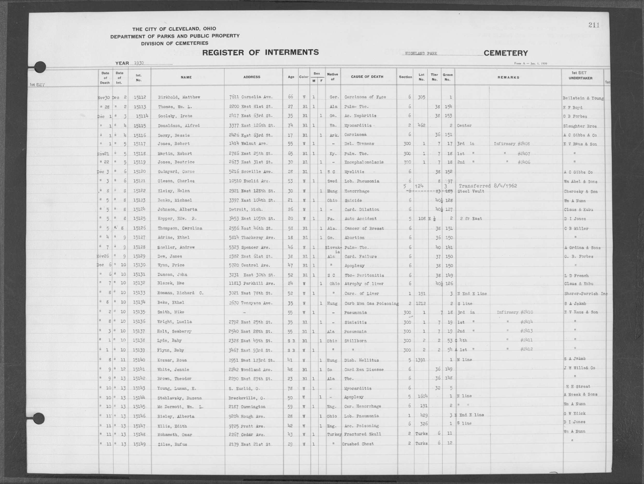 | Highland Park | 2 | 211 | Dec | 1 | 1930 | Dec | 4 | 1930 | 15116 | Derry, Bessie | 17y | B | F | |