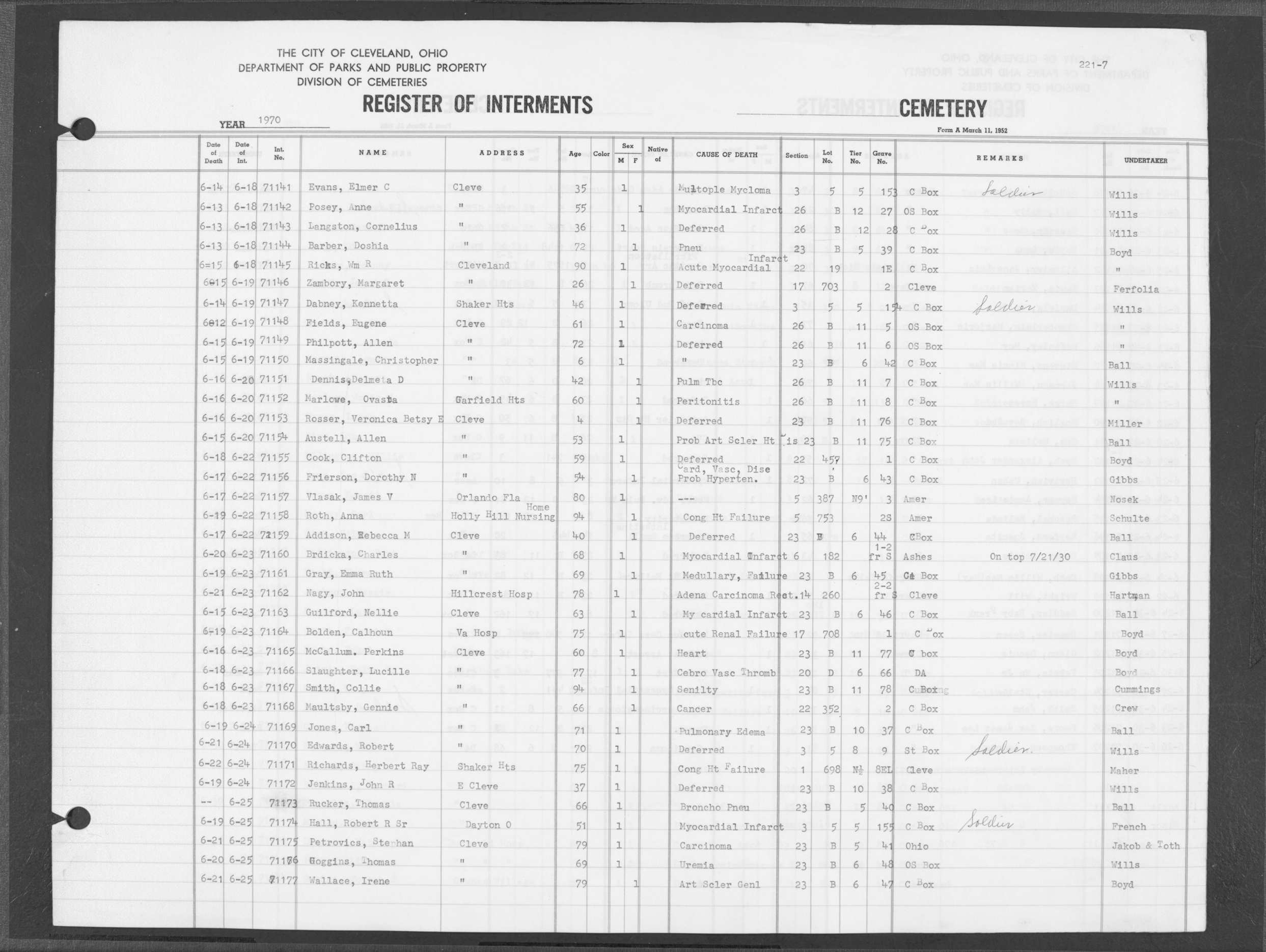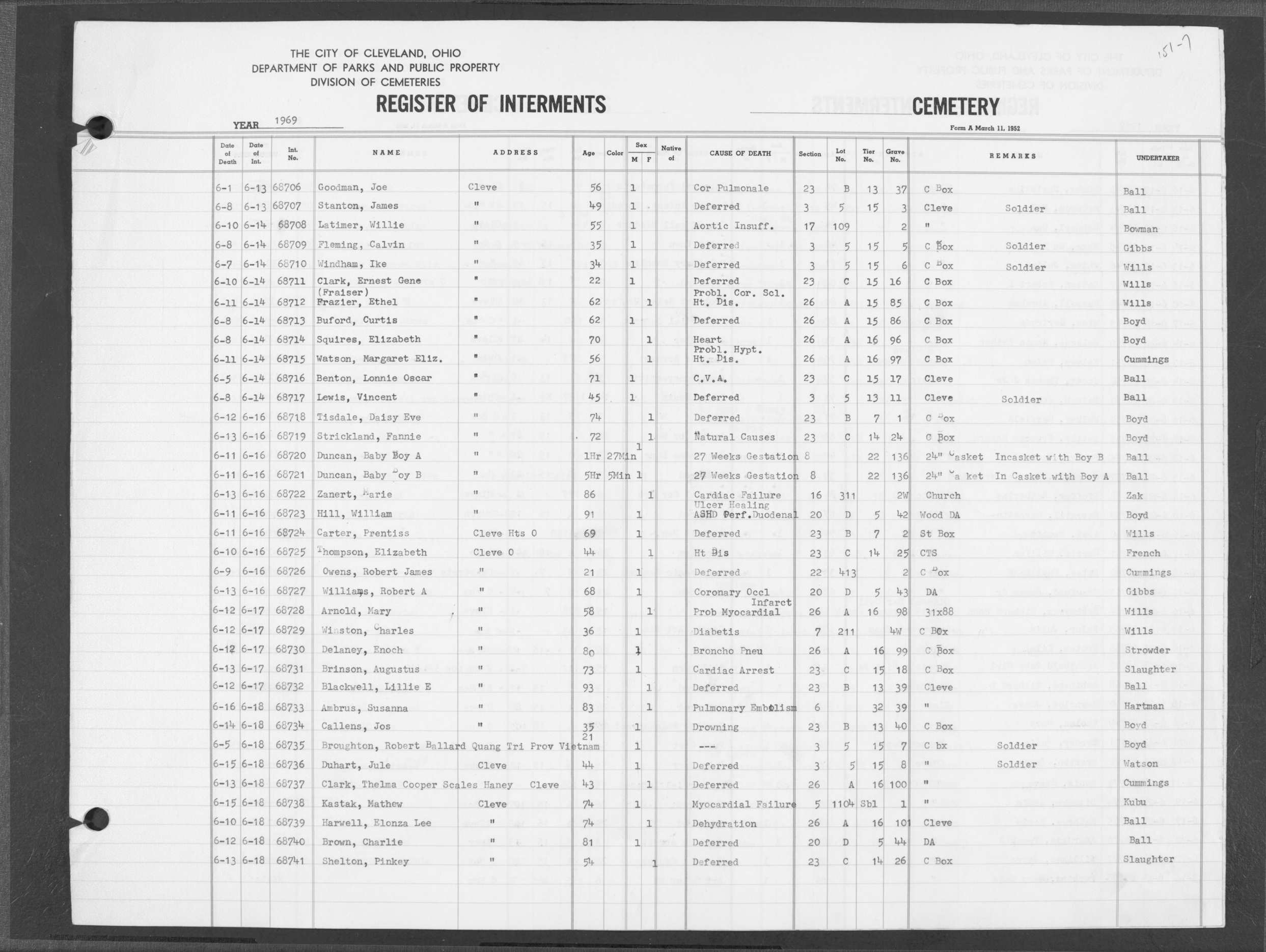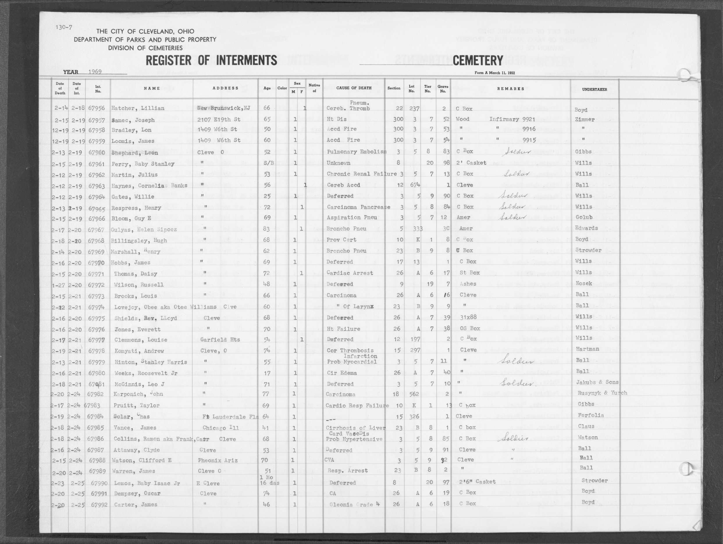 | Highland Park | 7 | 194 | Jan | 21 | 1970 | Jan | 27 | 1970 | 70198 | Derrington, Willis | 48y | M | ||