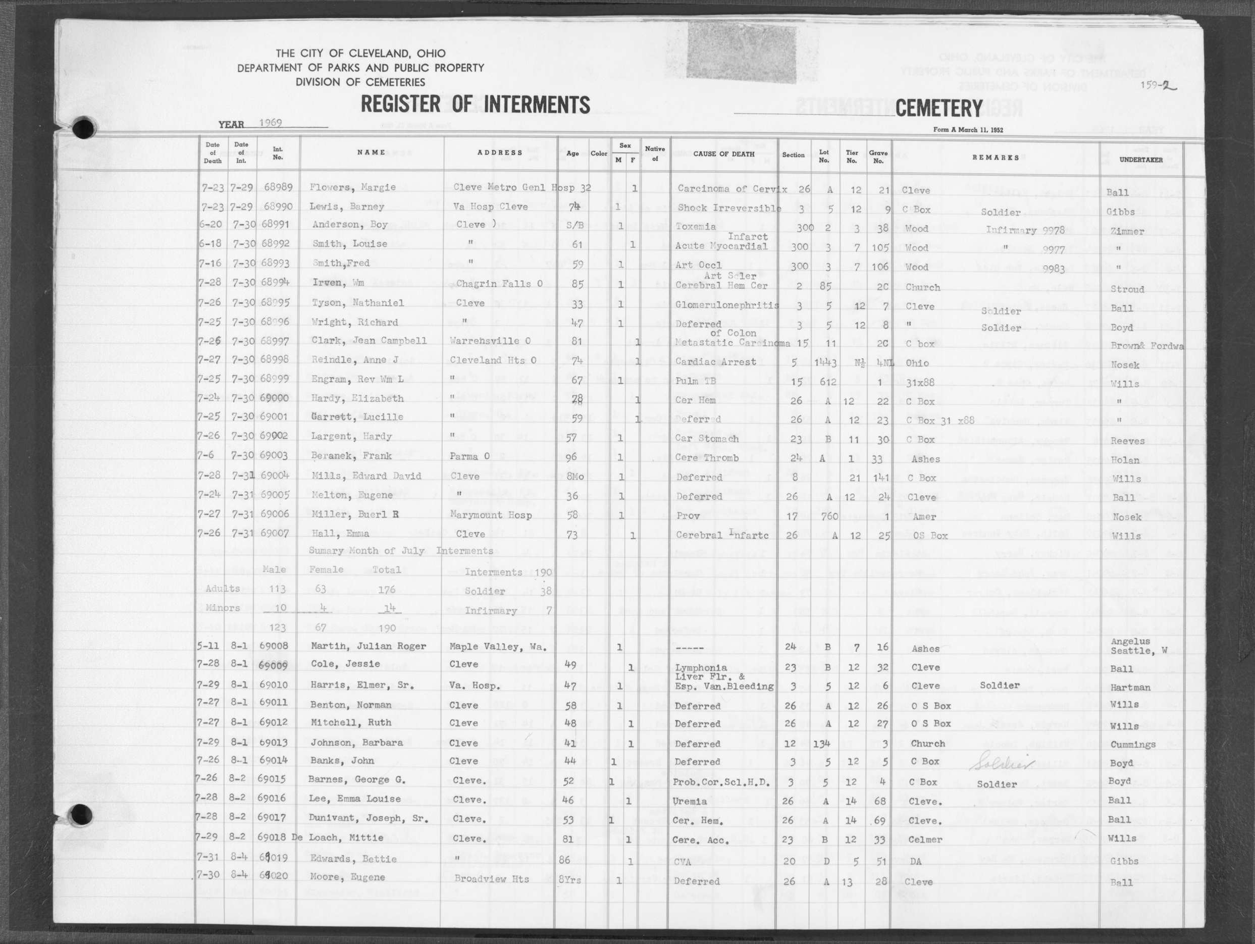 | Highland Park | 7 | 157 | Jul | 12 | 1969 | Jul | 18 | 1969 | 68924 | Derricoatte, Willie | 50y | M | ||