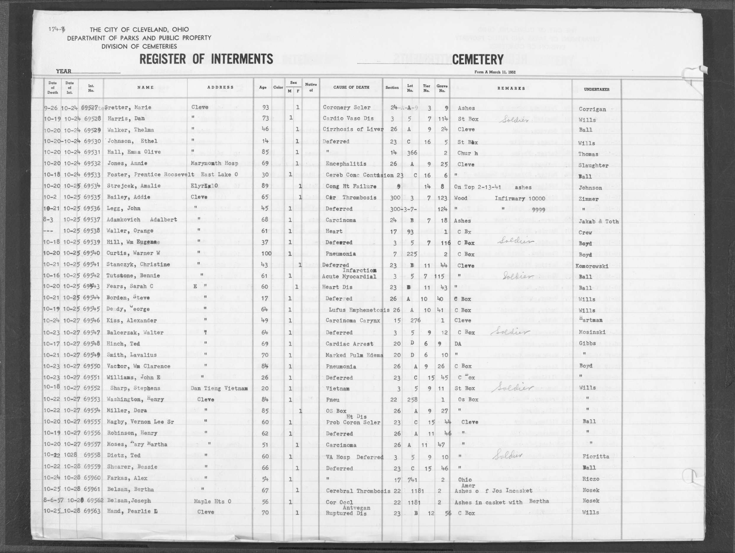 | Harvard Grove | 3 | 57 | Oct | 18 | 1926 | Oct | 21 | 1926 | 16394 | Deadwyler, Mamie | 43y | C | F | |