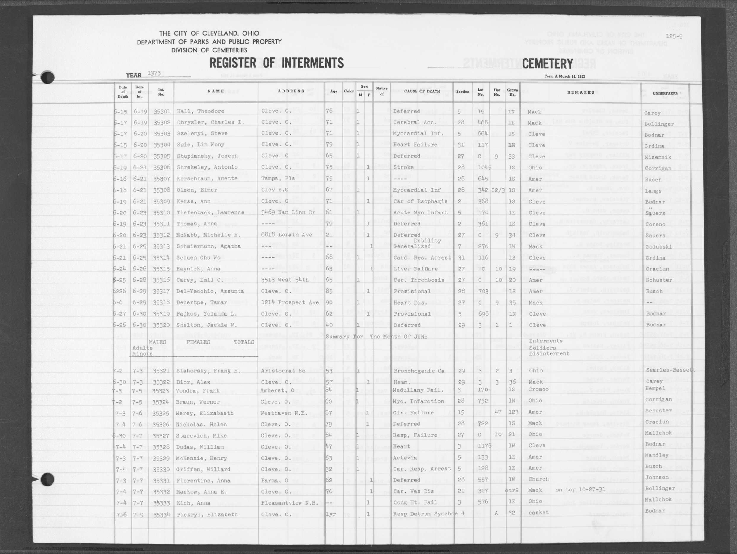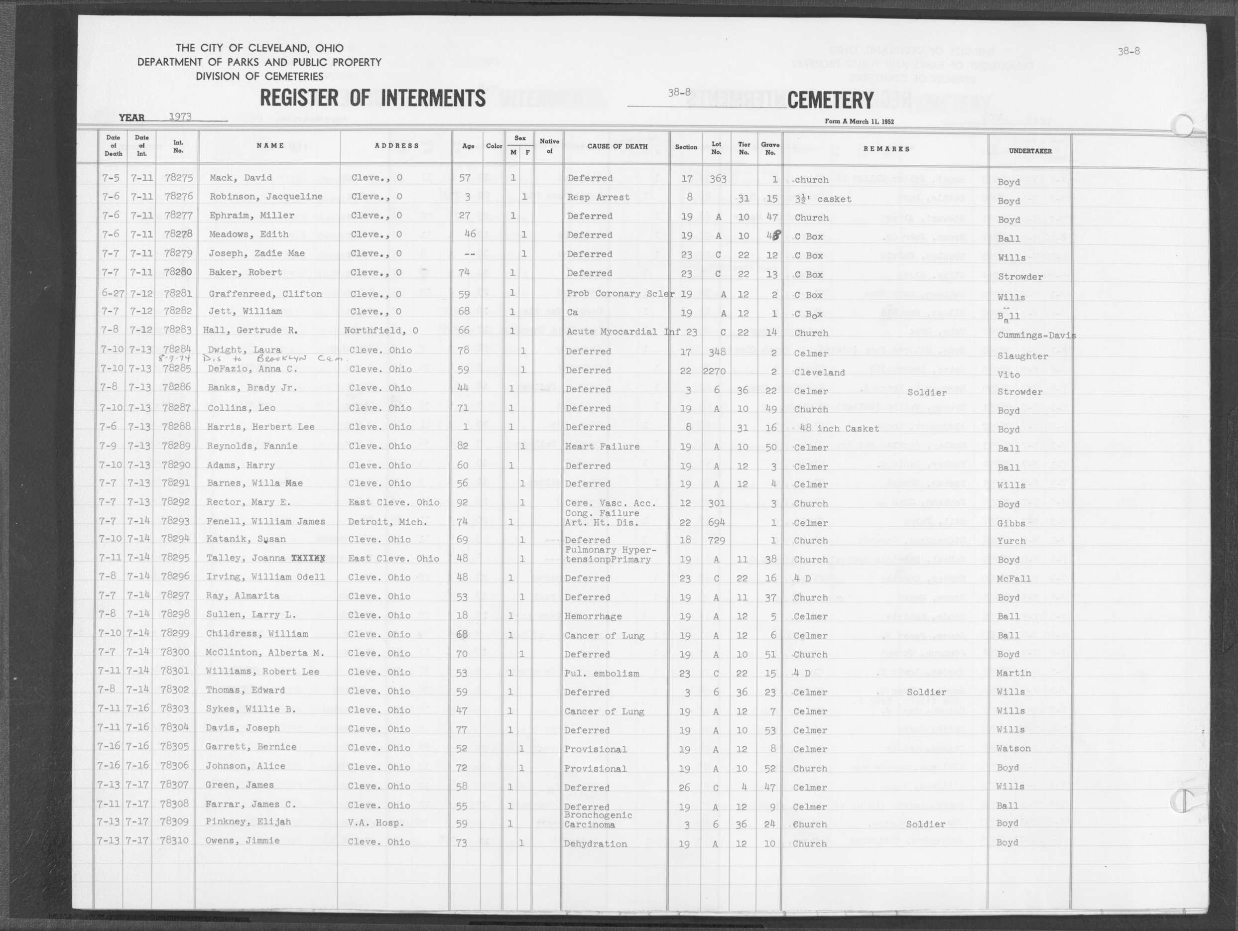 | Highland Park | 8 | 164 | May | 30 | 1975 | Jun | 4 | 1975 | 82589 | Deadwiler, Henry L | 70y | M | ||