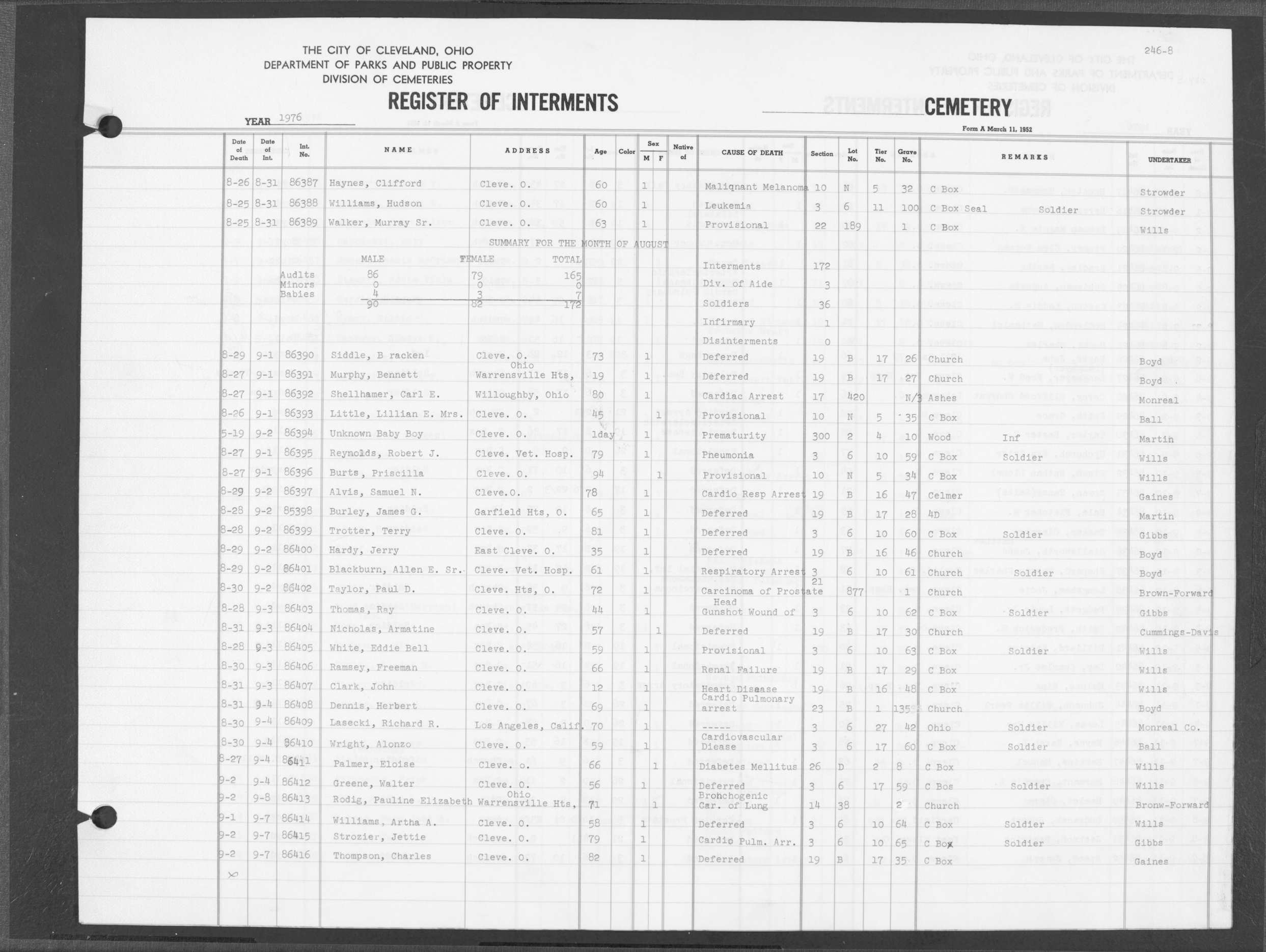 | Highland Park | 8 | 237 | Jul | 8 | 1976 | Jul | 10 | 1976 | 85098 | Derrett, Thomas W | 61y | M | ||