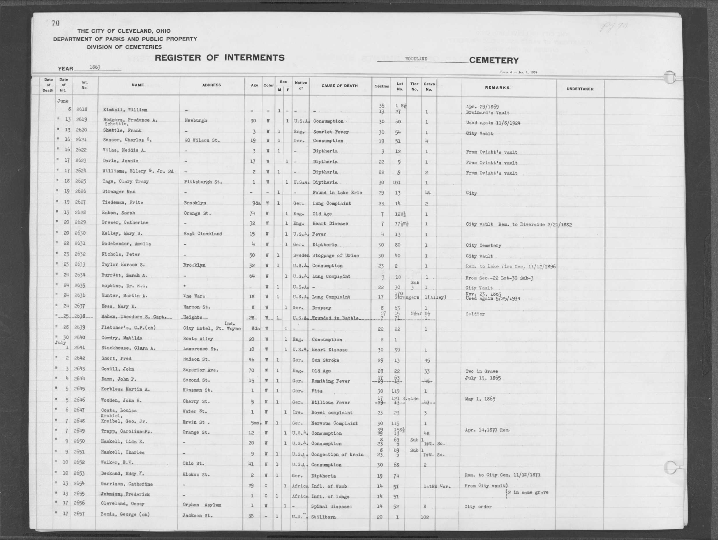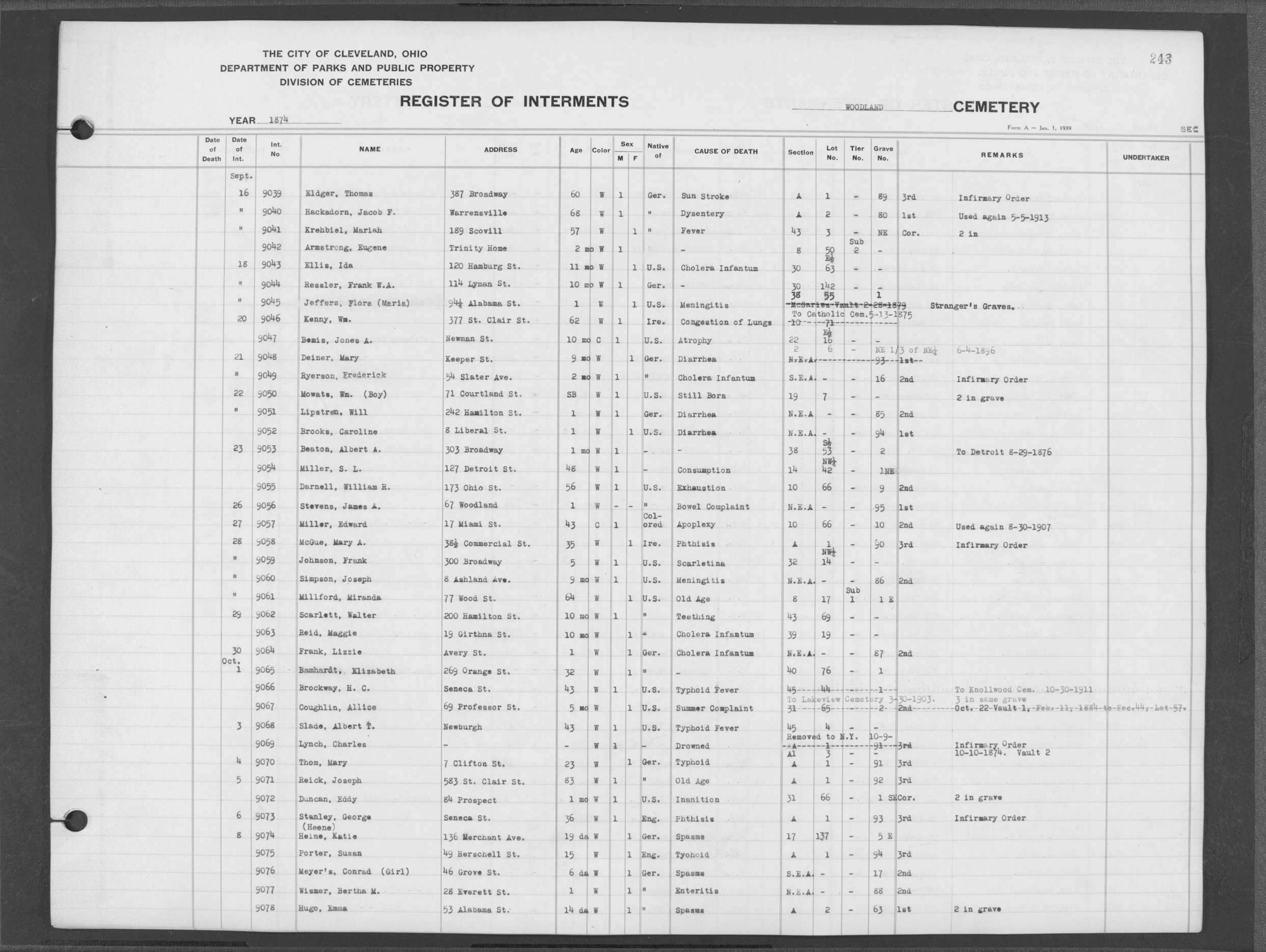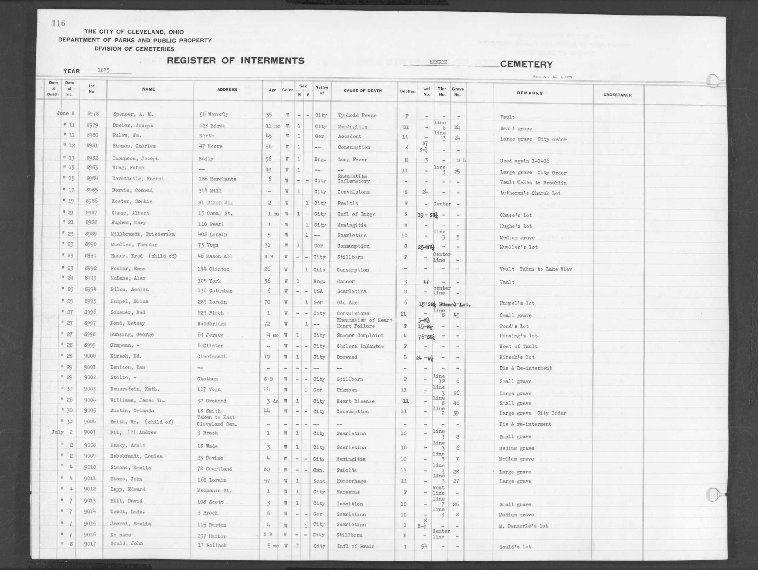 | Monroe Street | 1 | 107 | Oct | 19 | 1874 | 8691 | Derrer, Rose | 54y | ||||||
