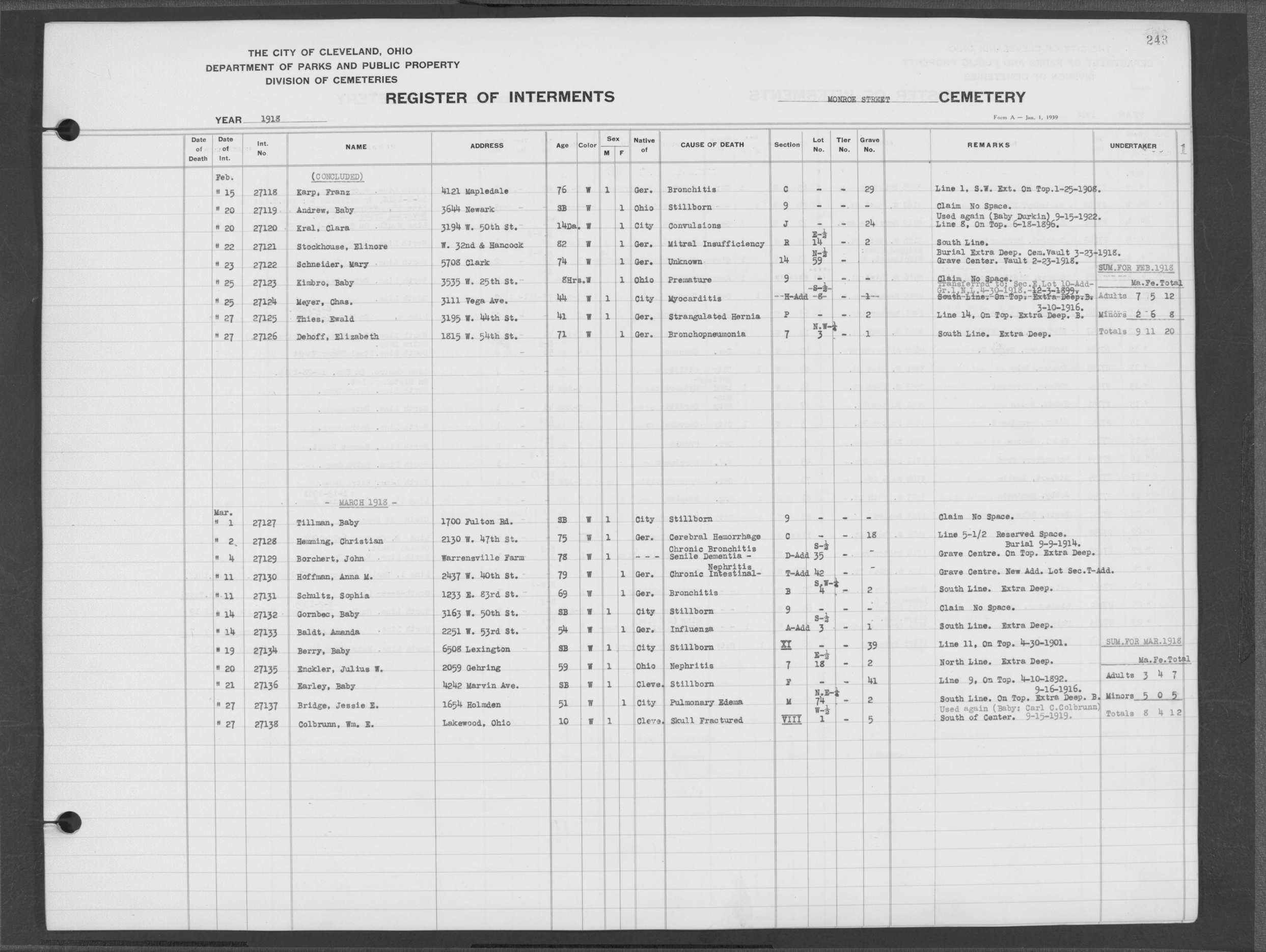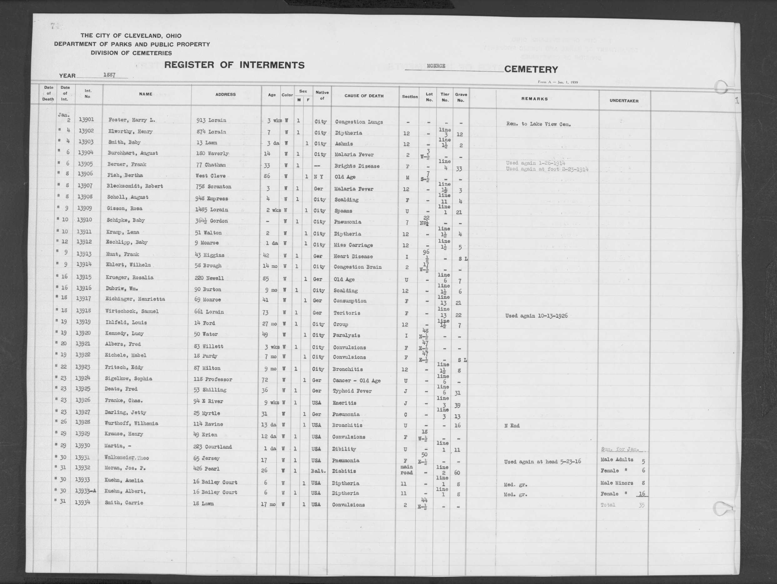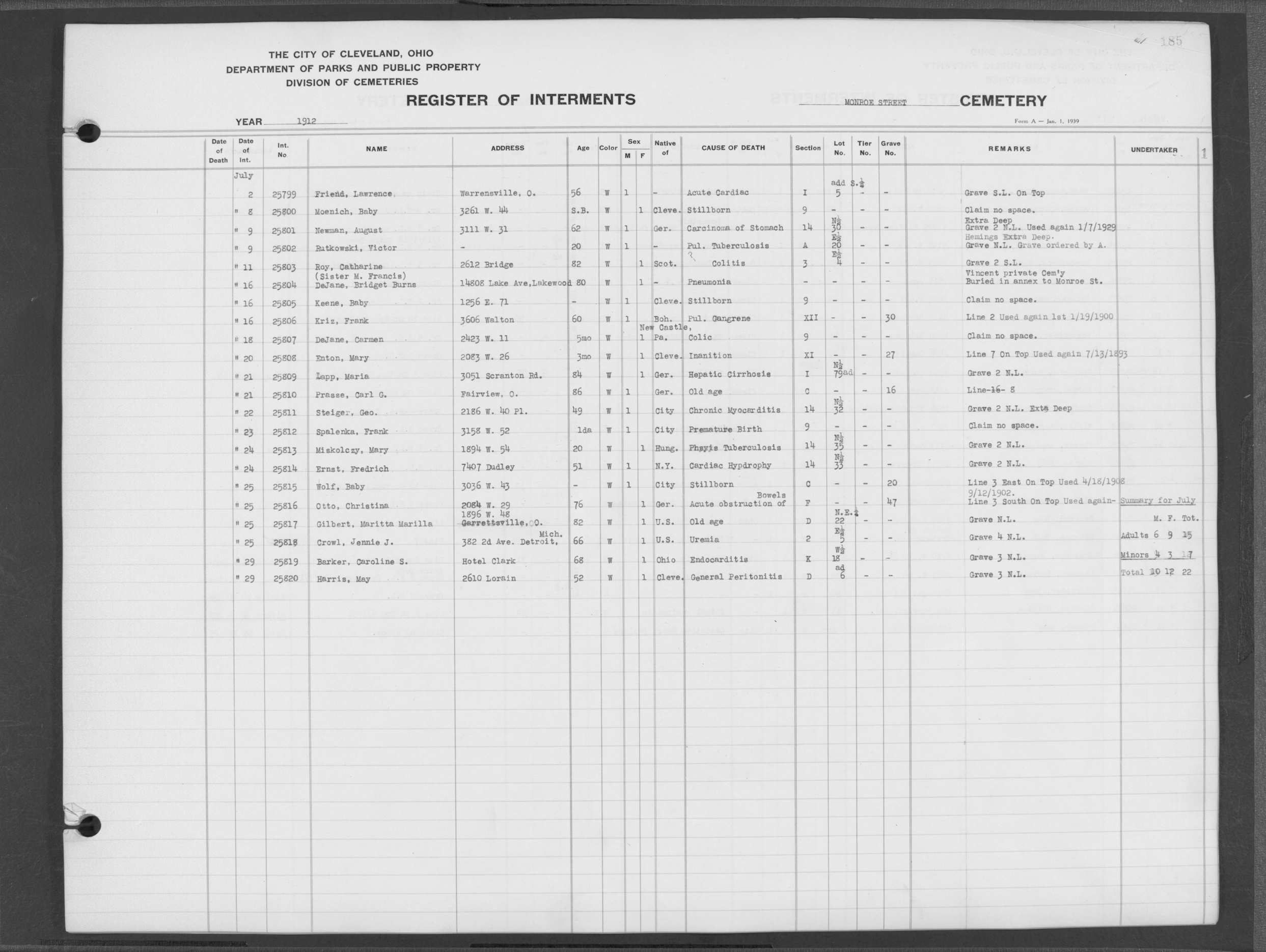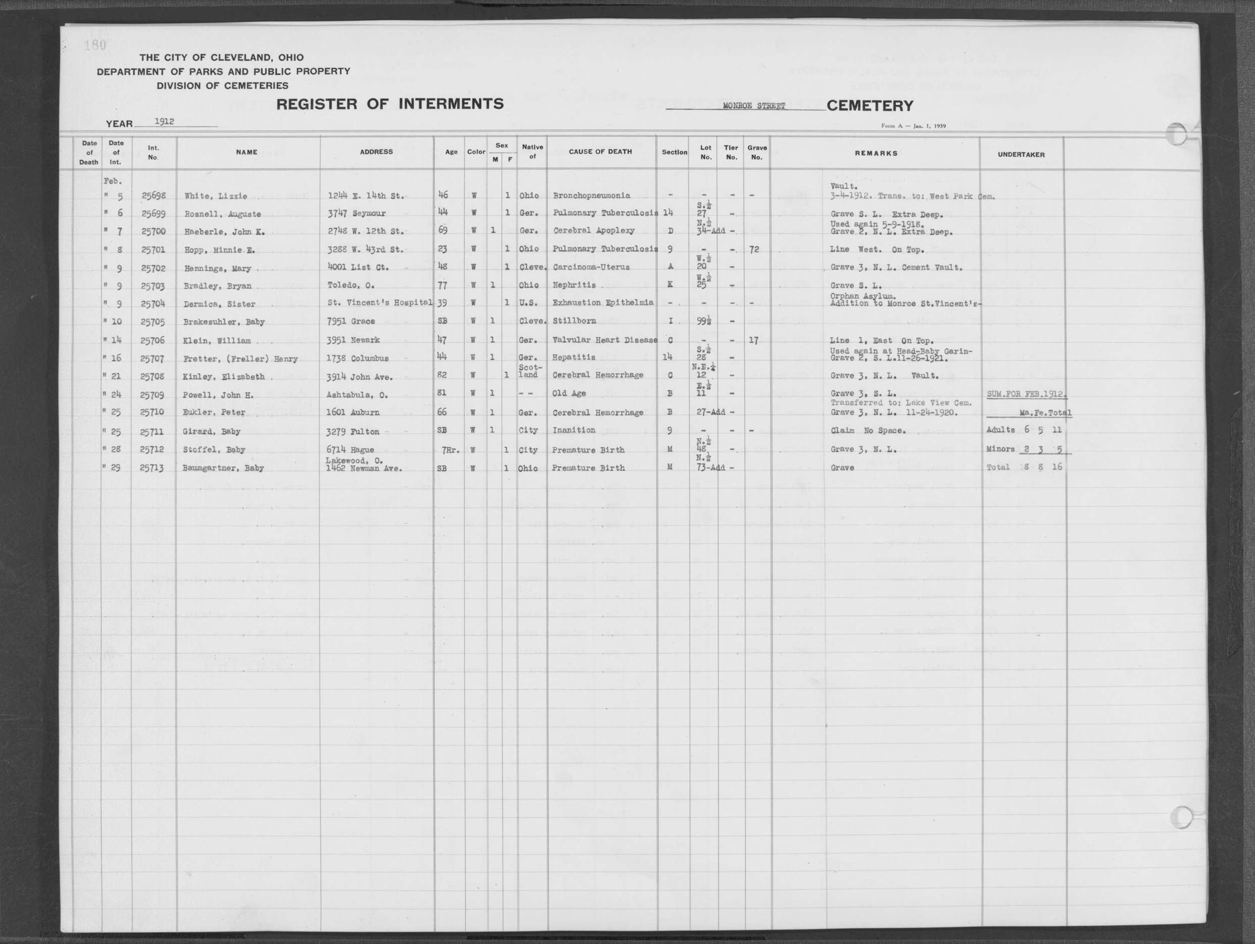 | Monroe Street | 3 | 180 | Feb | 9 | 1912 | 25704 | Dermica, Sister | 39y | W | F | ||||