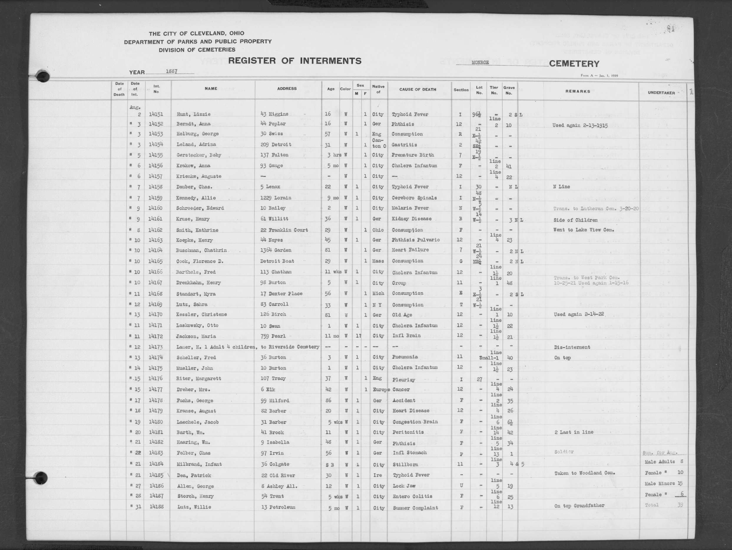 | Monroe Street | 2 | 81 | Aug | 21 | 1887 | 14185 | Dea, Patrick | 30y | W | M | ||||