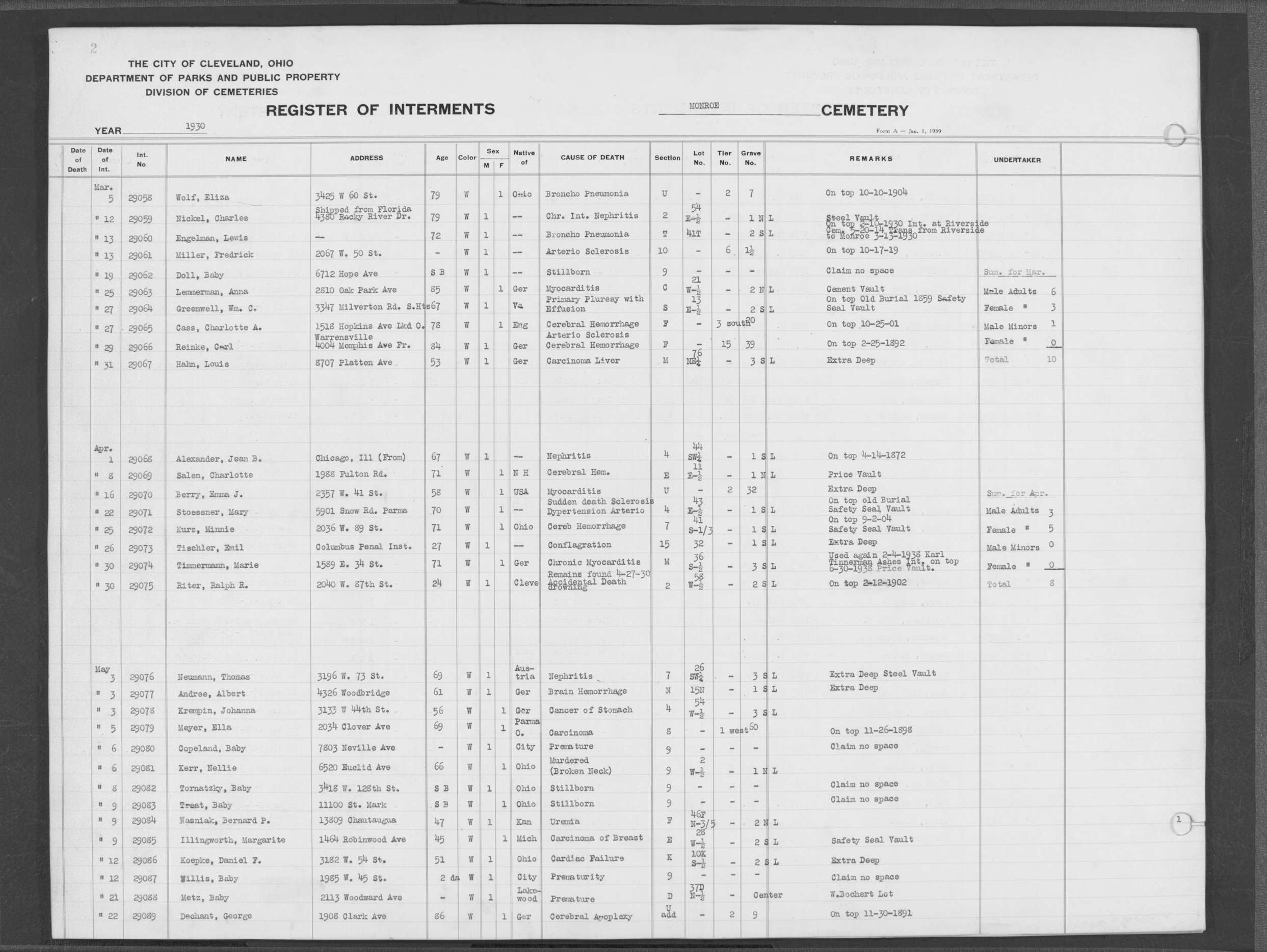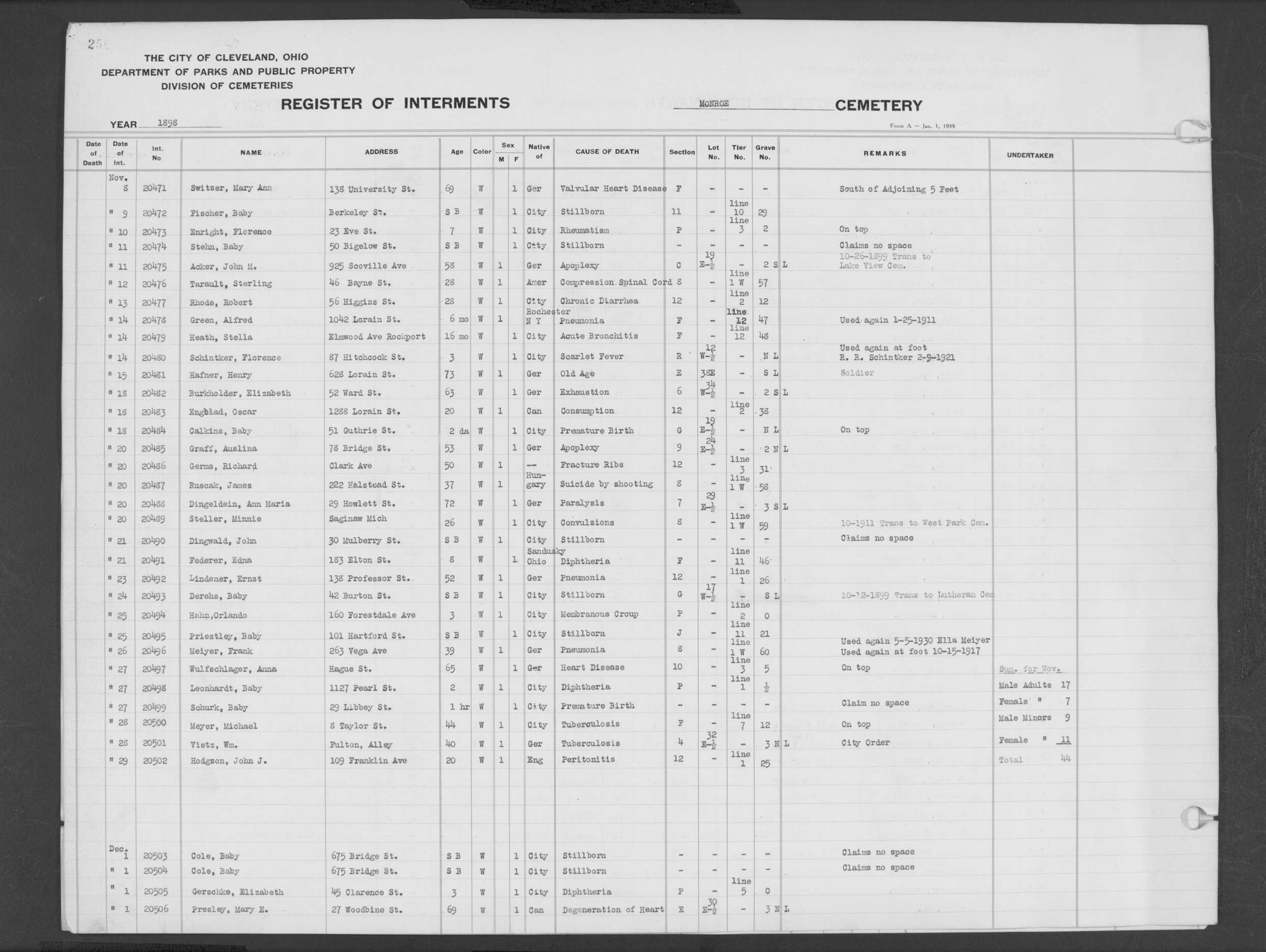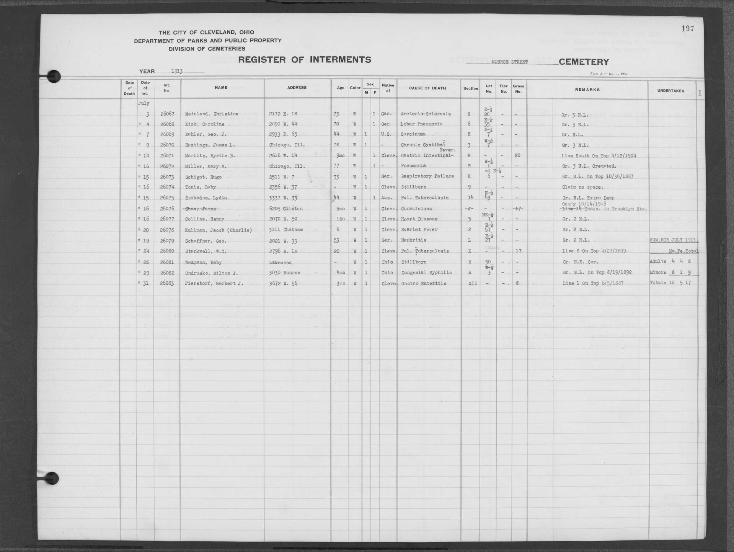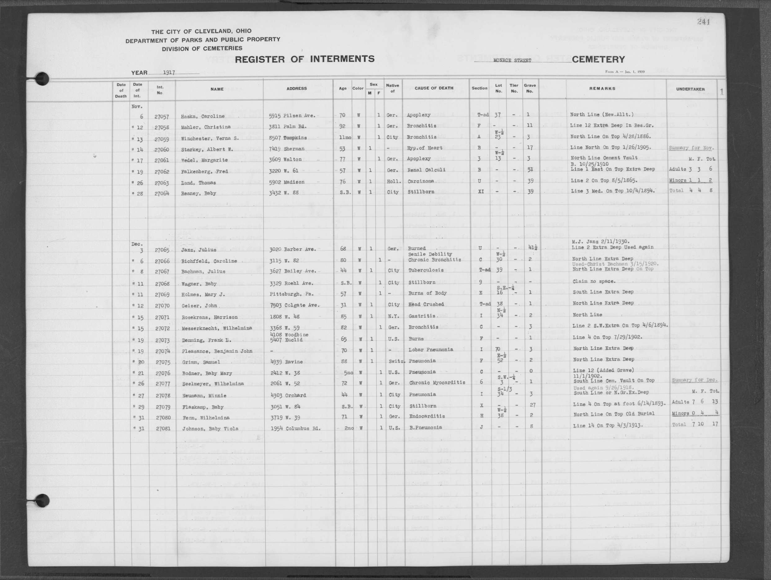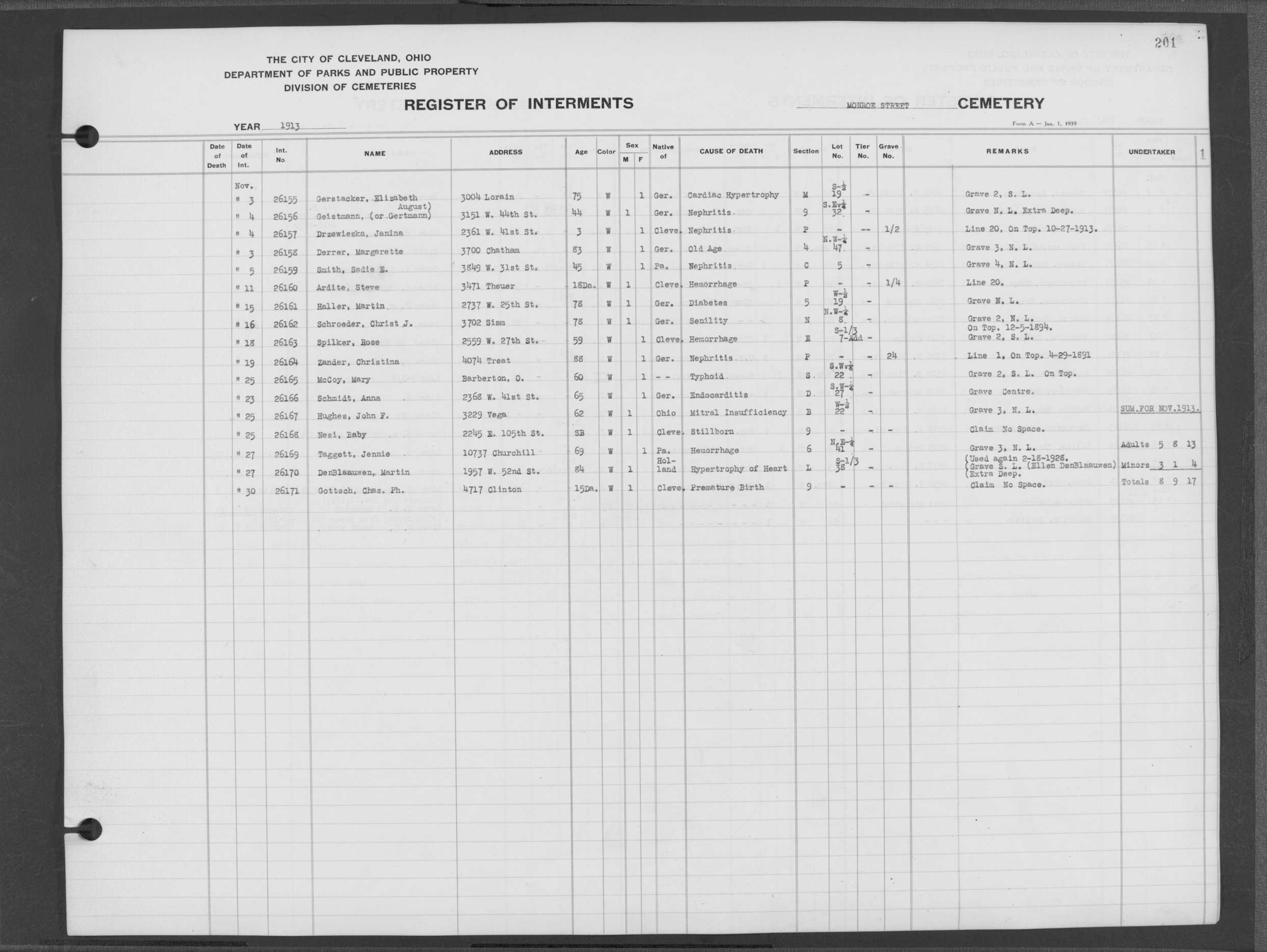 | Monroe Street | 3 | 201 | Nov | 3 | 1913 | 26158 | Derrer, Margarette | 83y | W | F | ||||