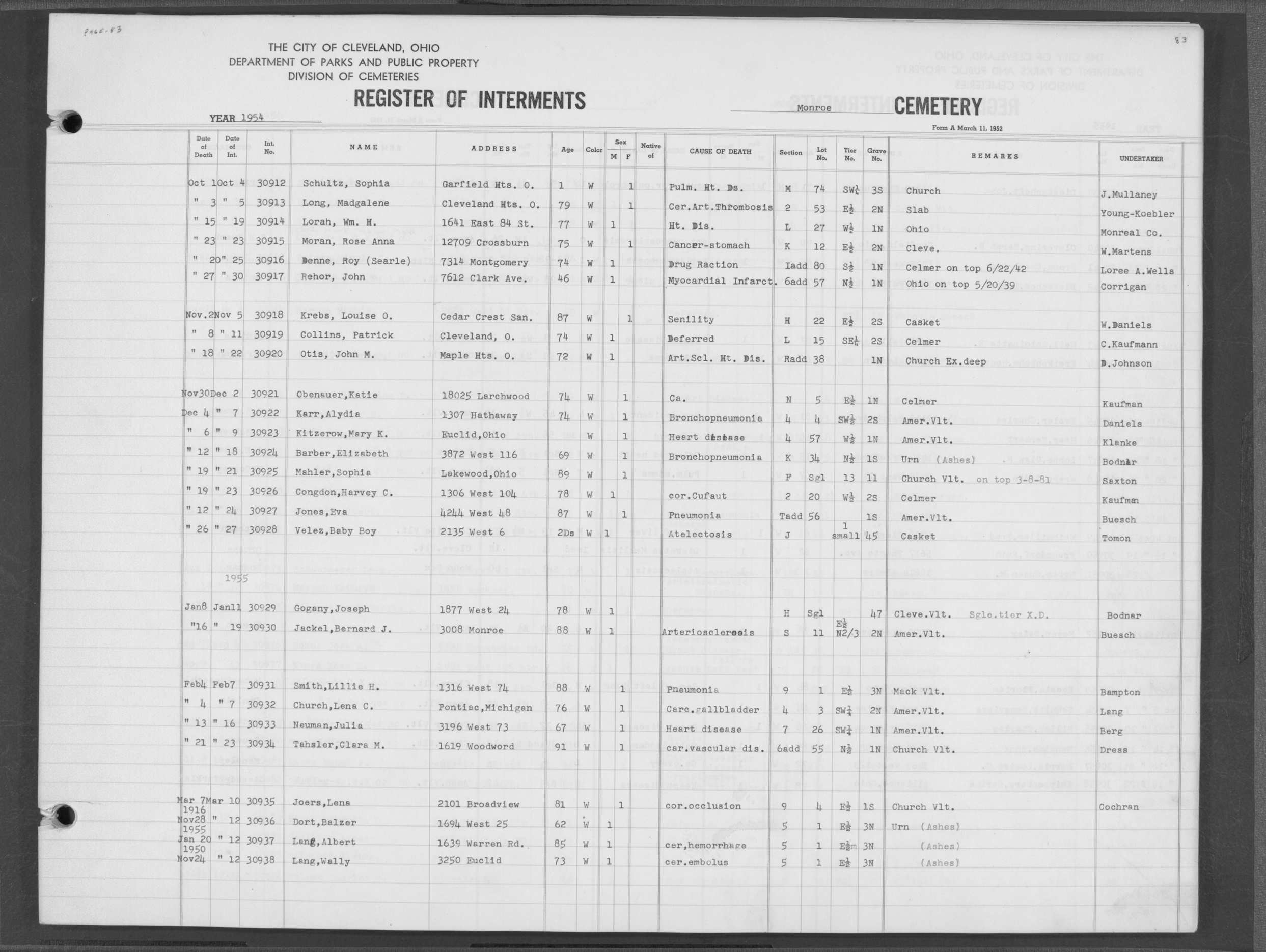 | West Park | 4 | 75 | Nov | 17 | 1955 | Nov | 19 | 1955 | 24590 | Deal, Harry | 62y | W | M | |