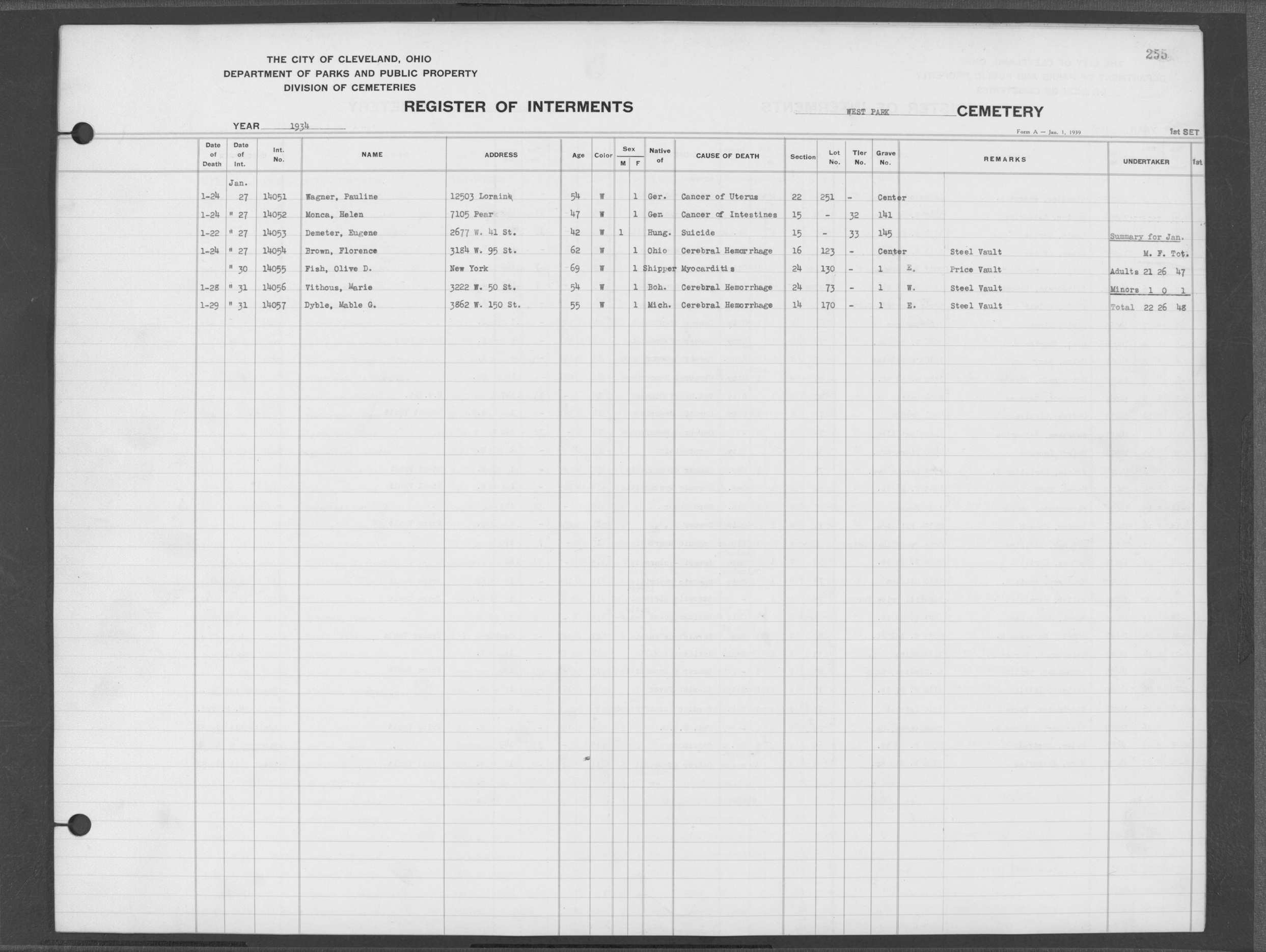 | West Park | 2 | 258 | Apr | 4 | 1934 | Apr | 7 | 1934 | 14142 | Derrer, Elizabeth | 74y | W | F | |
