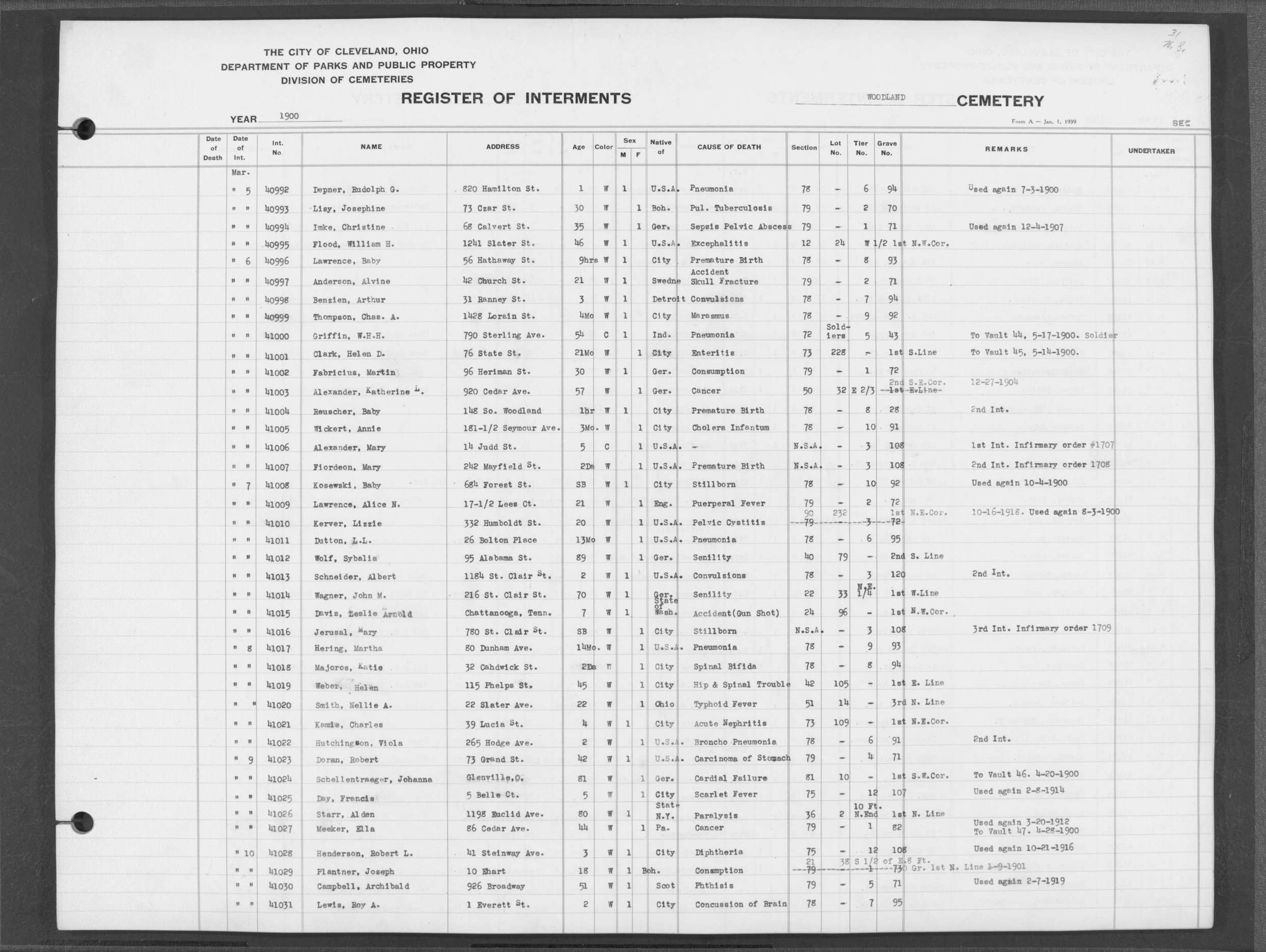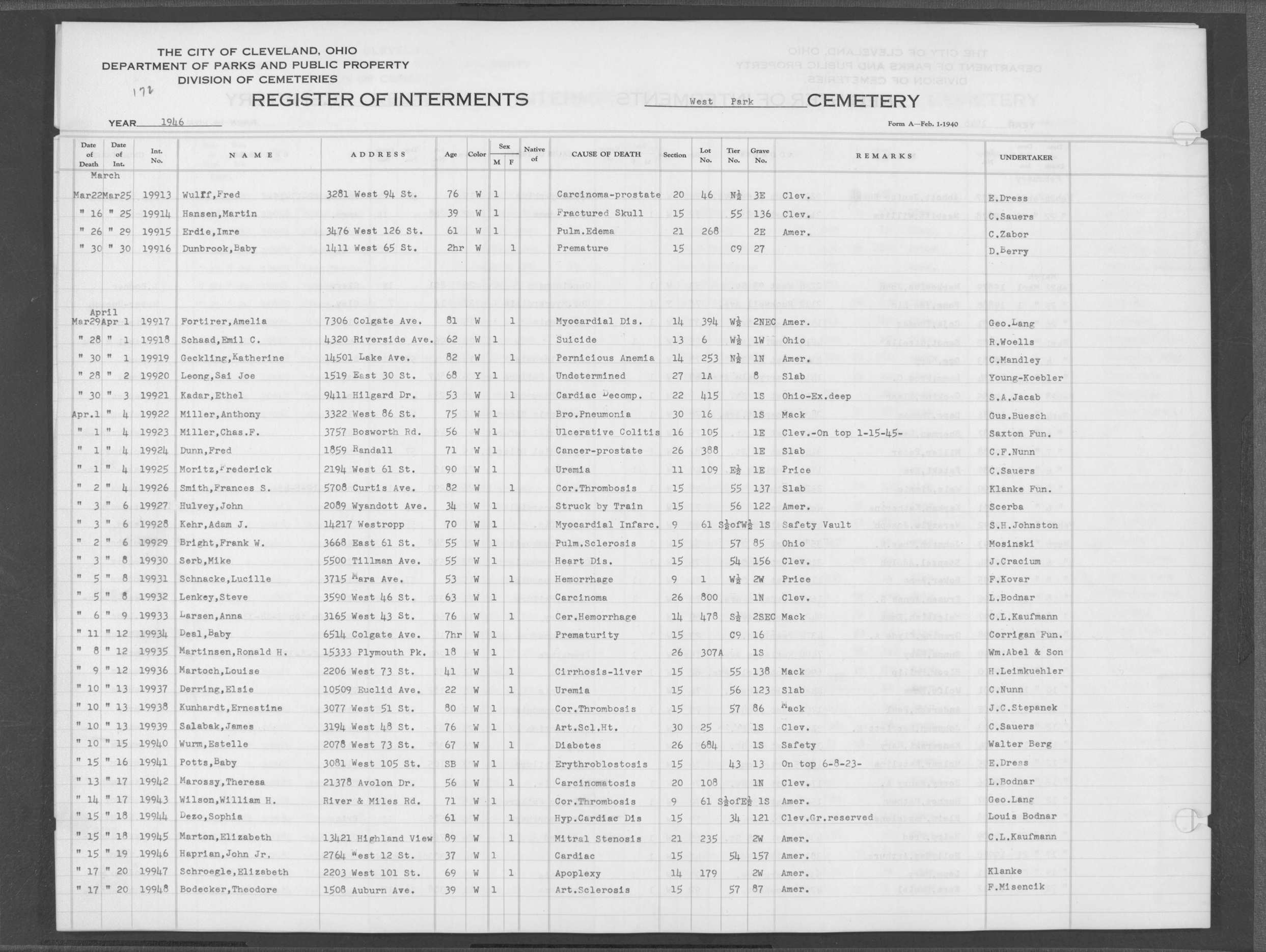 | West Park | 1 | 196 | Feb | 25 | 1920 | 6531 | Deam, Eugene | 36y | W | M | ||||