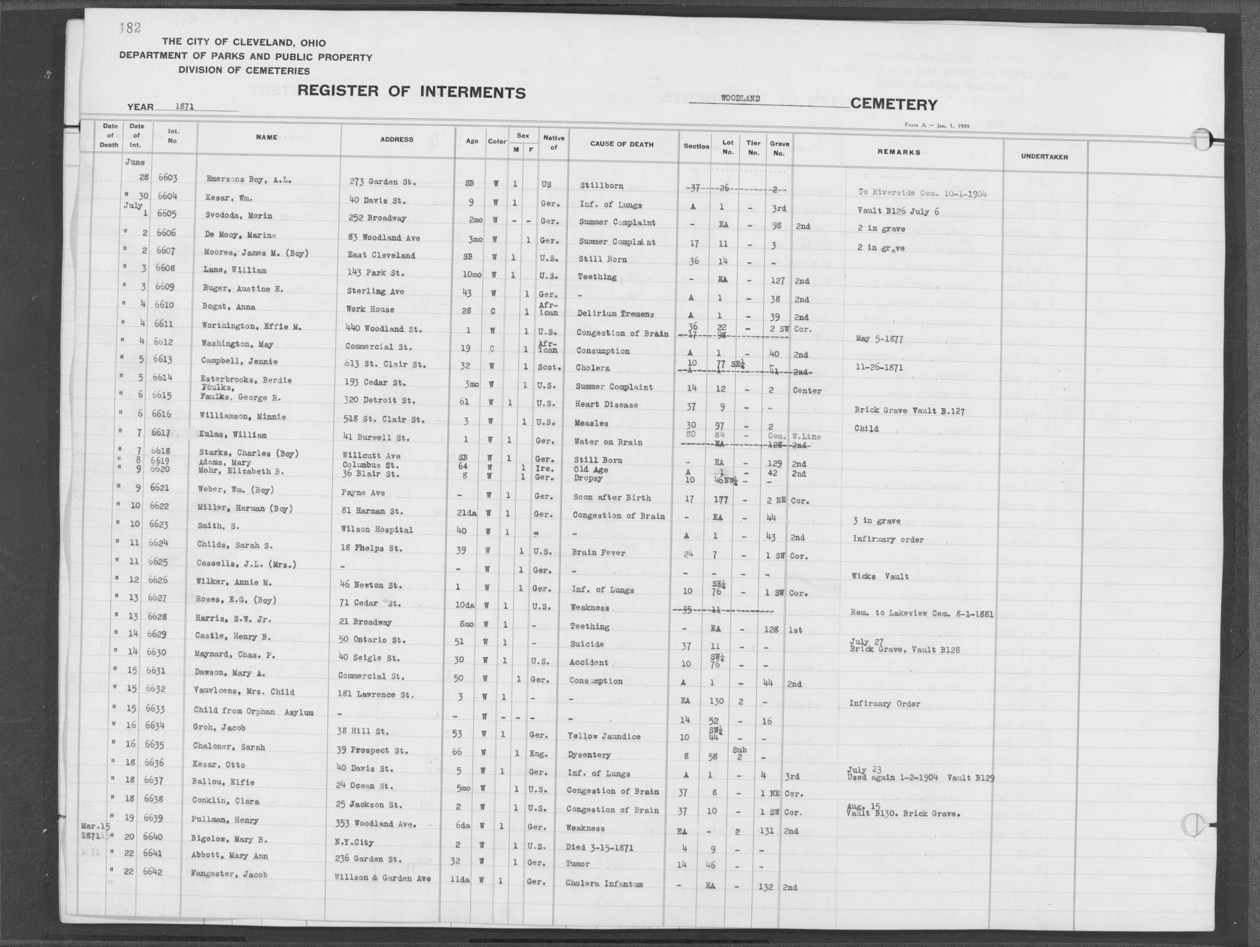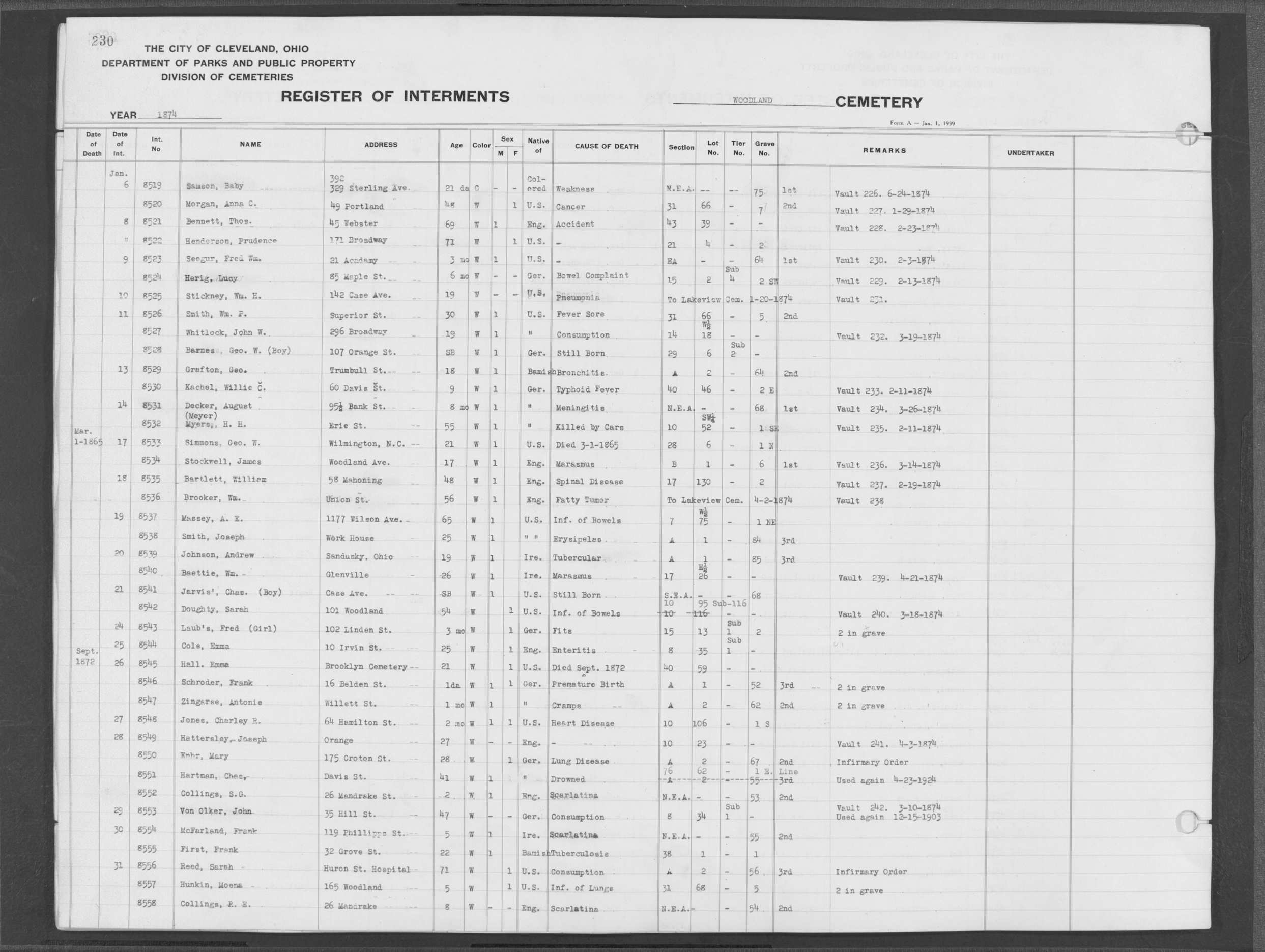 | Monroe Street | 1 | 107 | Oct | 16 | 1874 | 8685 | Derrer, Mary | 18y | W | F | ||||