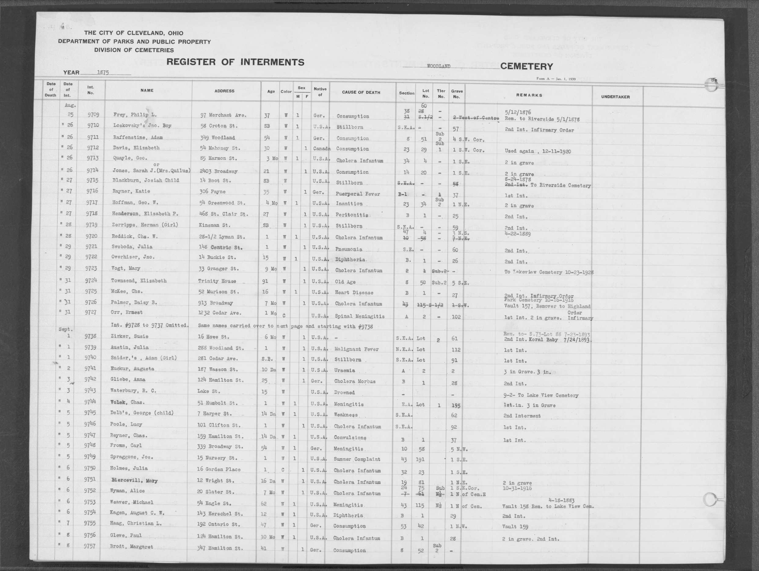 | Erie Street | 1 | 61 | Jul | 21 | 1849 | 2720 | Deacker, John | 9m | W | M | ||||