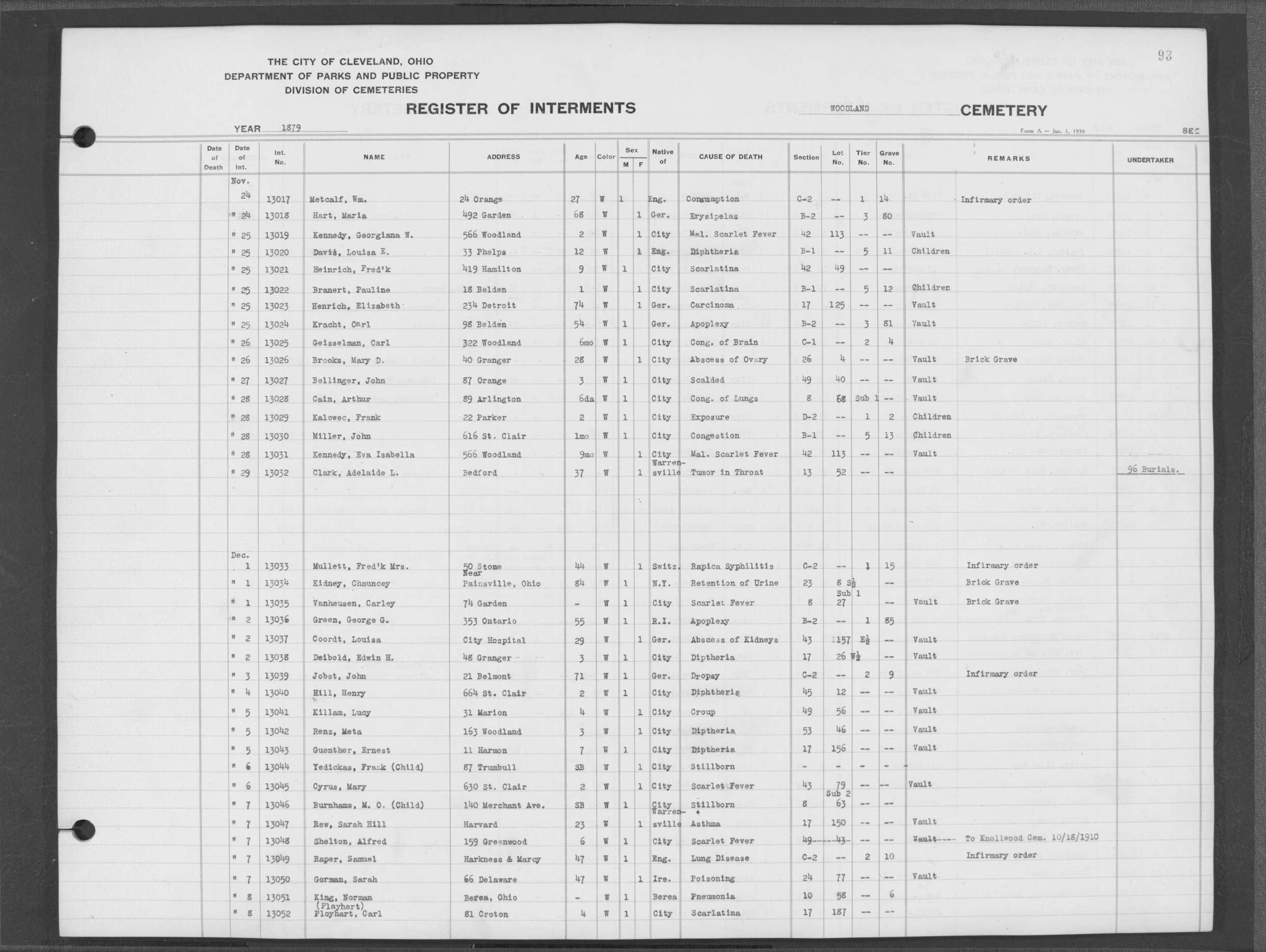 | Erie Street | 2 | 11 | Apr | 28 | 1881 | 13676 | Dean, | Mrs O C | 71y | W | F | |||
