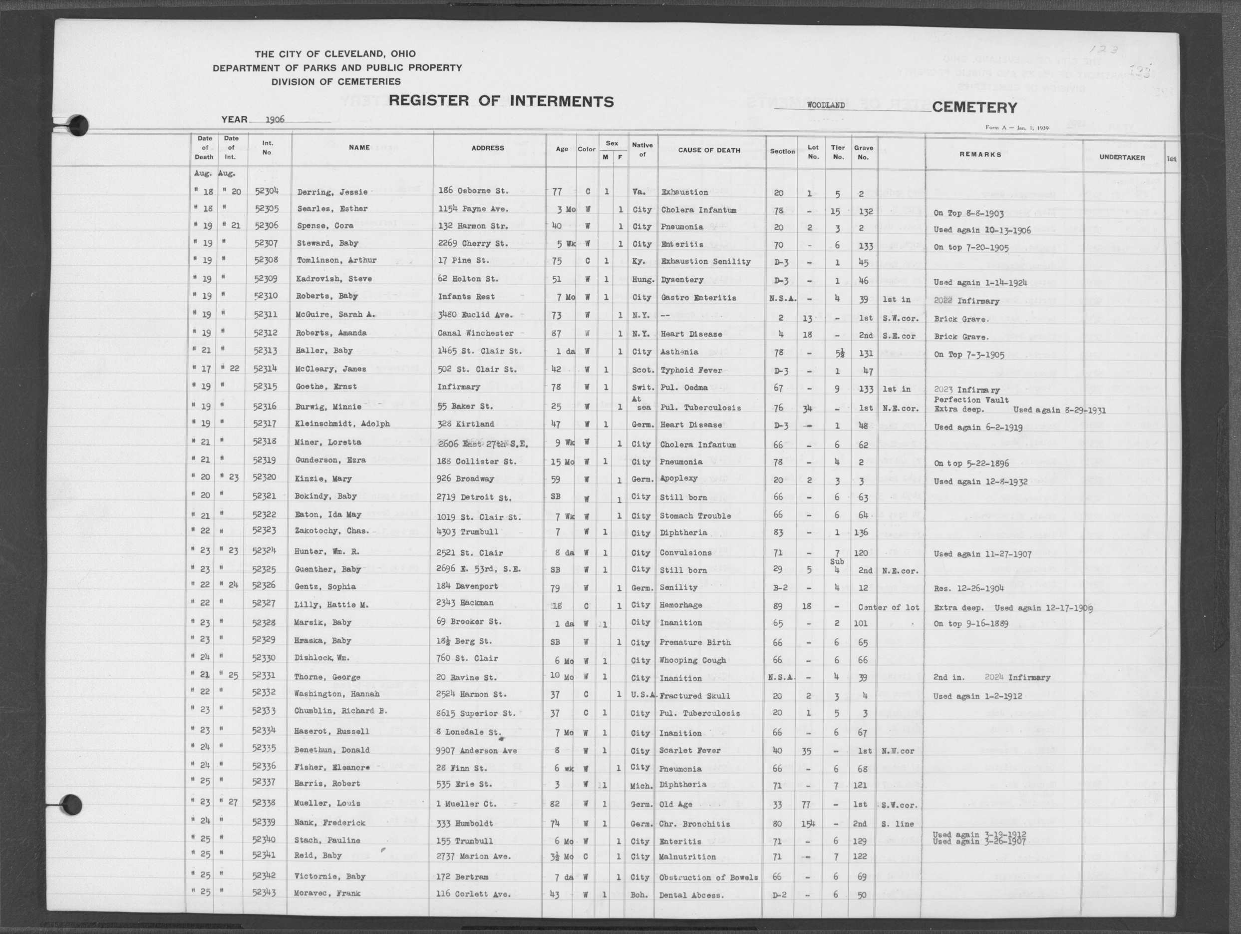 | Woodland | 7 | 123 | Aug | 18 | 1906 | Aug | 20 | 1906 | 52304 | Derring, Jessie | 77y | C | M | |