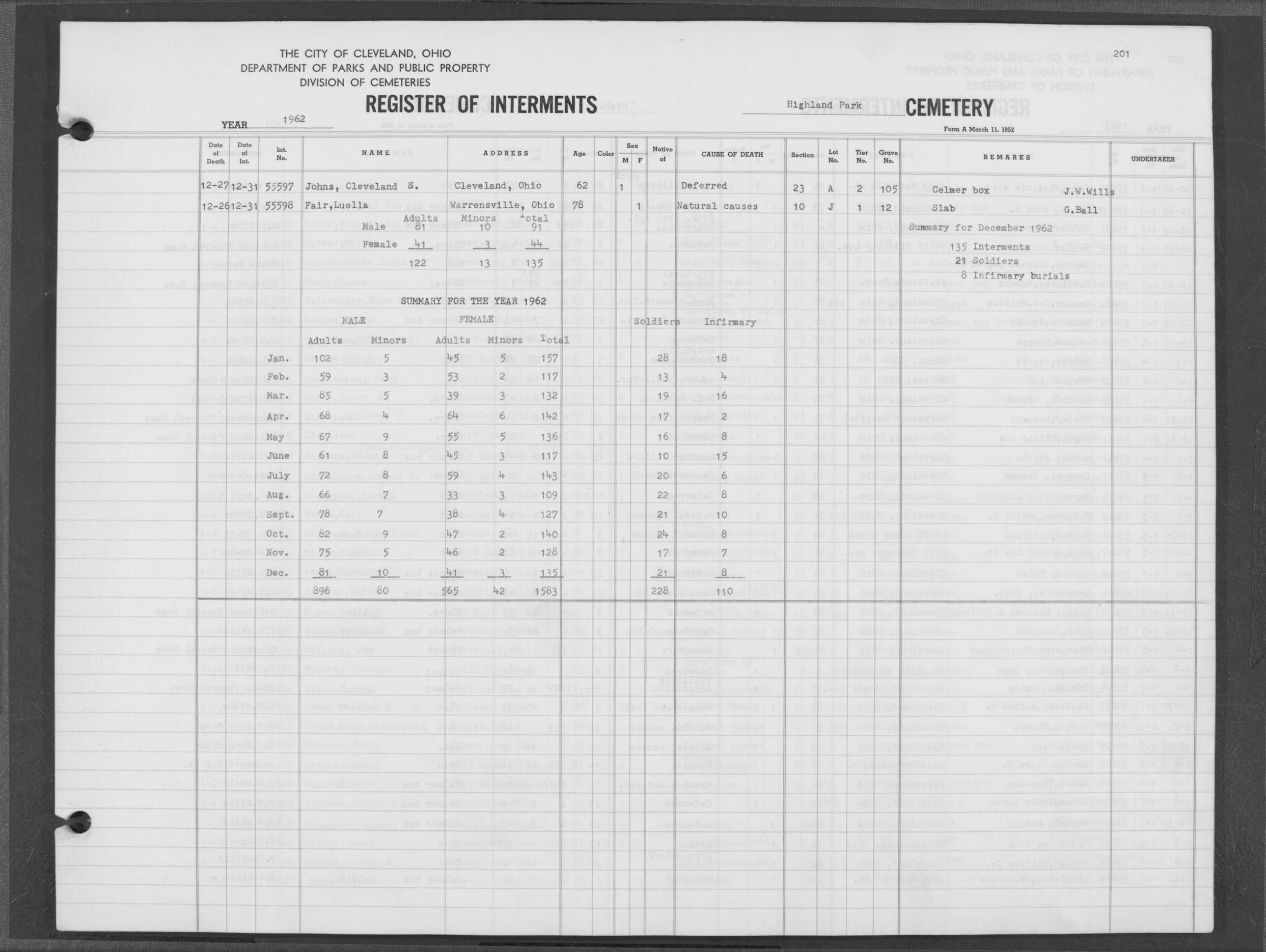 | West Park | 4 | 158 | Jan | 2 | 1961 | Jan | 5 | 1961 | 27466 | Feith, Eva | 71y | F | ||