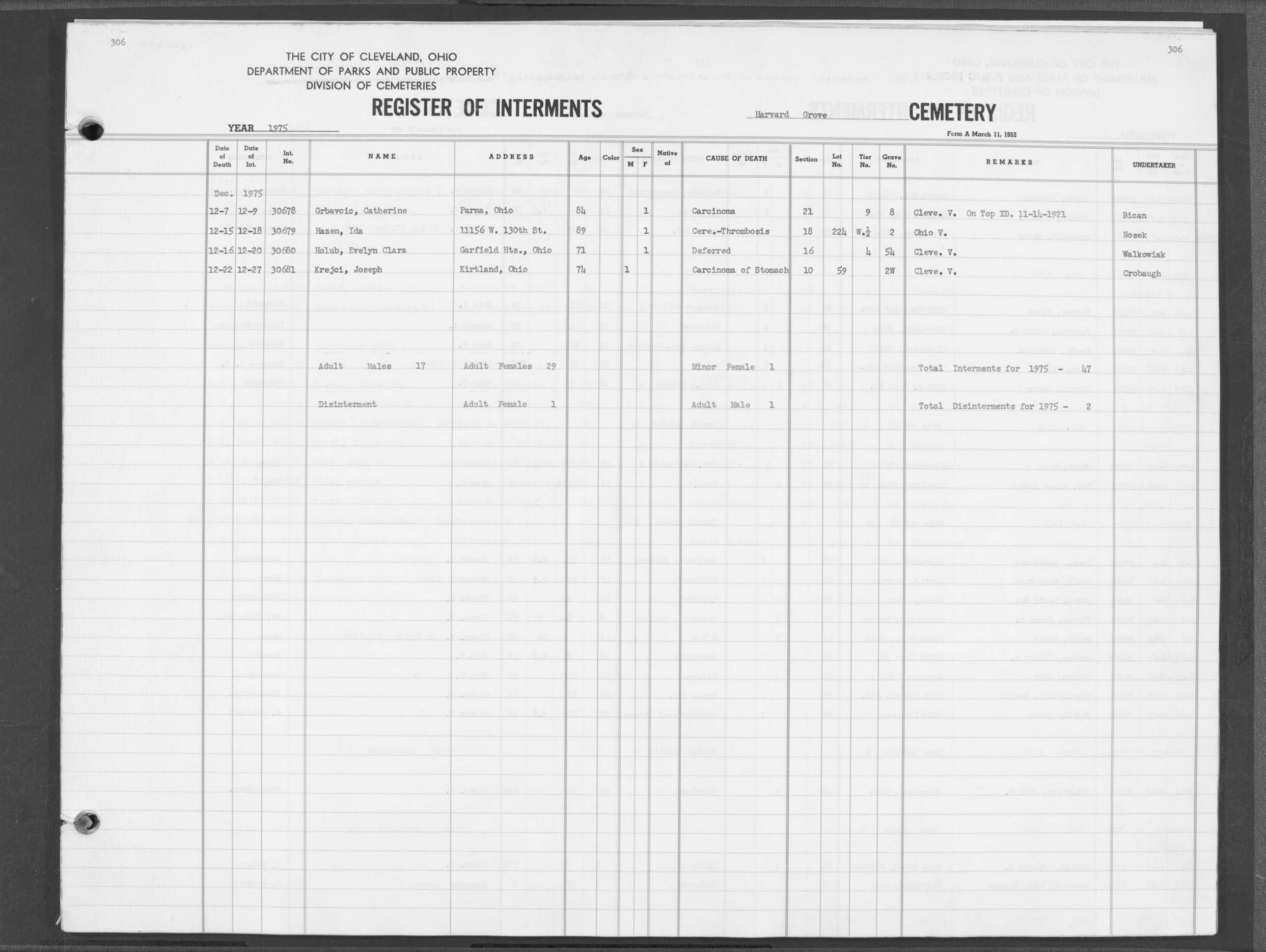 | Harvard Grove | 4 | 306 | Dec | 7 | 1975 | Dec | 9 | 1975 | 30678 | Grbavcic, Catherine | 84y | F | ||