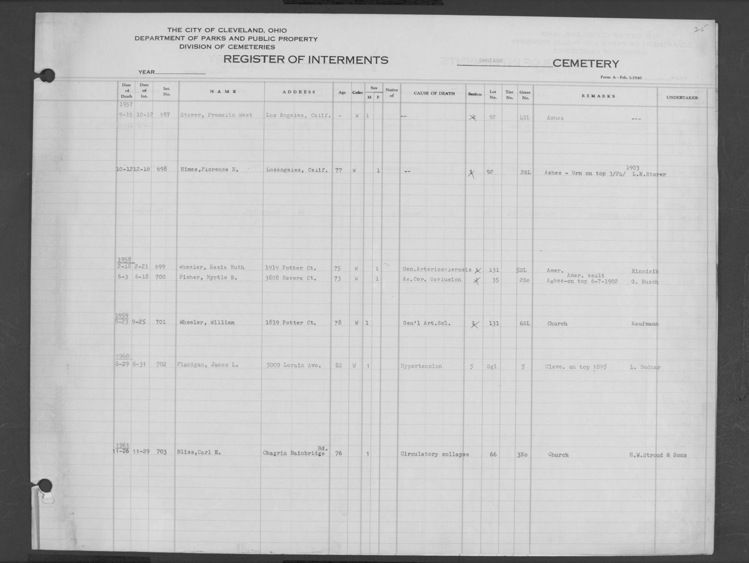 | Highland Park | 5 | 161 | Dec | 1 | 1951 | Dec | 6 | 1951 | 39014 | Hill, Bertha | 53y | B | F | |