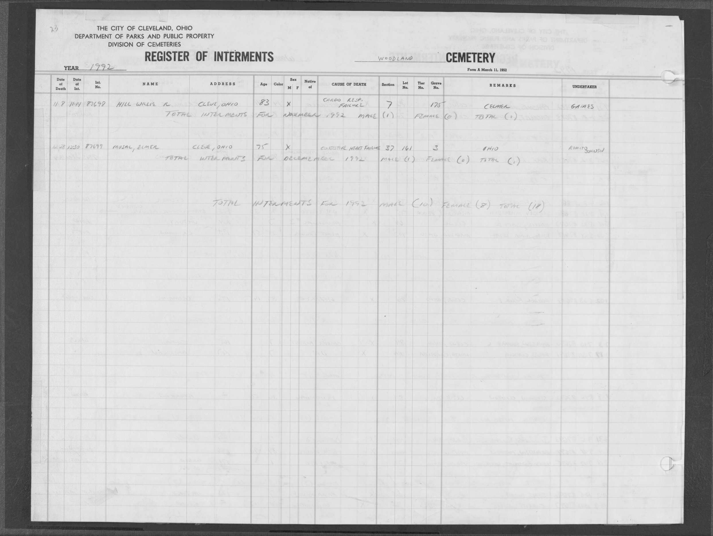 | Highland Park | 10 | 278 | Apr | 11 | 1992 | Apr | 16 | 1992 | 117798 | Hill, Beatrice Marie | 55y | F | ||