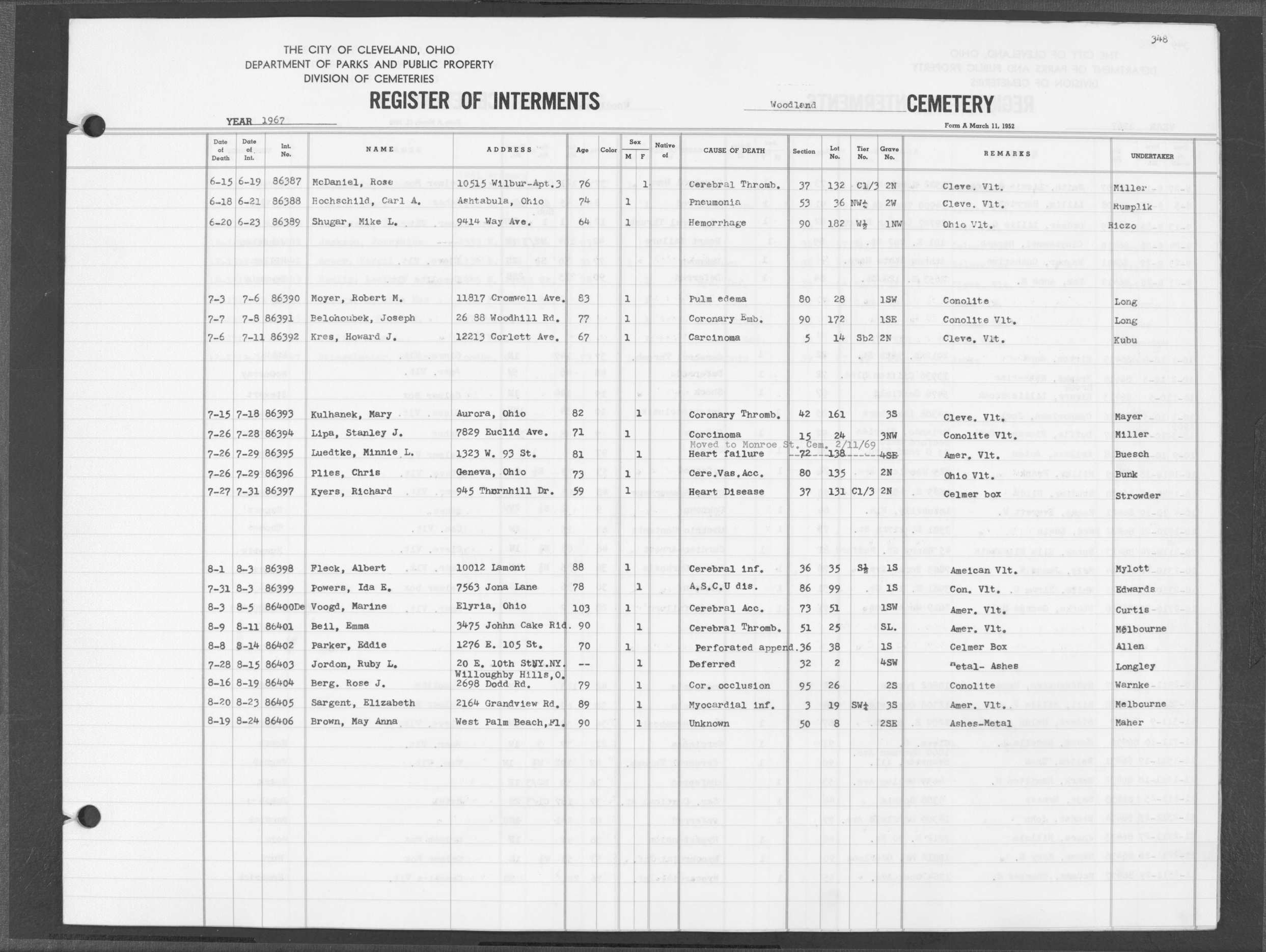 | Highland Park | 9 | 413 | Jul | 21 | 1985 | Jul | 24 | 1985 | 105628 | Hobzek, Frank E | 91y | M | ||