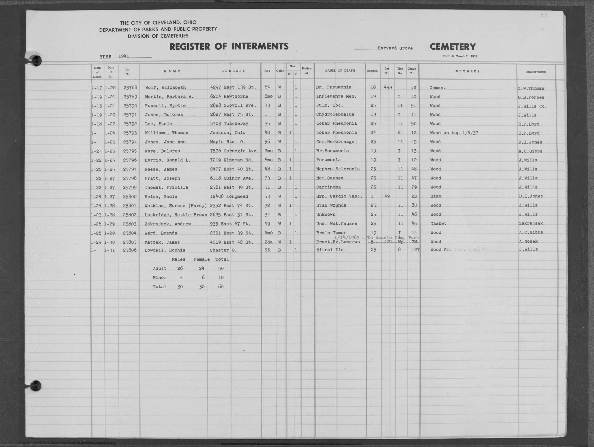 | Highland Park | 4 | 105 | Jun | 19 | 1941 | Jun | 27 | 1941 | 26969 | Jones, Louise | 46y | B | F | |