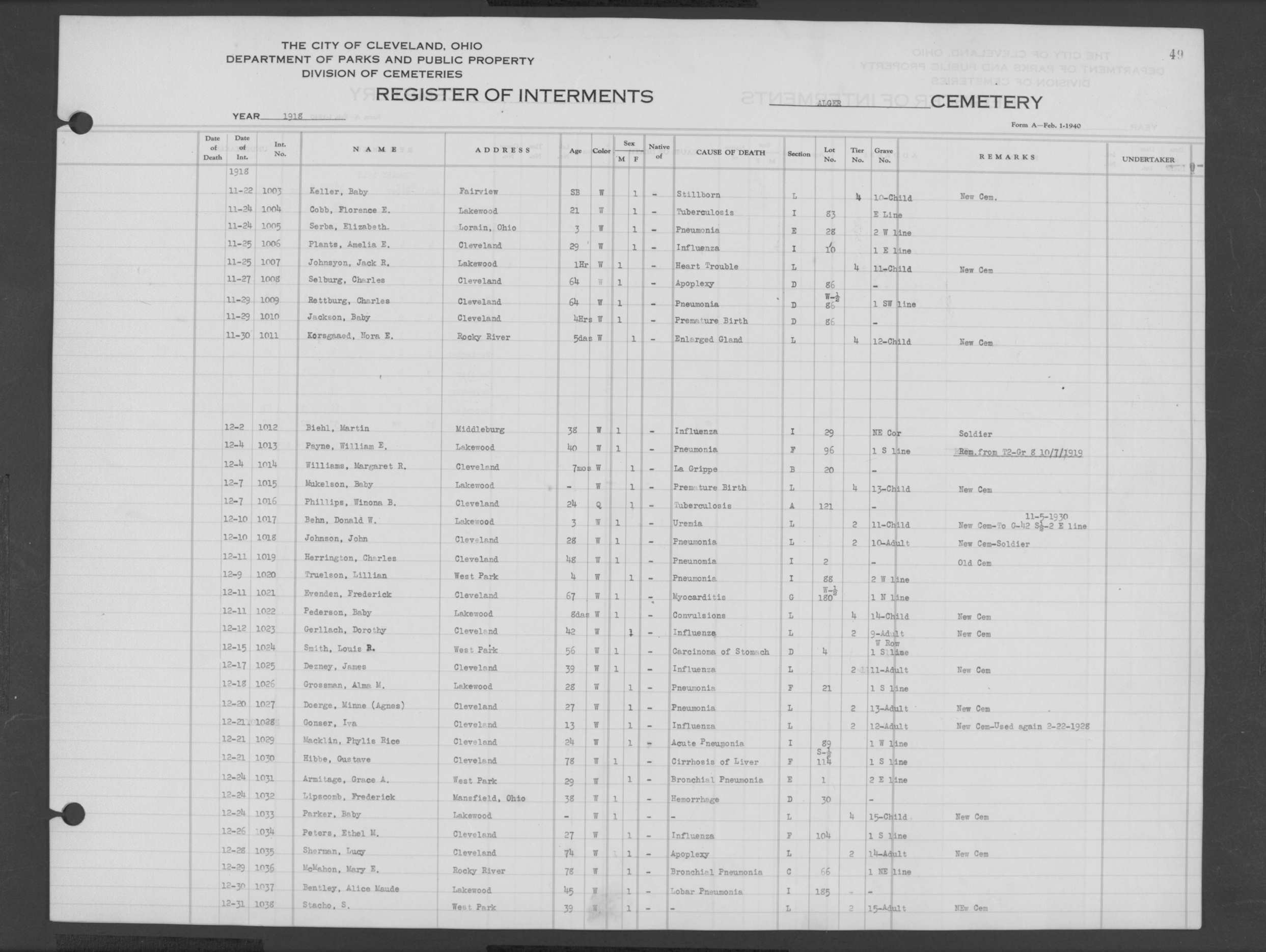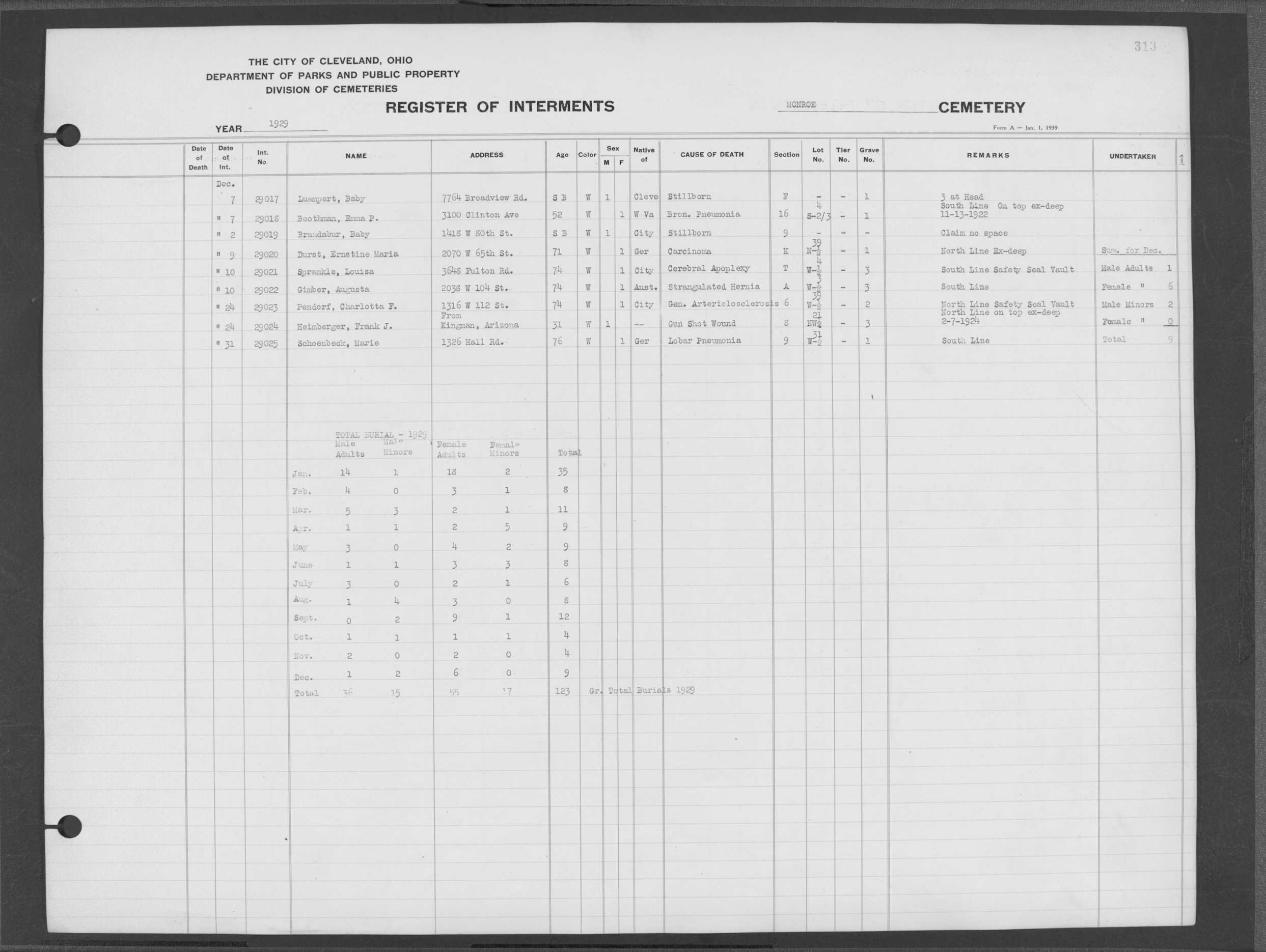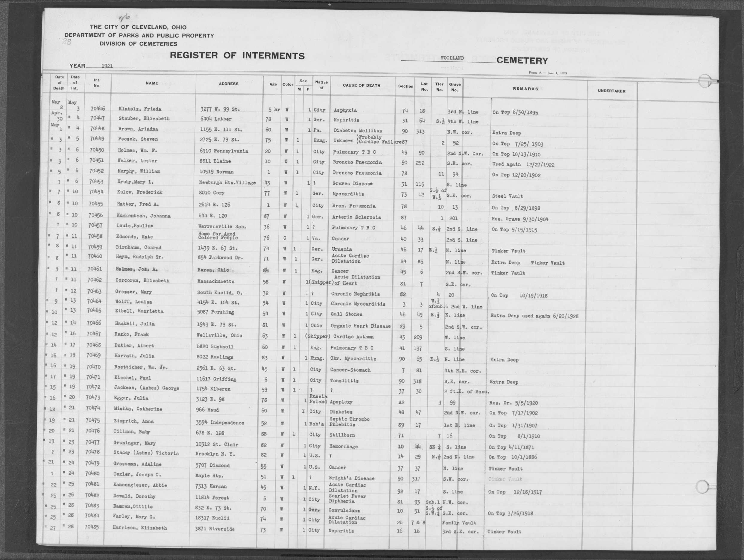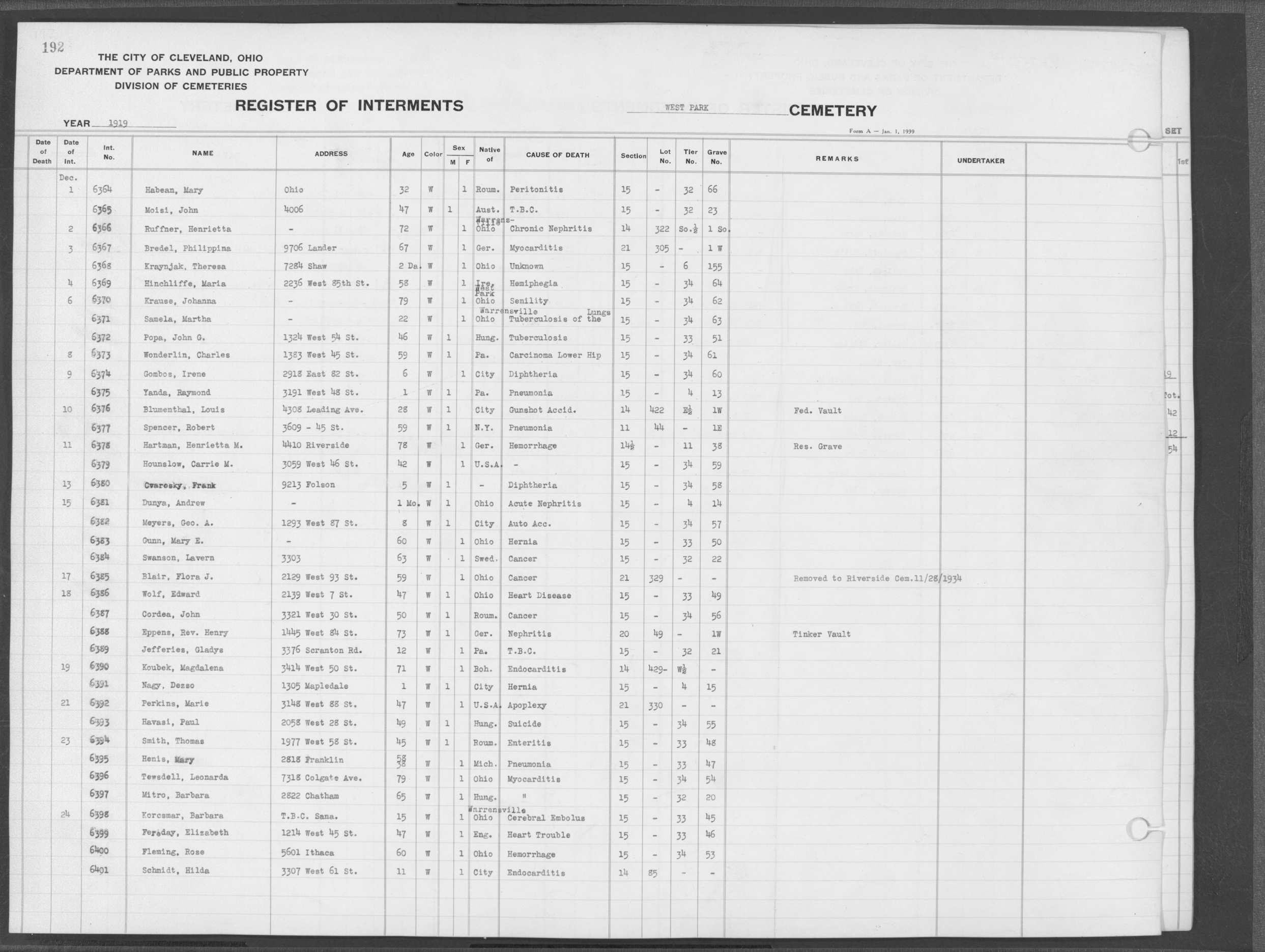 | West Park | 1 | 192 | Dec | 21 | 1919 | 6392 | Perkins, Marie | 47y | W | F | ||||