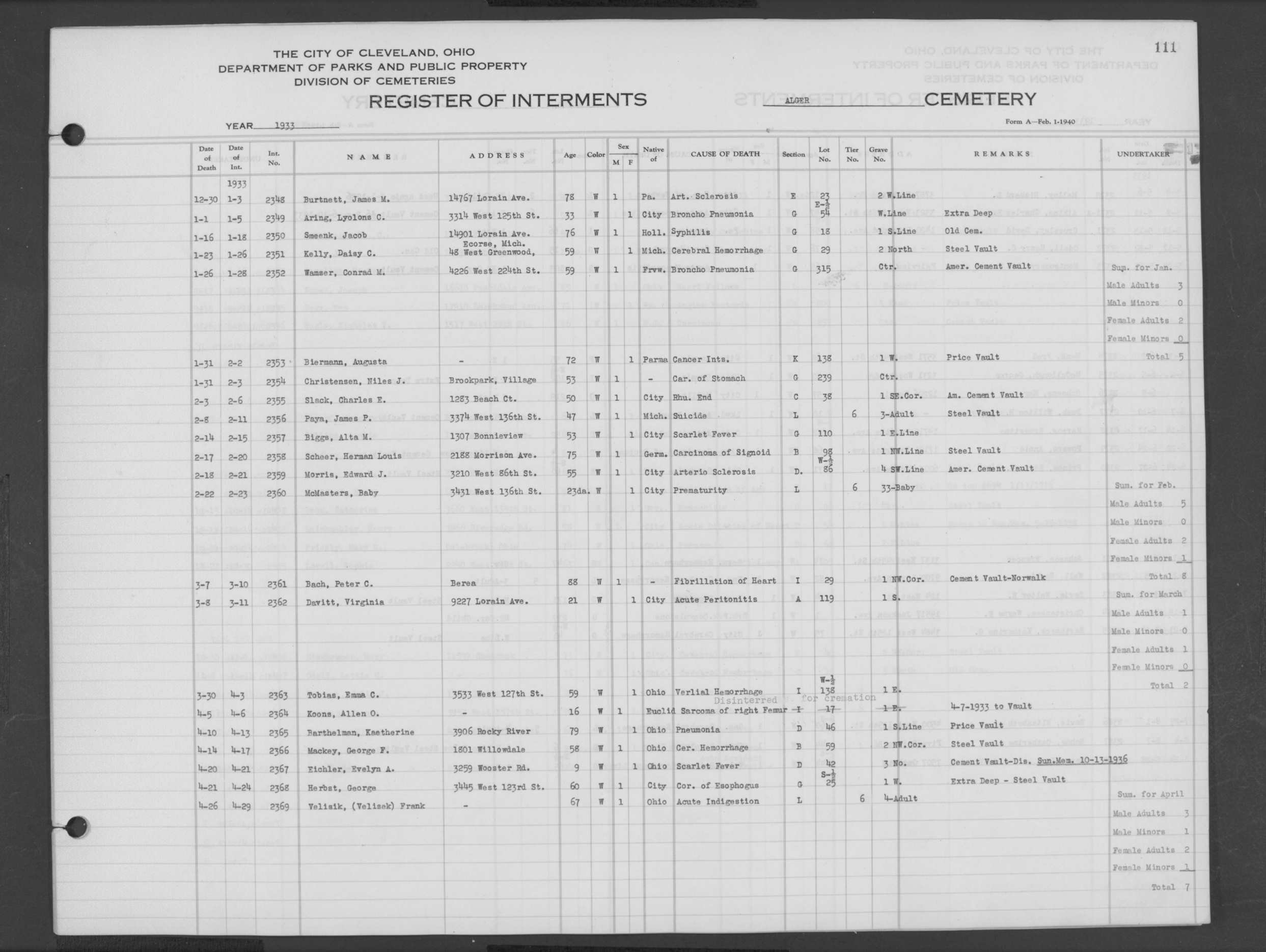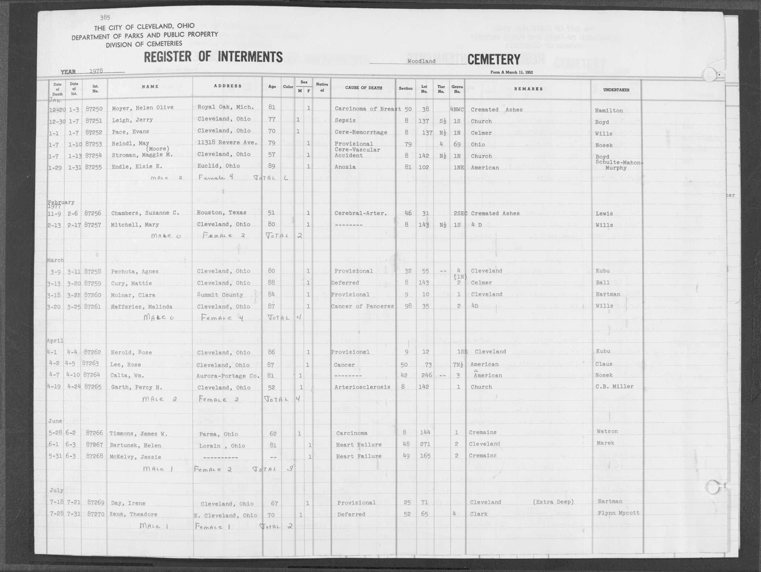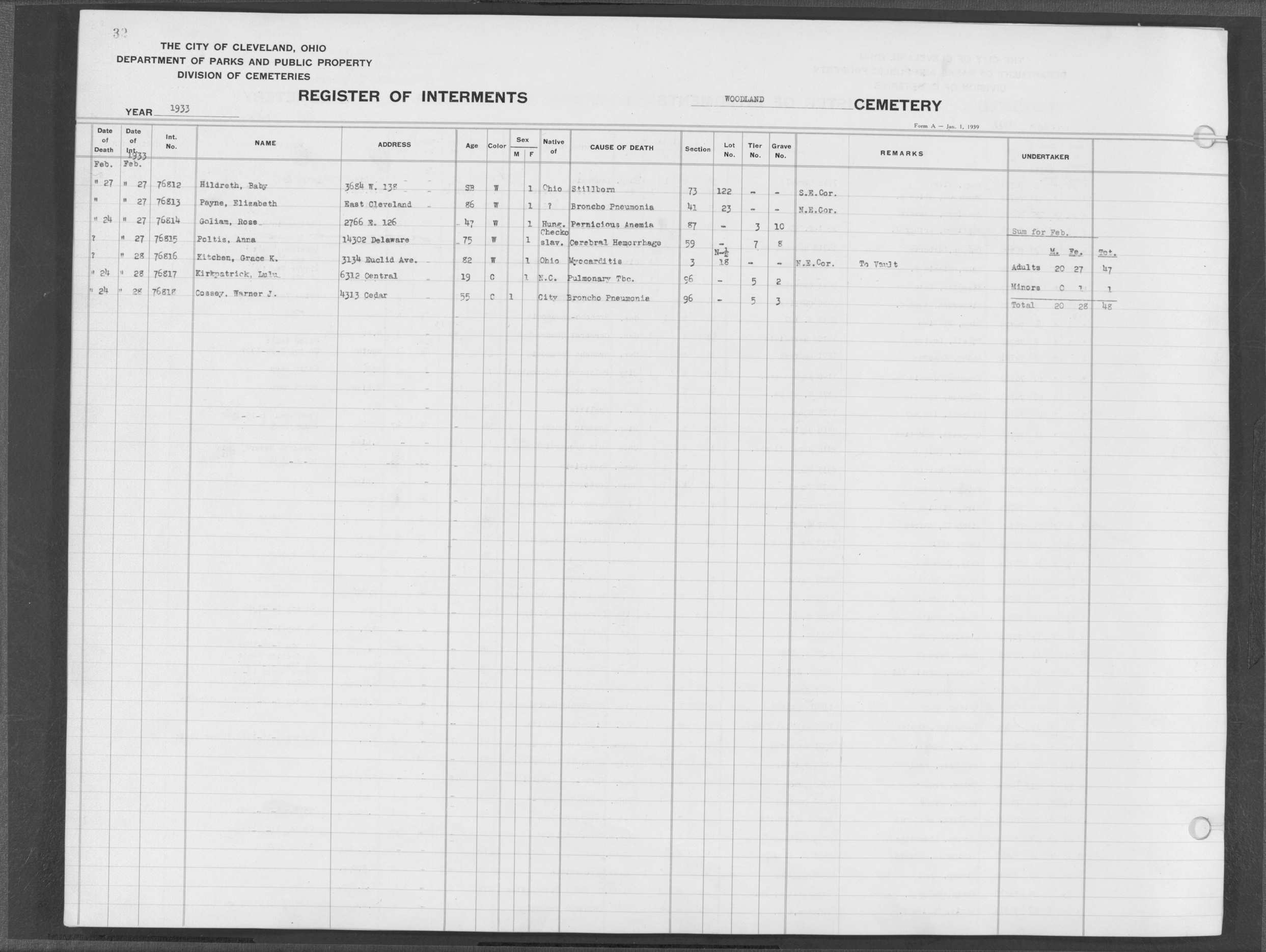 | Highland Park | 3 | 6 | Feb | 15 | 1931 | Feb | 19 | 1931 | 15440 | Payne, Bessie | 65y | B | F | |