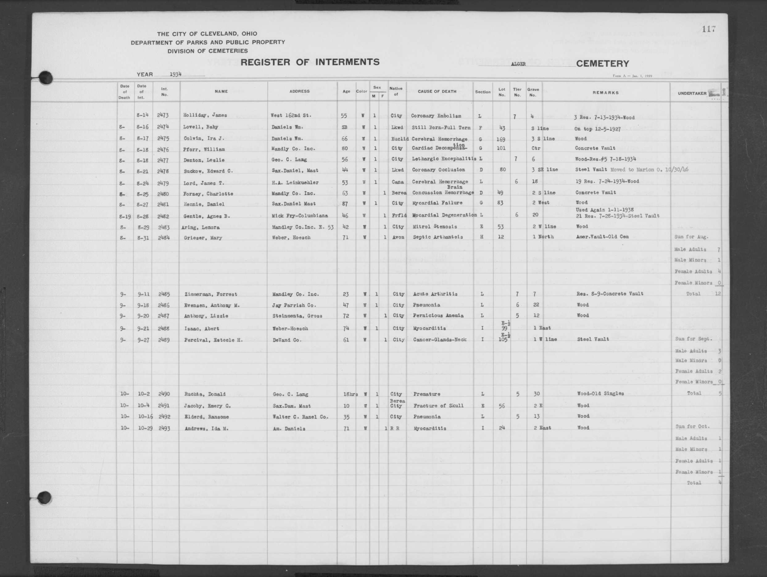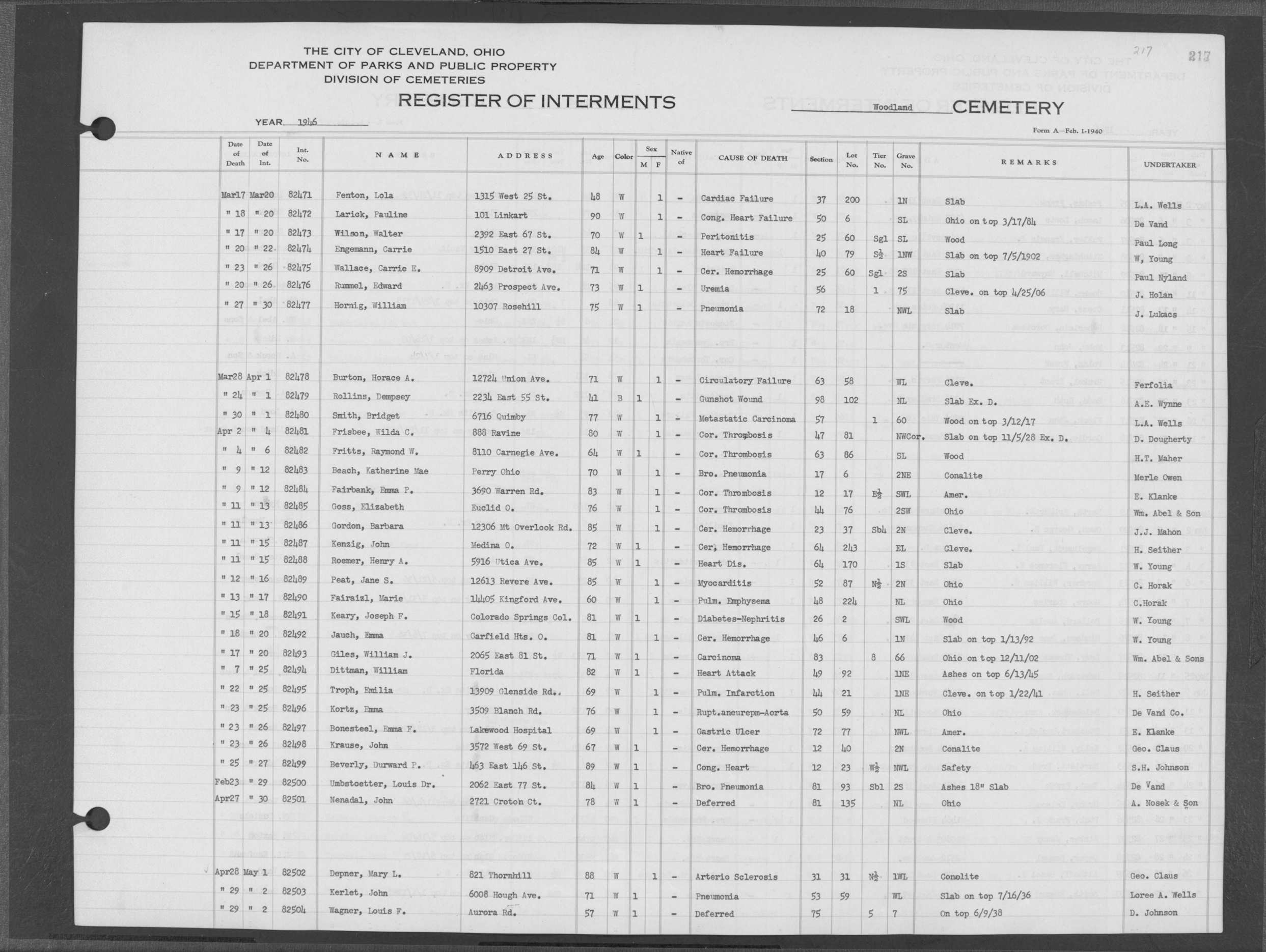 | Highland Park | 4 | 244 | Jul | 5 | 1946 | Jul | 9 | 1946 | 32346 | Perkins, Katie | 78y | B | F | |