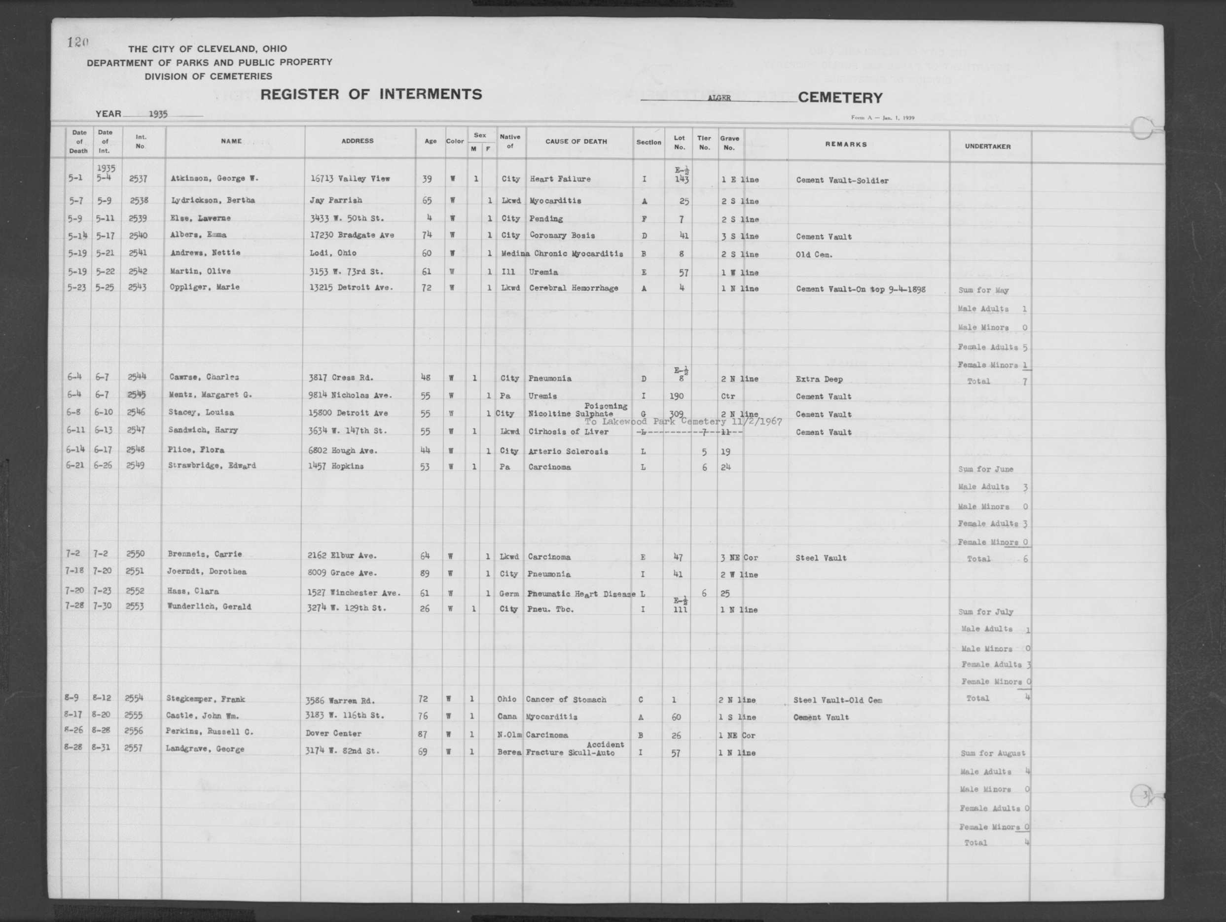 | West Park | 5 | 195 | Aug | 17 | 1977 | Aug | 19 | 1977 | 37719 | Perkins, Leonard A | 72y | M | ||