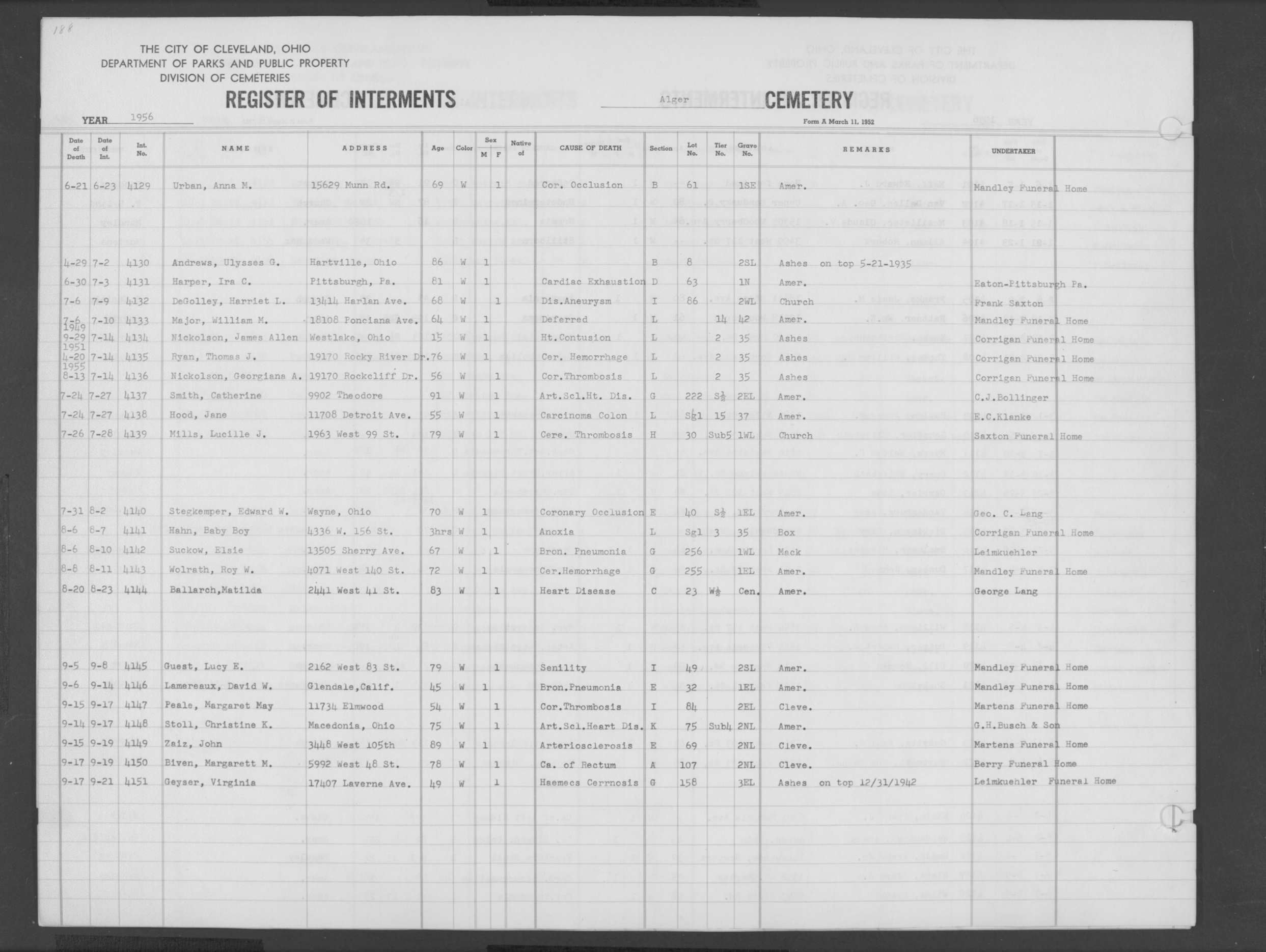 | Harvard Grove | 4 | 57 | Apr | 30 | 1938 | May | 5 | 1938 | 23826 | Payne, Edw Wm | 66y | C | M | |