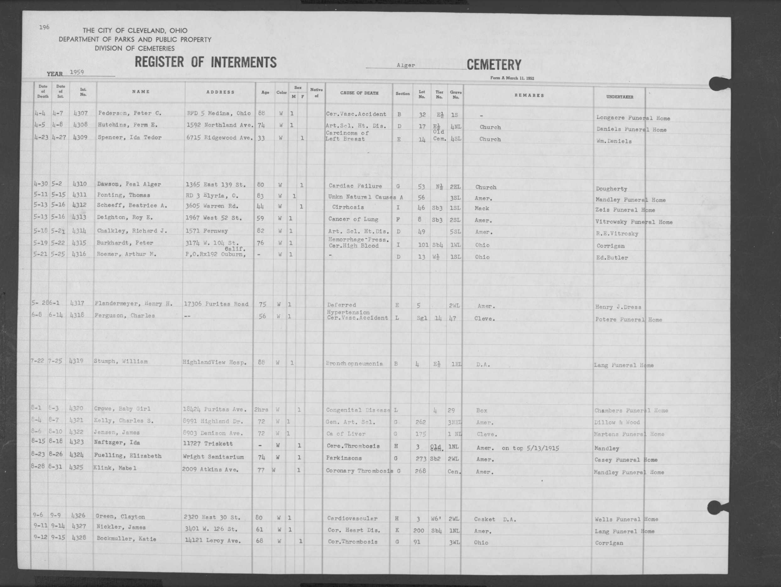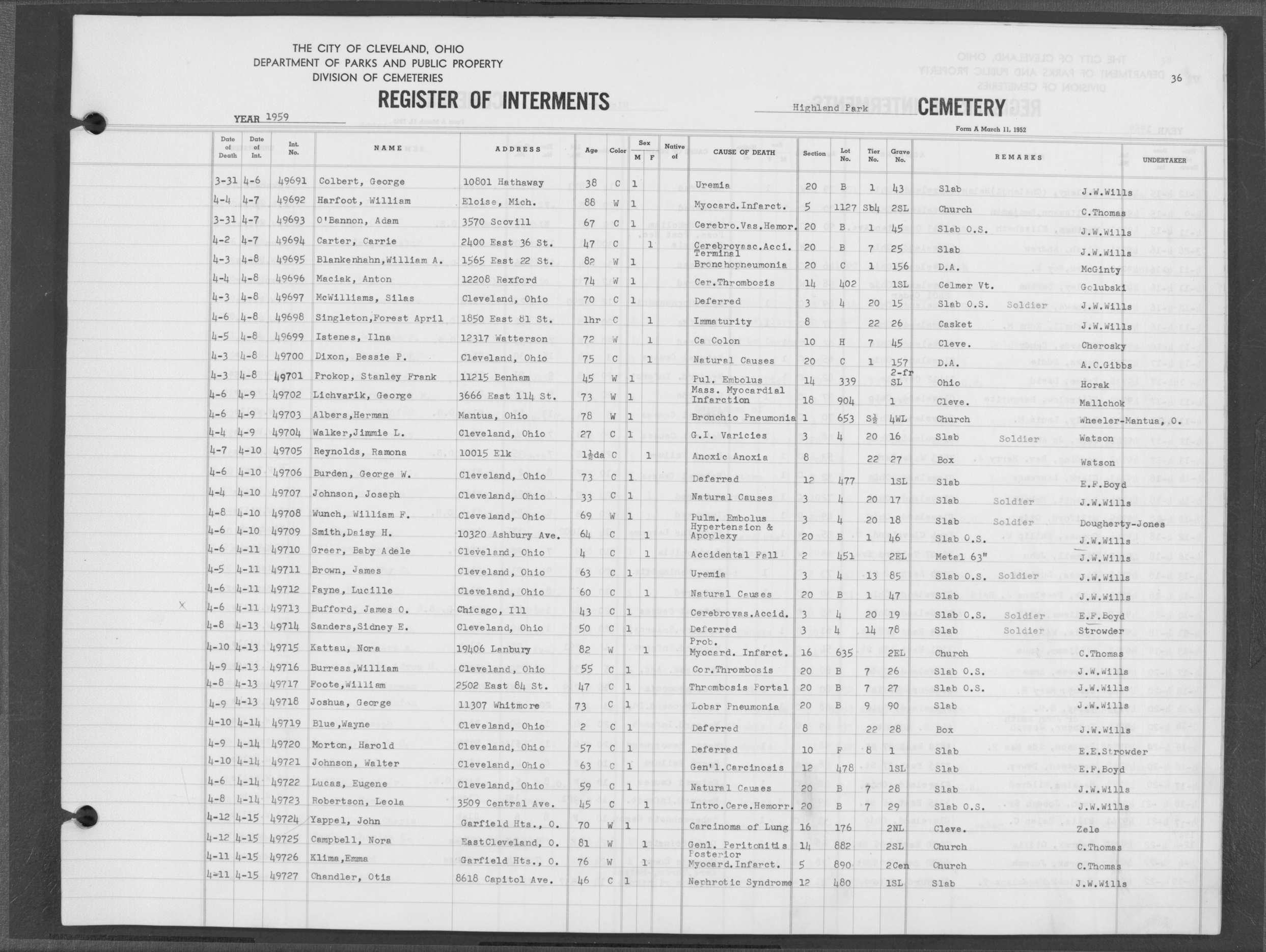 | Highland Park | 6 | 35 | Mar | 27 | 1959 | Apr | 1 | 1959 | 49669 | Perkins, Lucilla B | 73y | C | F | |