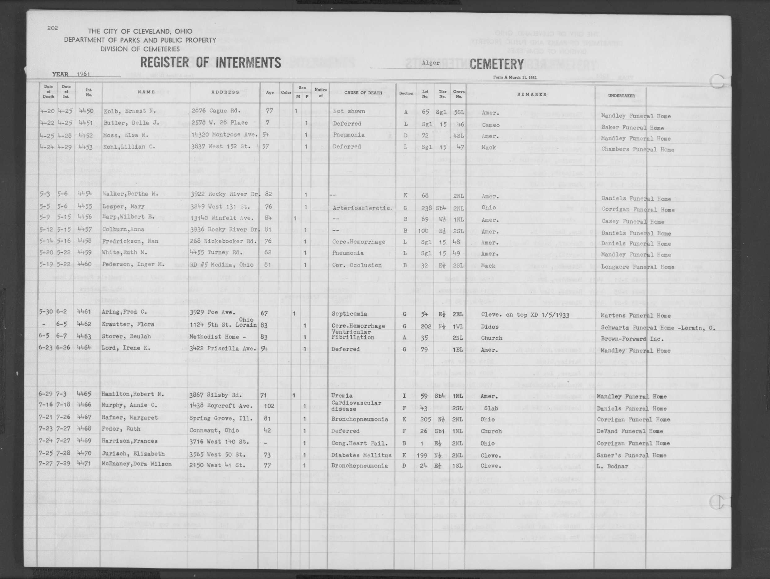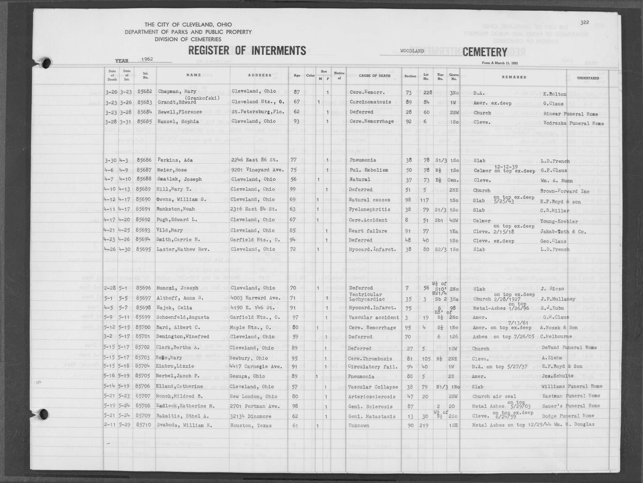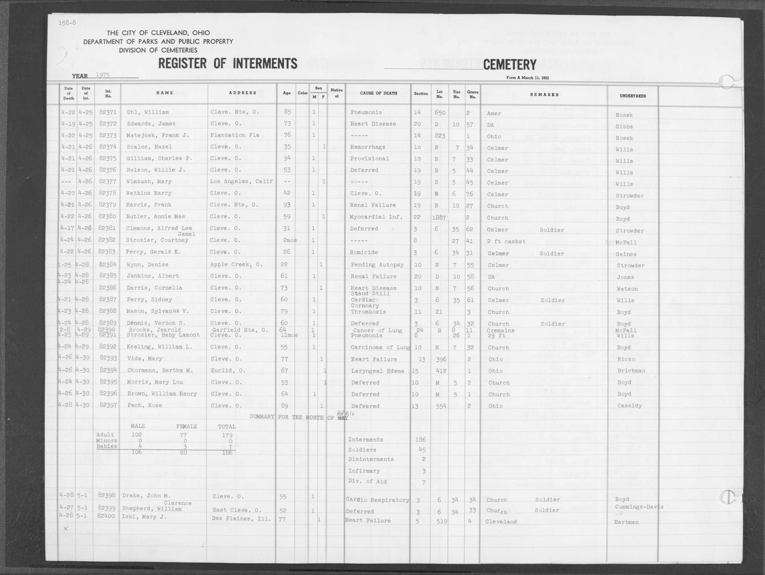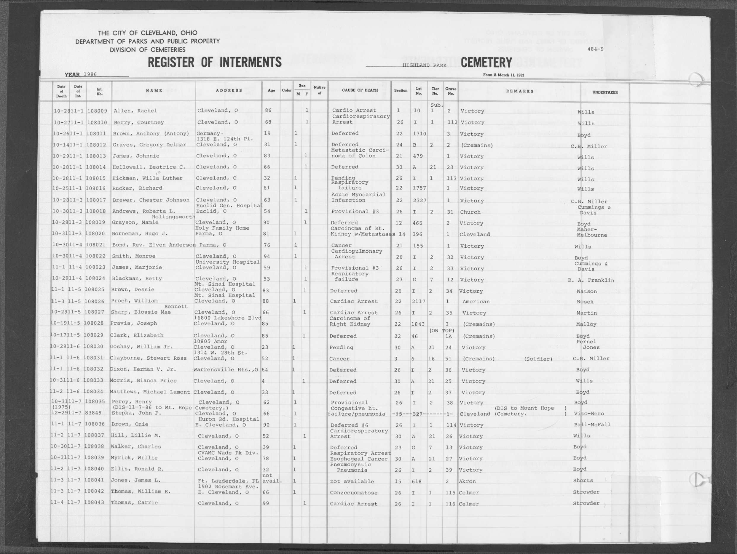 | Highland Park | 10 | 75 | May | 25 | 1988 | Jun | 2 | 1988 | 110874 | Perkins, Rita M | 62y | F | ||
