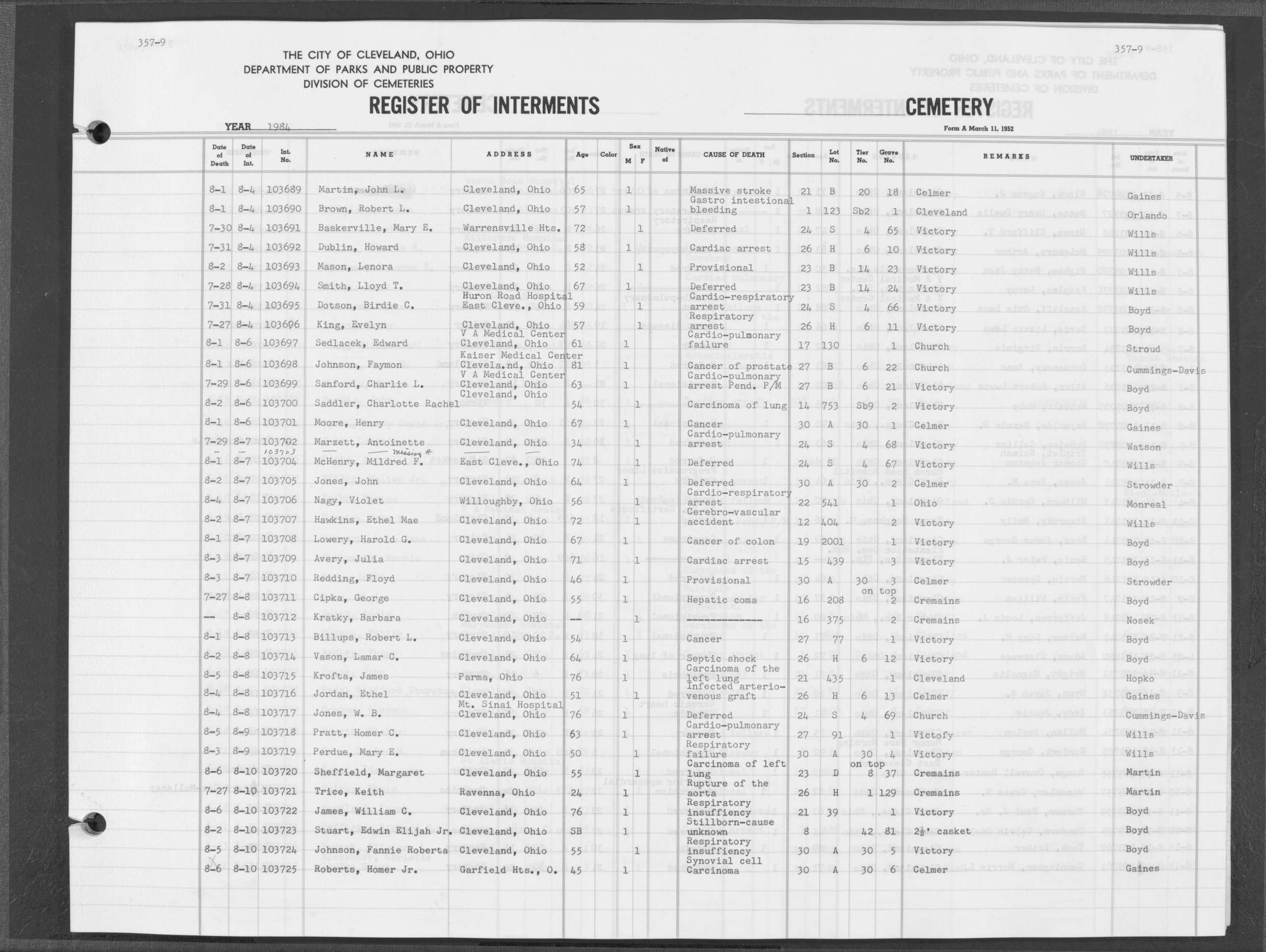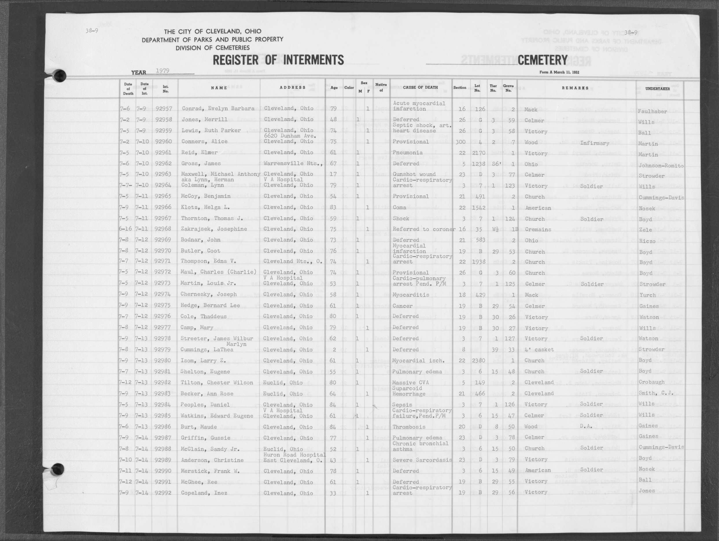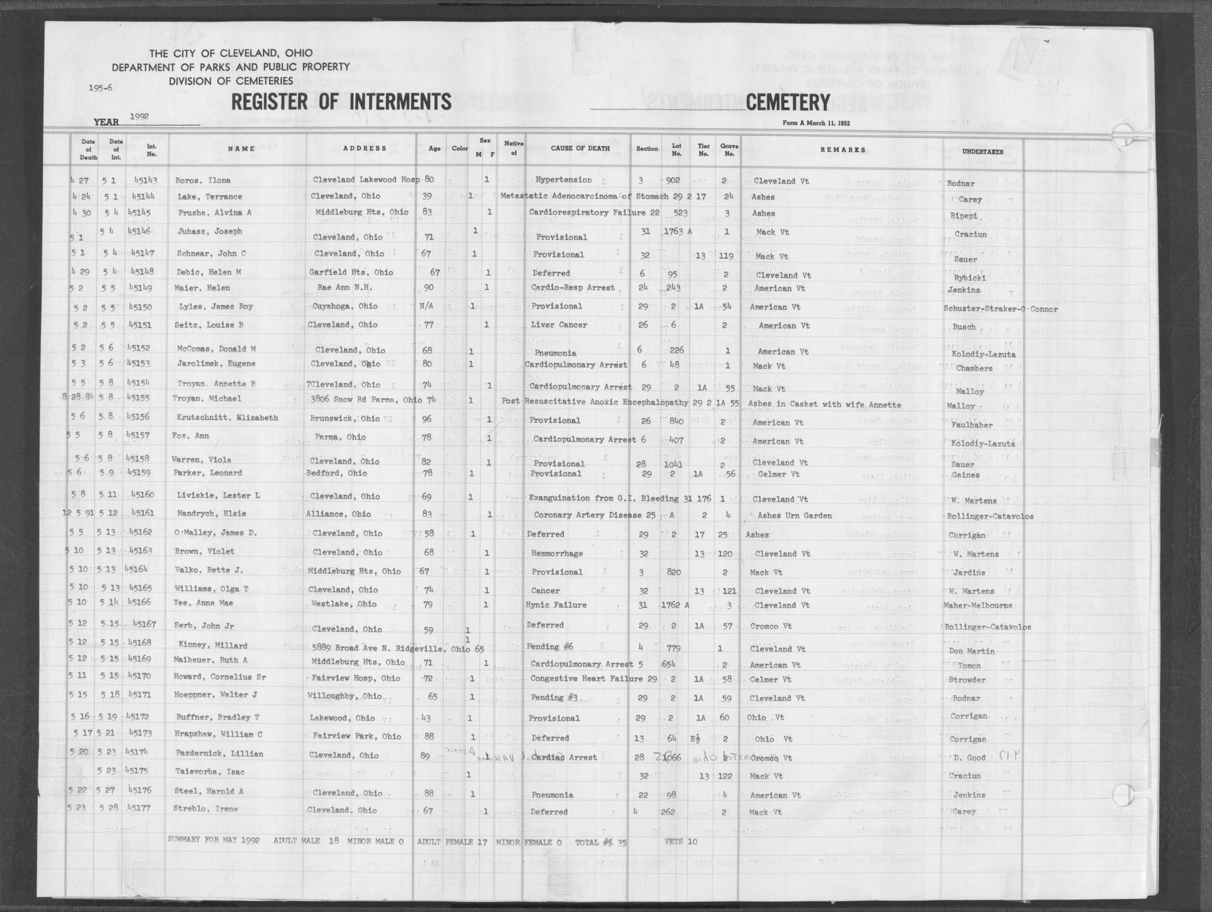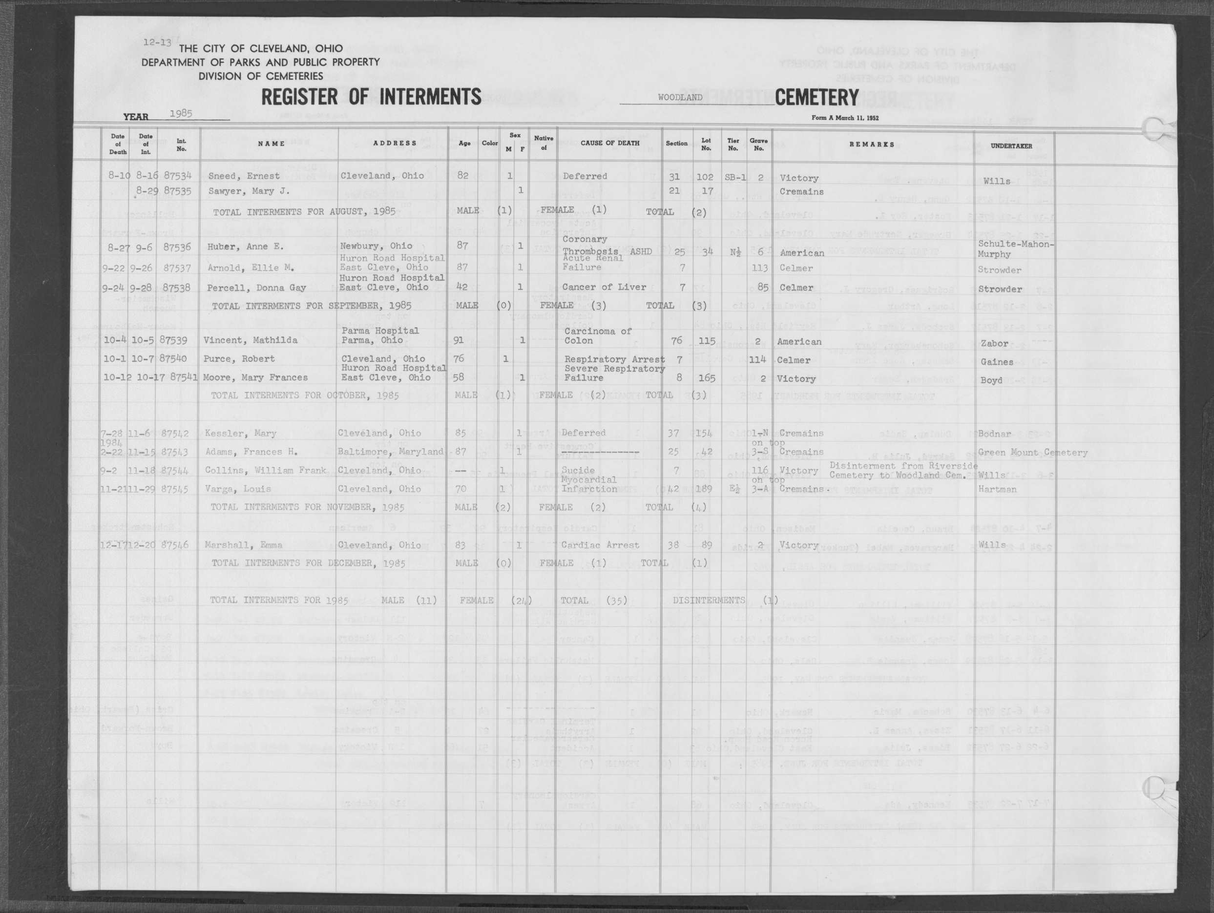 | Highland Park | 10 | 75 | May | 25 | 1988 | Jun | 2 | 1988 | 110874 | Perkins, Rita M | 62y | F | ||