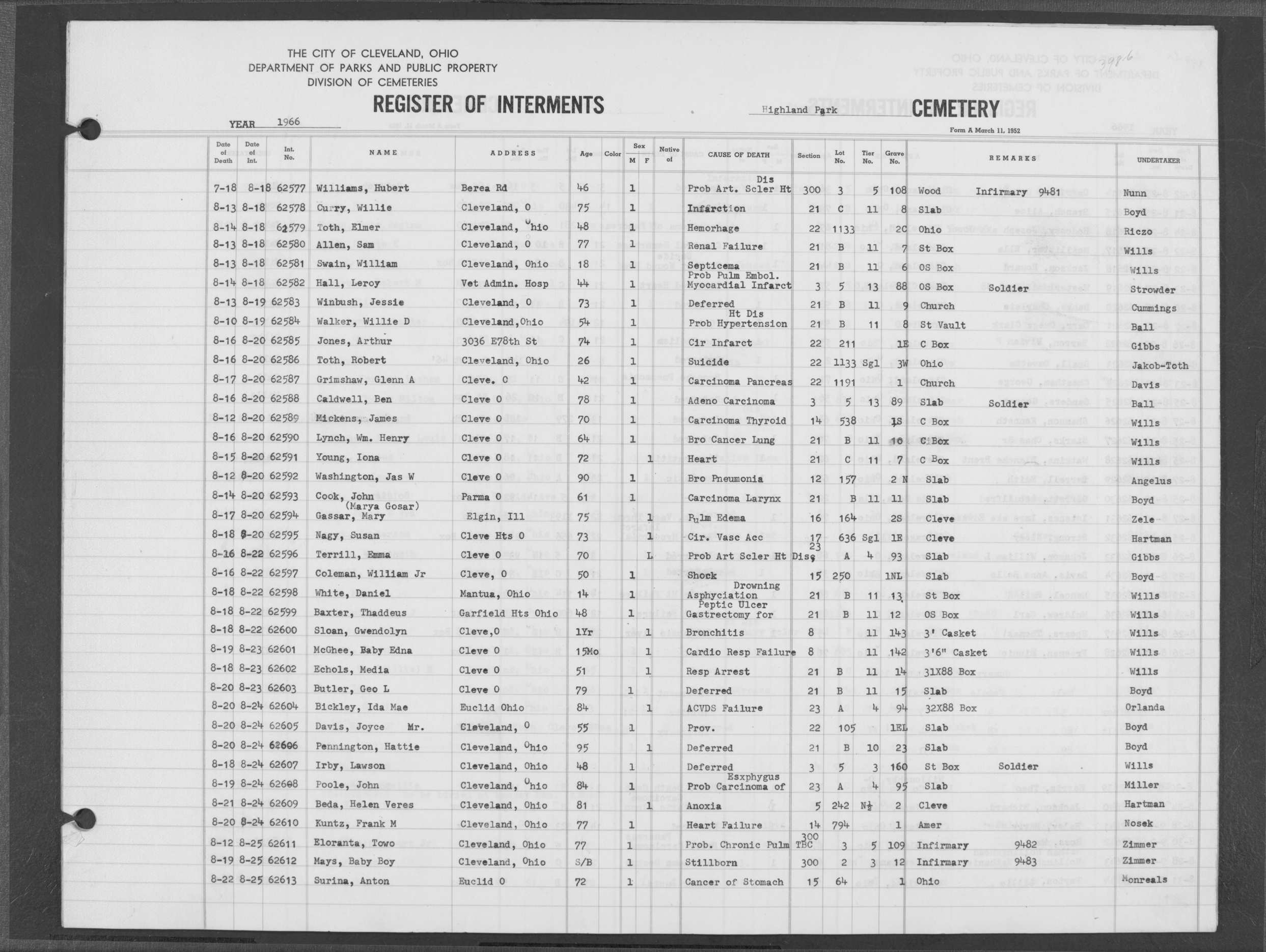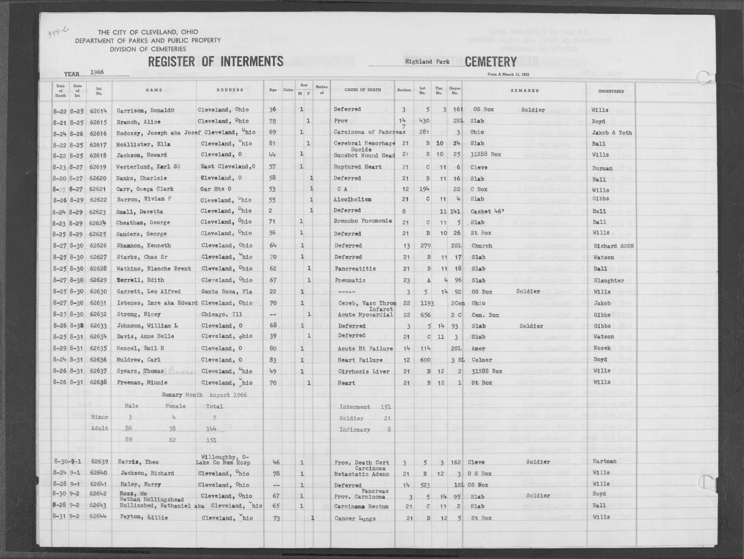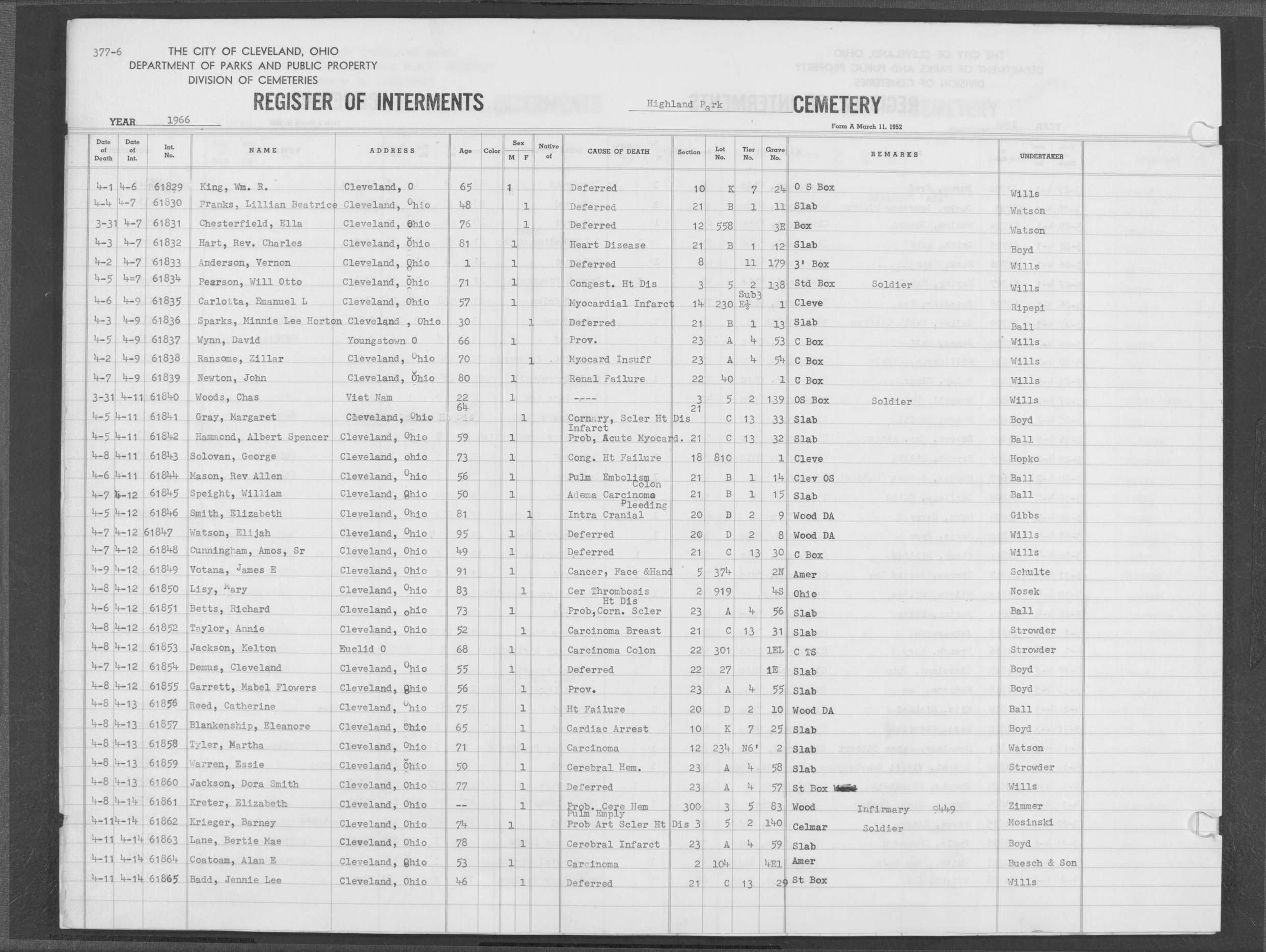 | Highland Park | 6 | 383 | May | 20 | 1966 | May | 24 | 1966 | 62077 | Payer, Joseph | 82y | M | ||