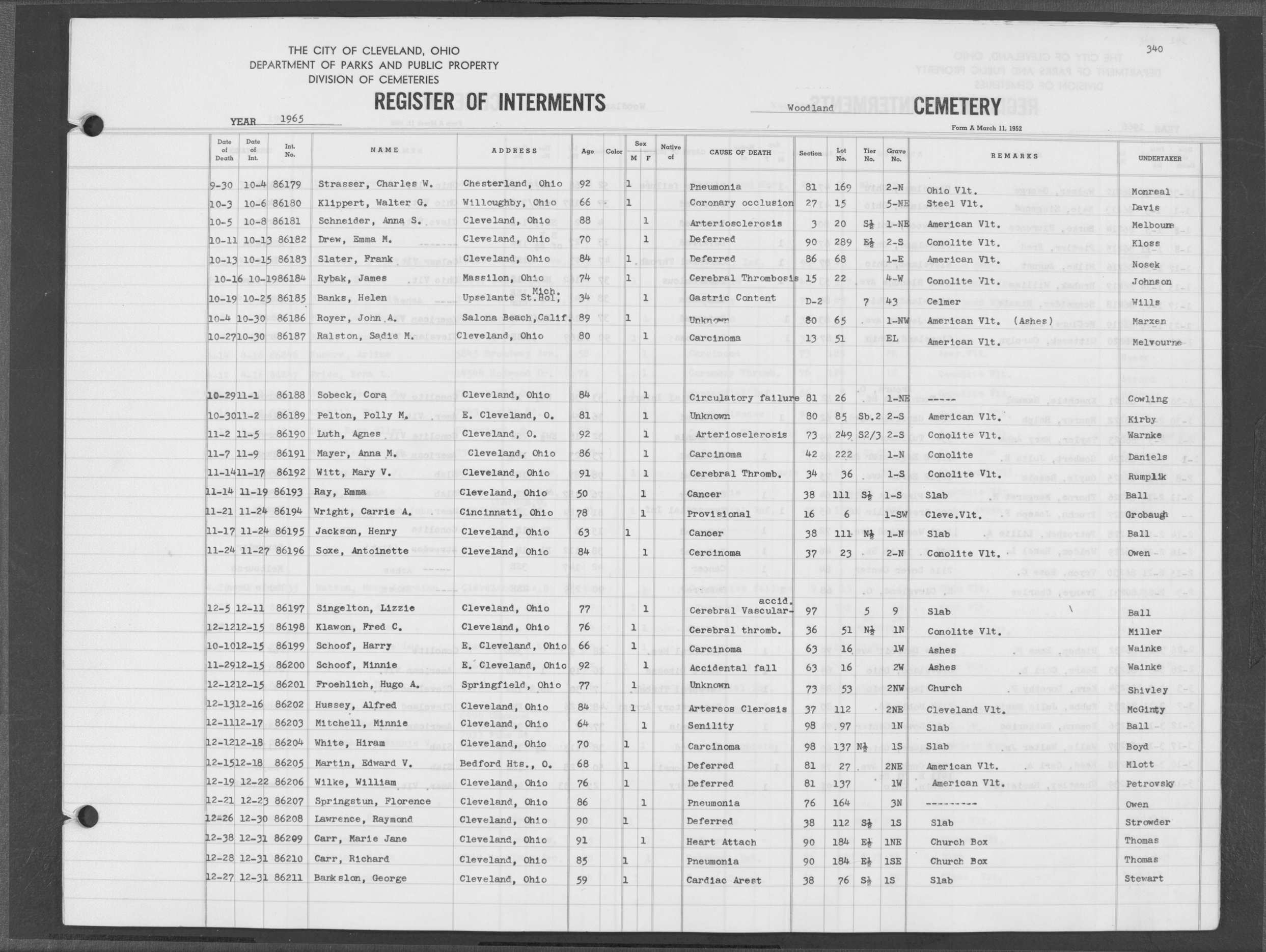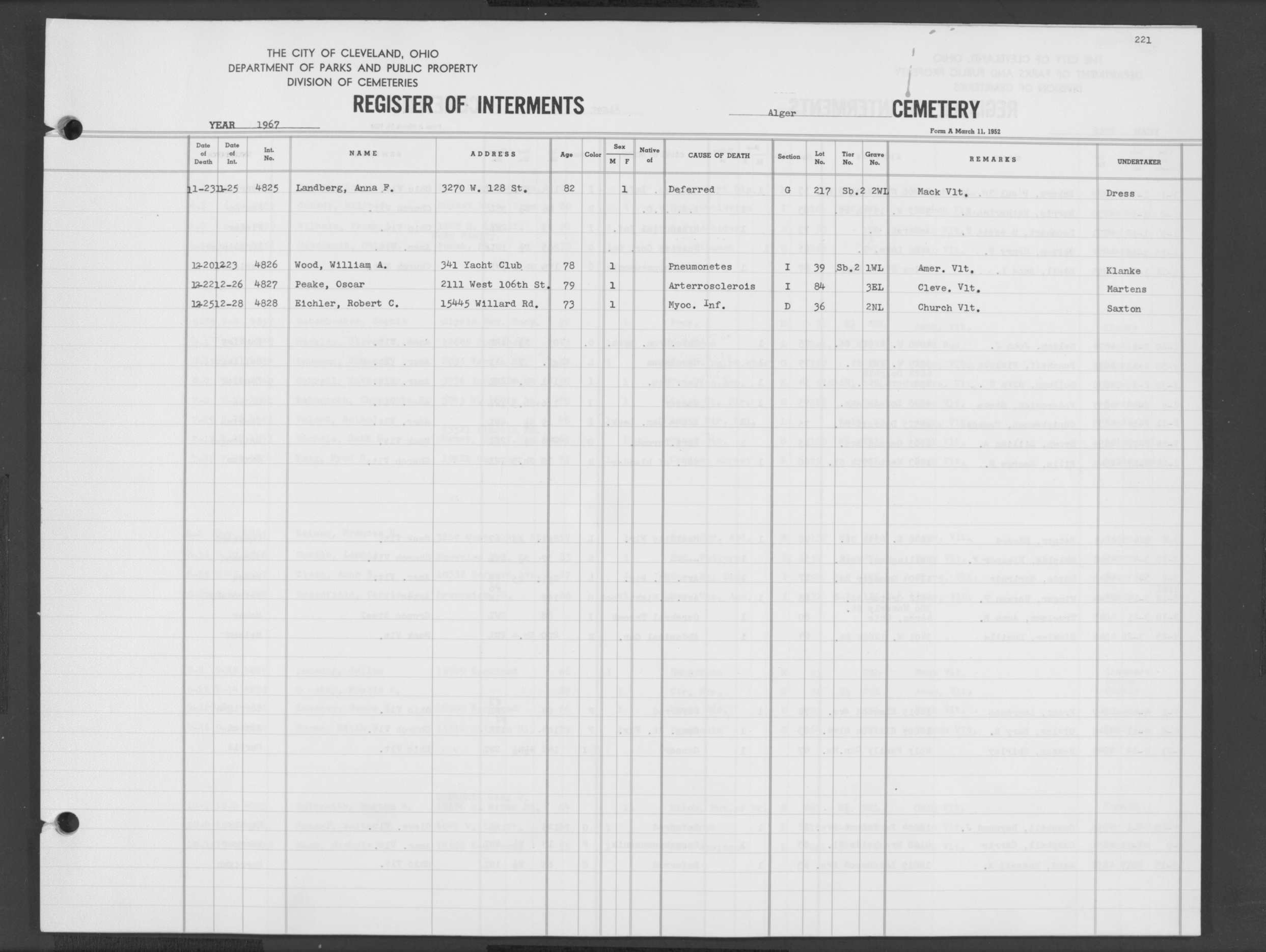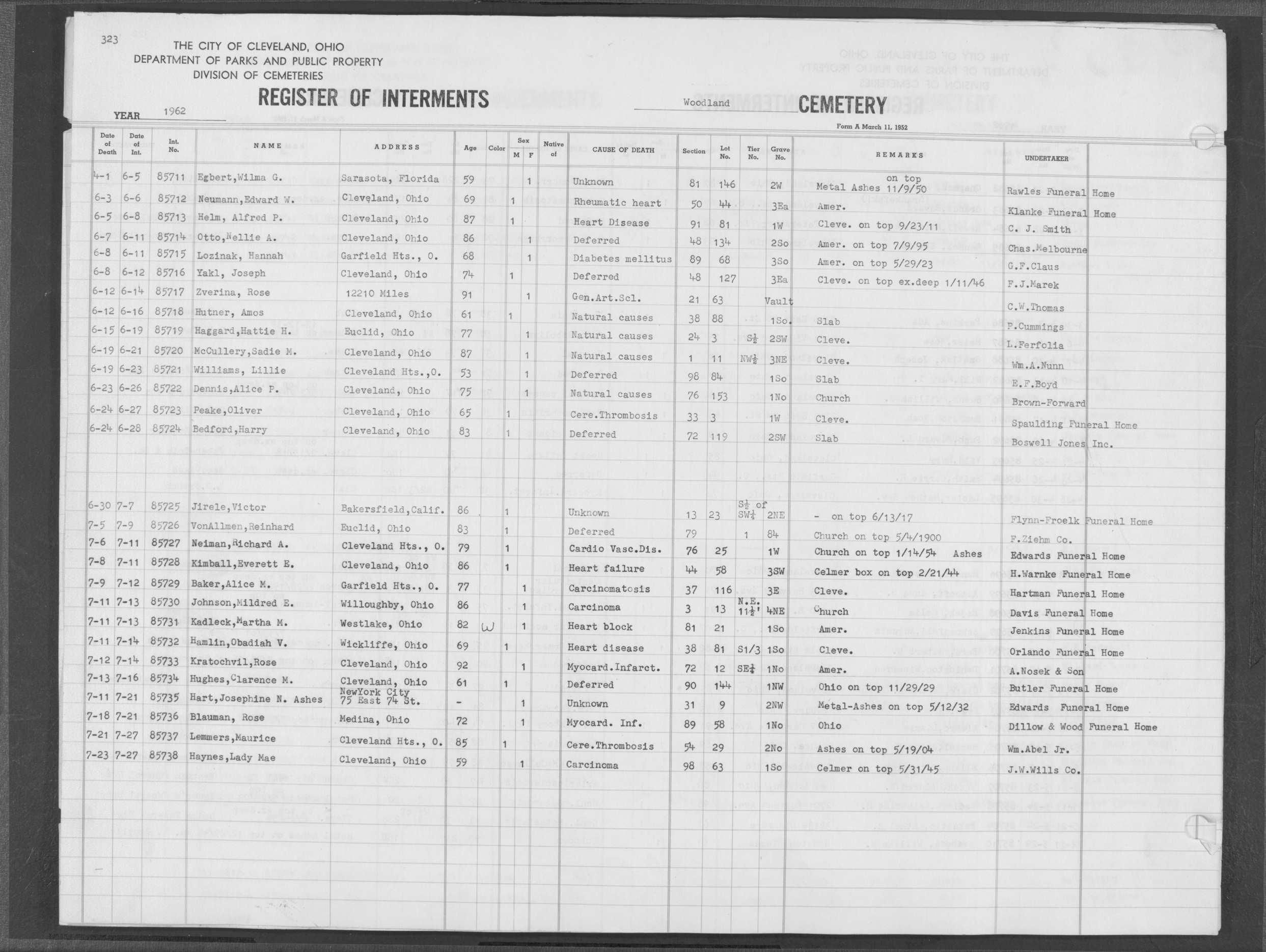 | Highland Park | 6 | 383 | May | 20 | 1966 | May | 24 | 1966 | 62077 | Payer, Joseph | 82y | M | ||