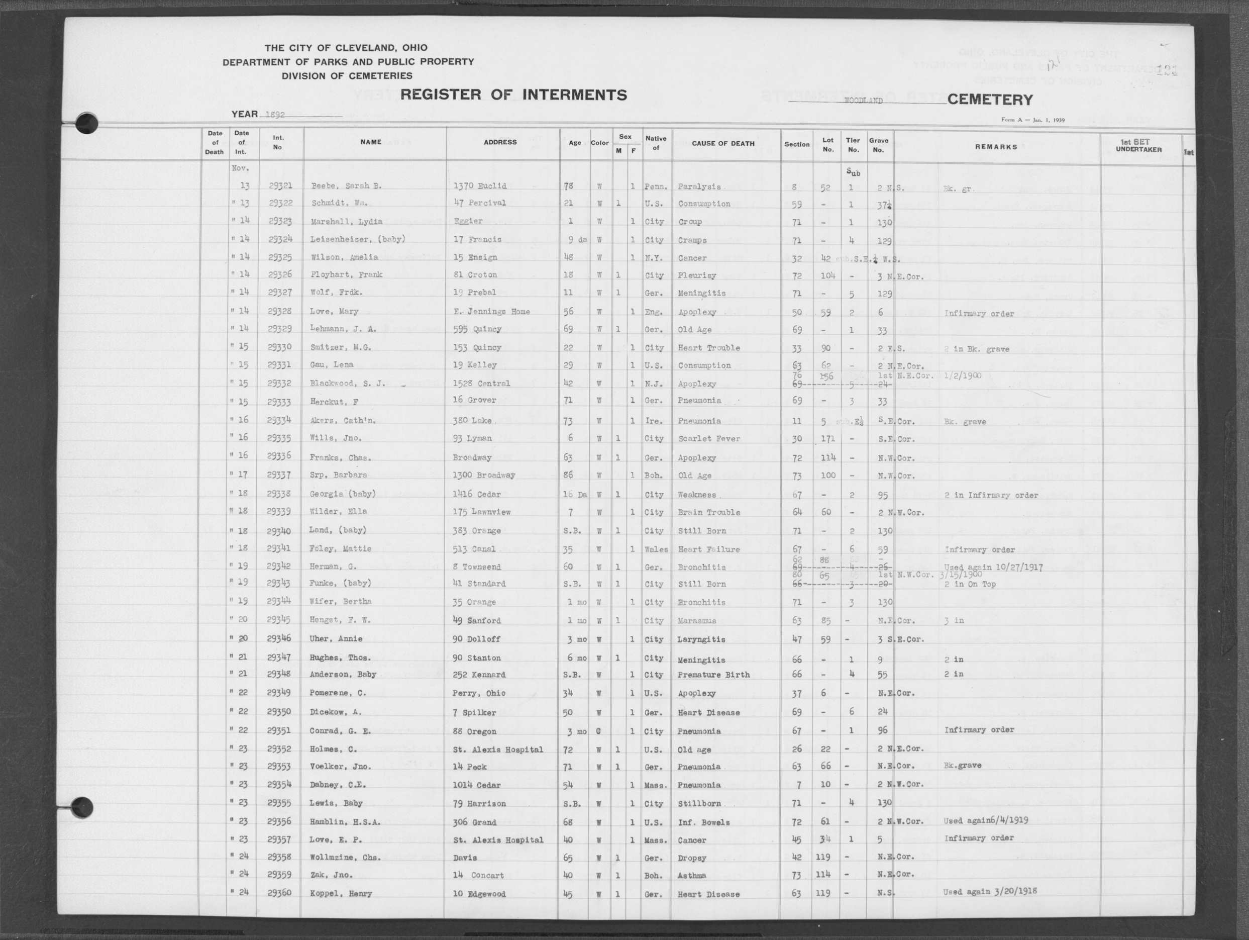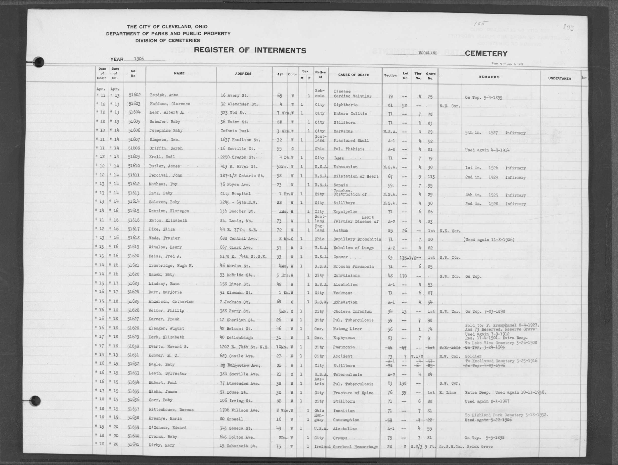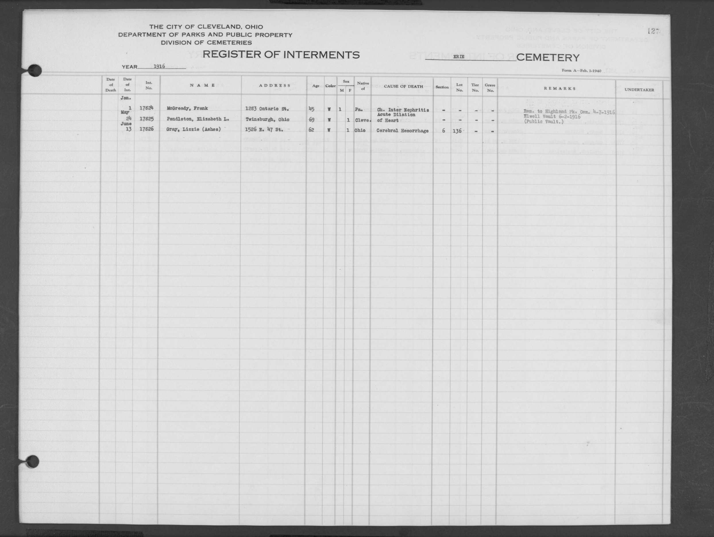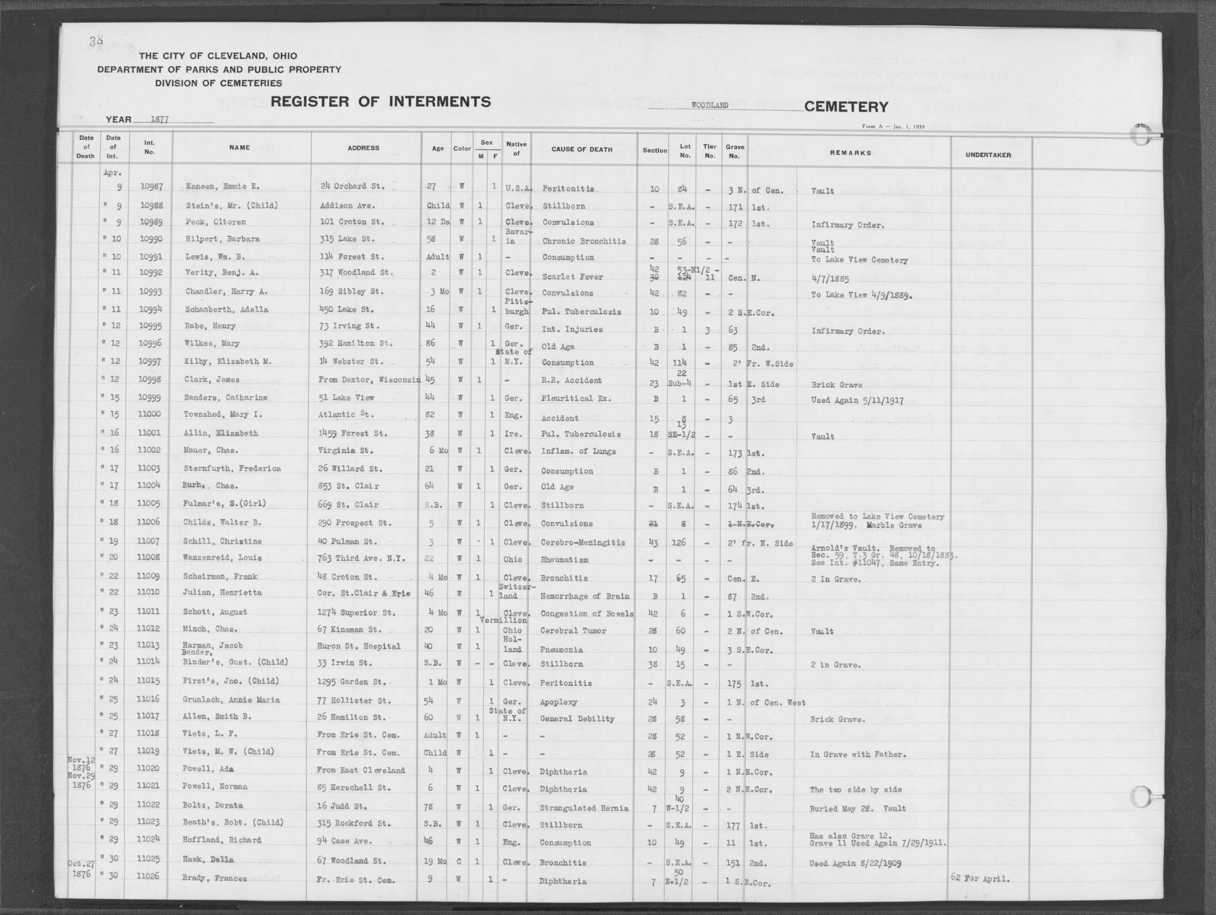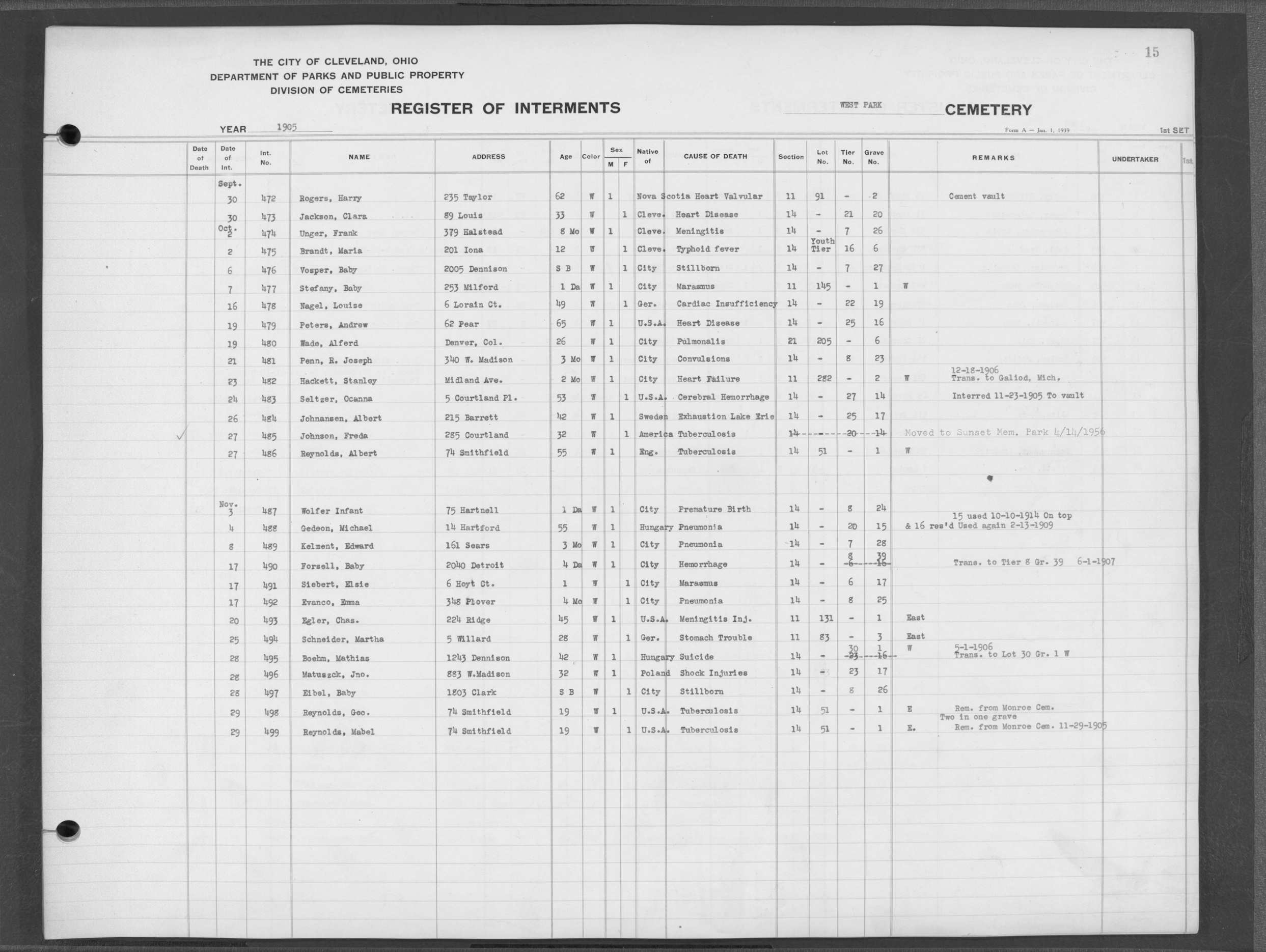 | West Park | 1 | 39 | Apr | 26 | 1909 | 1243 | Perkins, Mary A | 2d | W | F | ||||