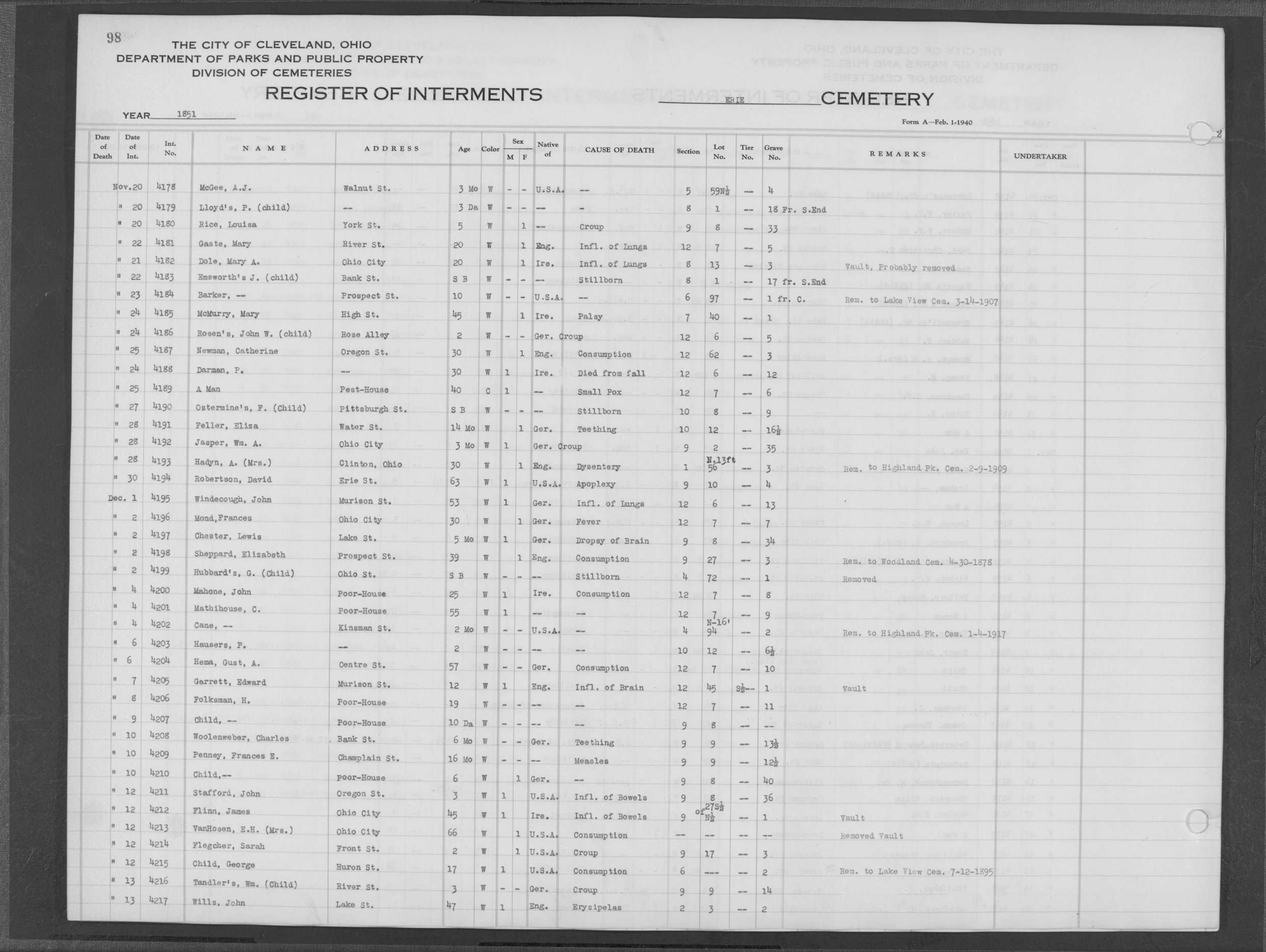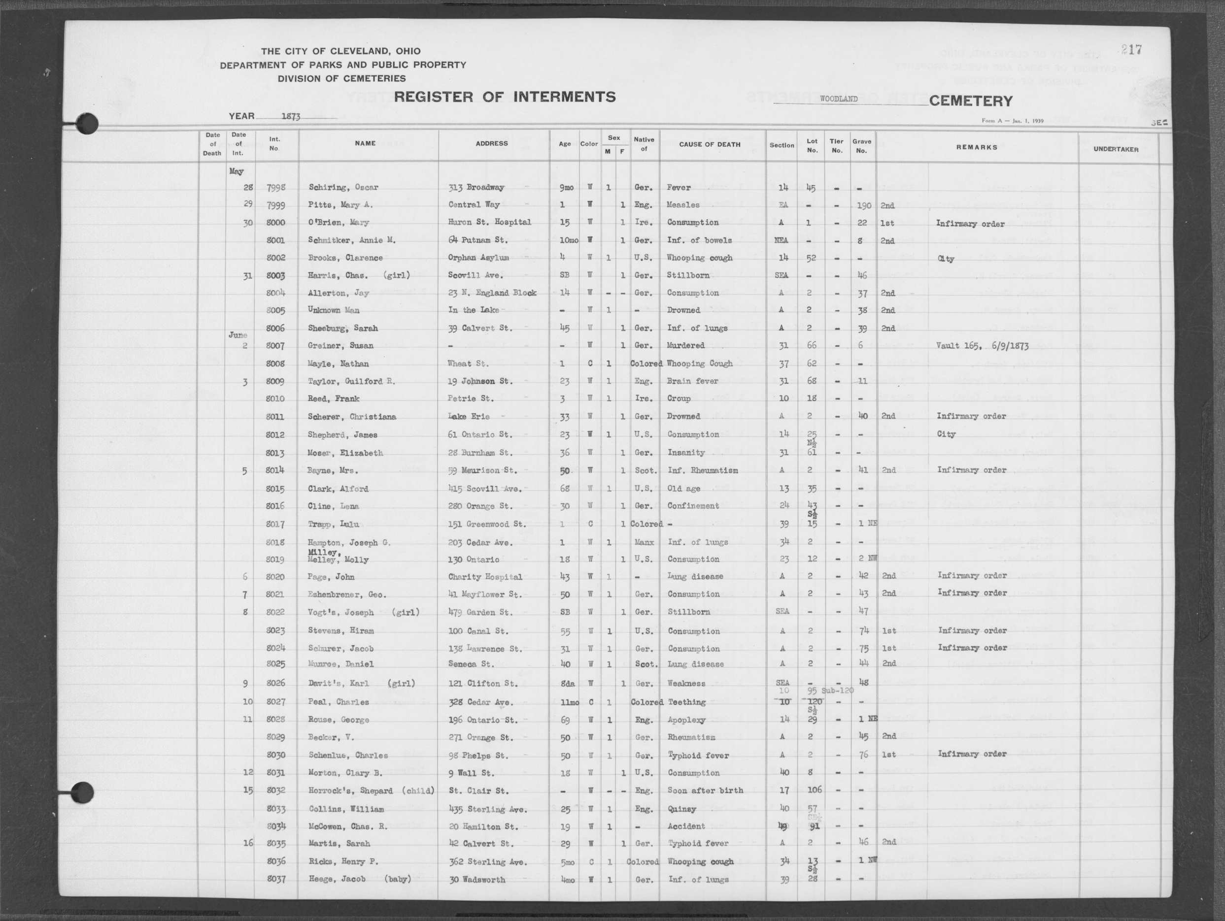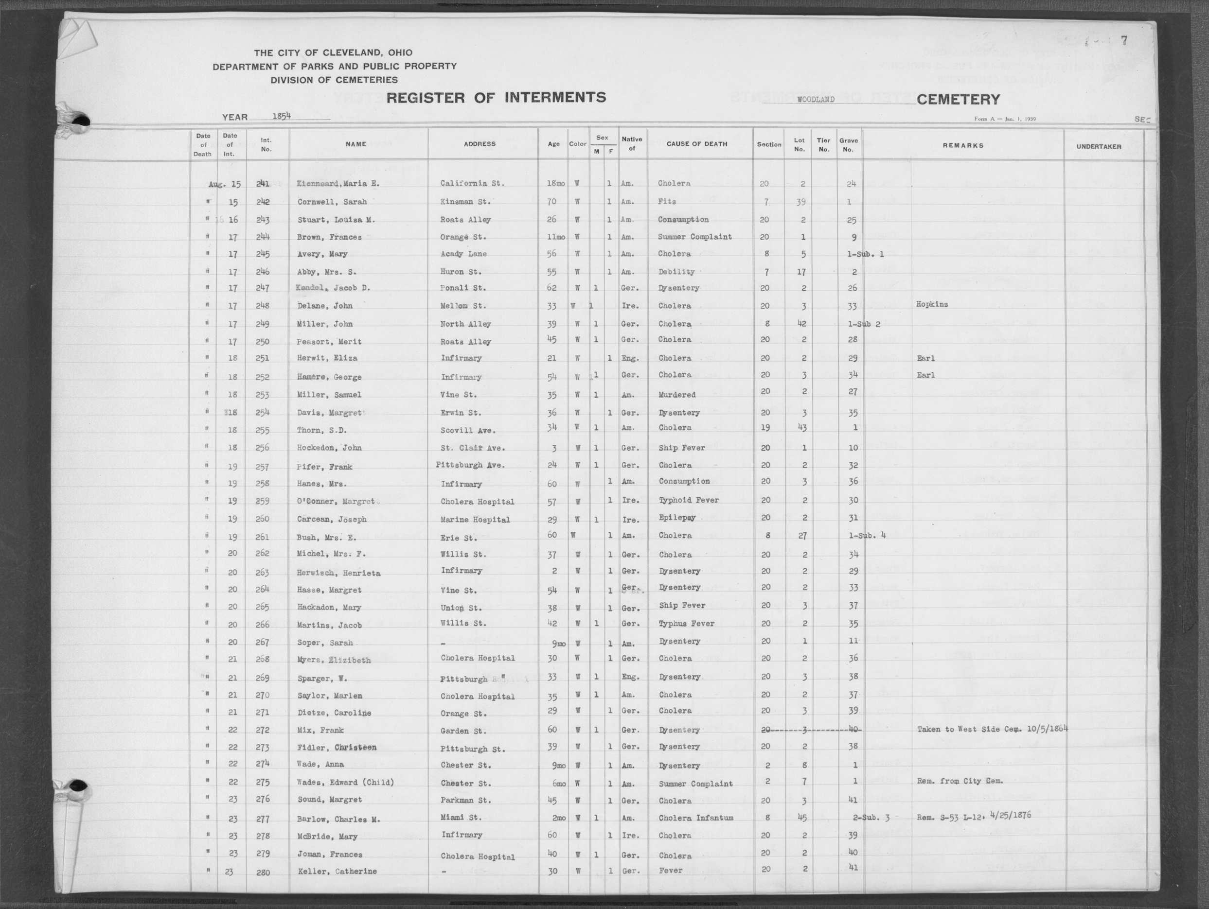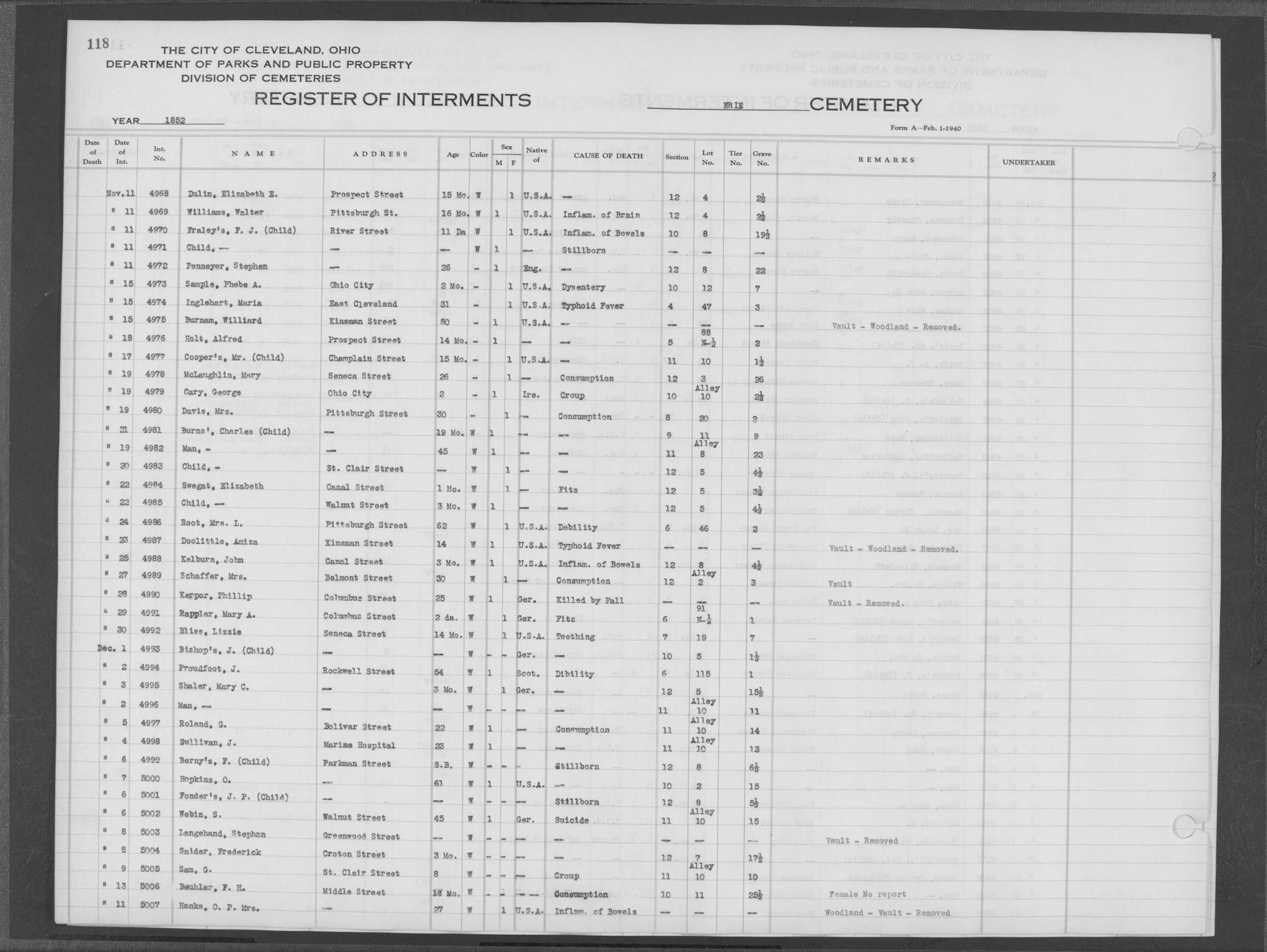 | Erie Street | 1 | 124 | May | 28 | 1853 | 5218 | Perkins, Olive V | 10y | W | F | ||||
