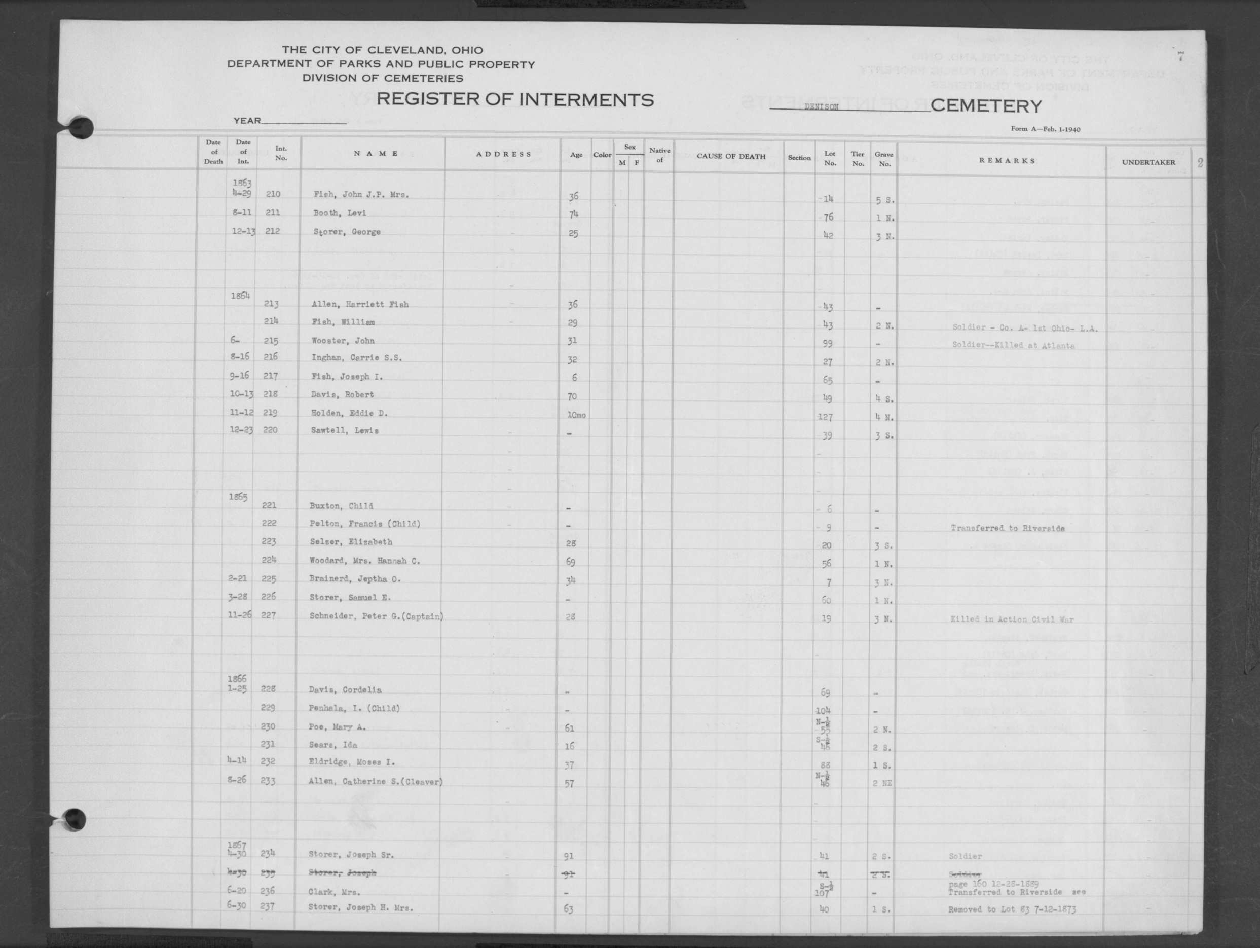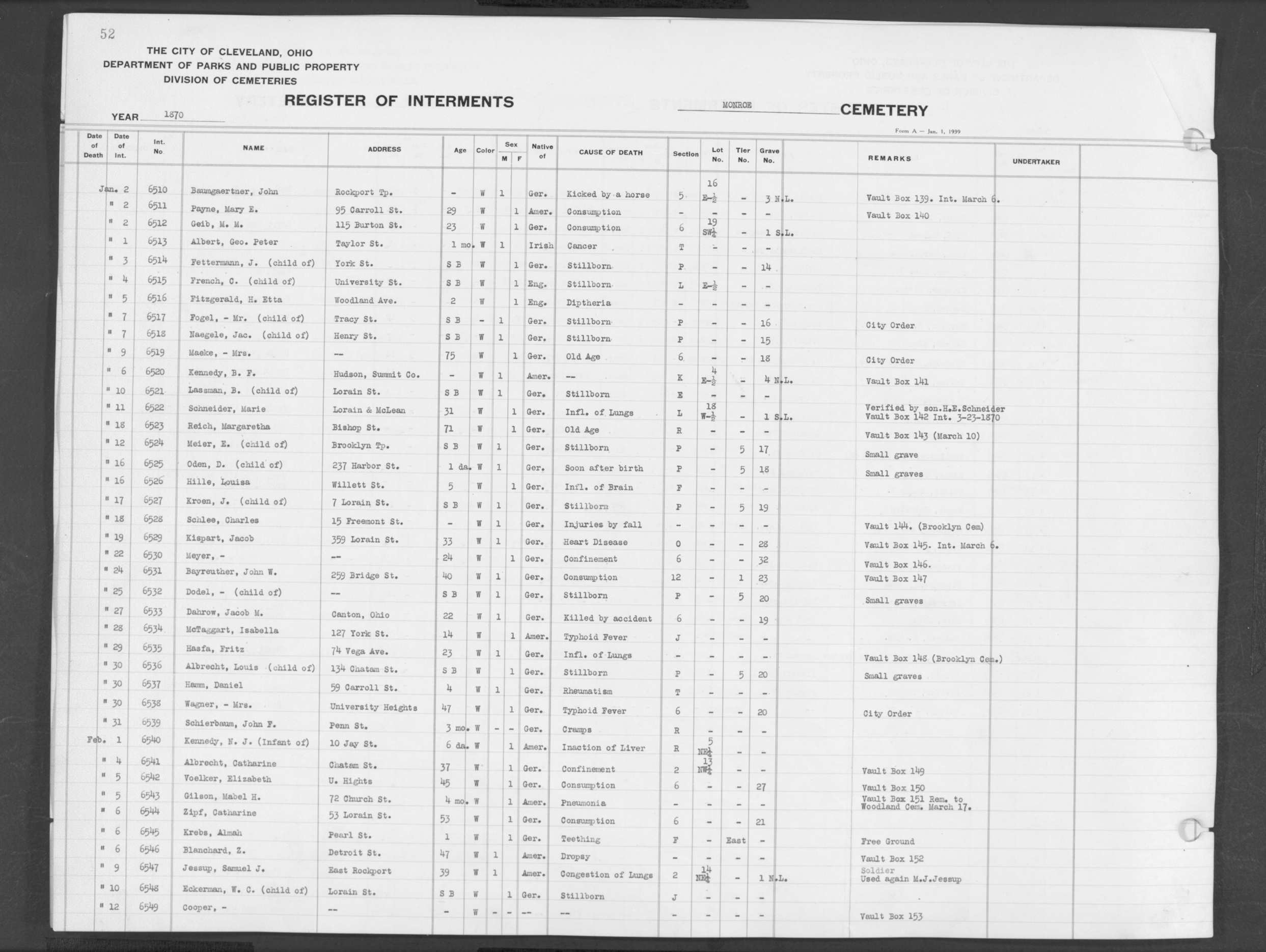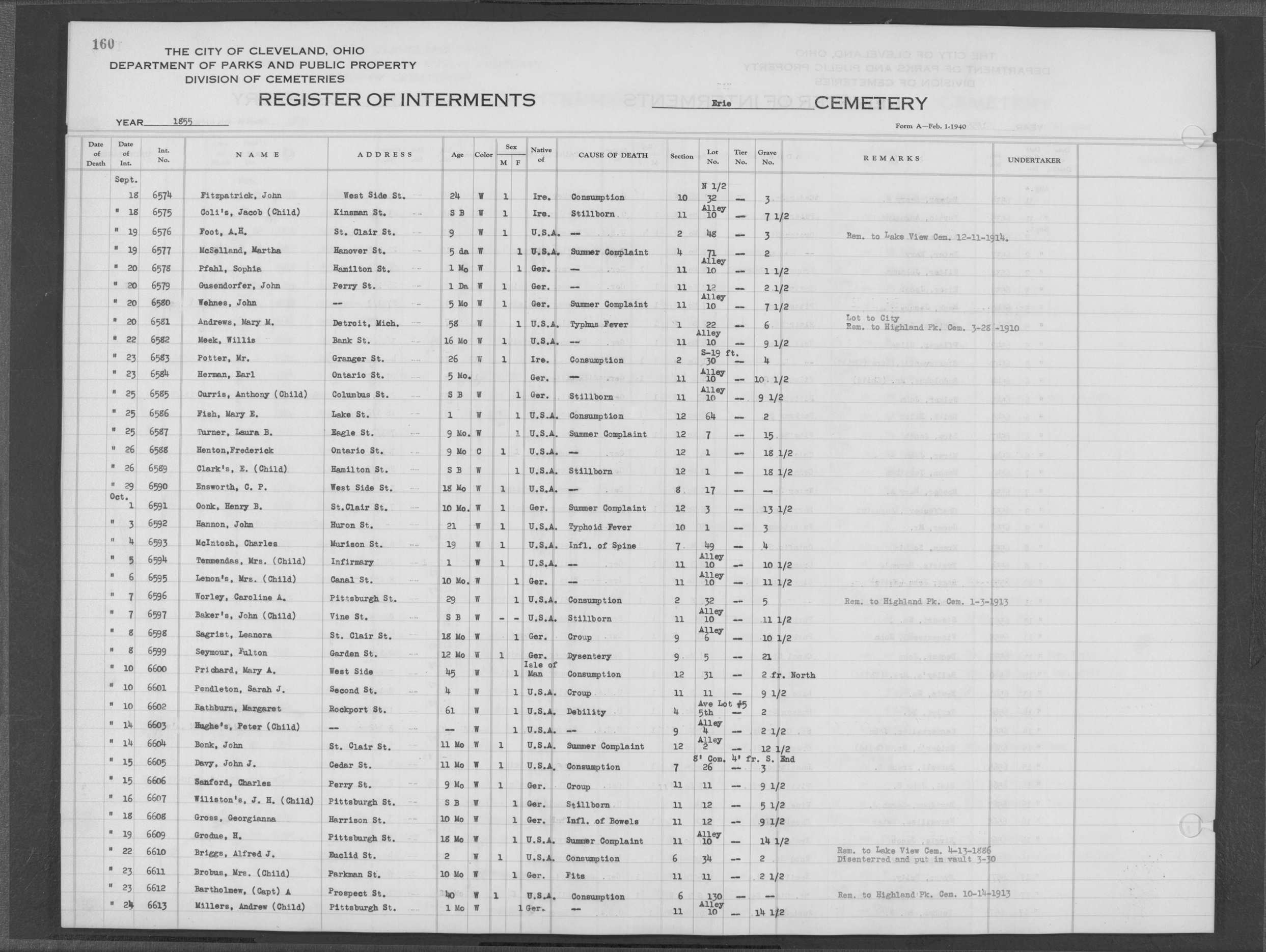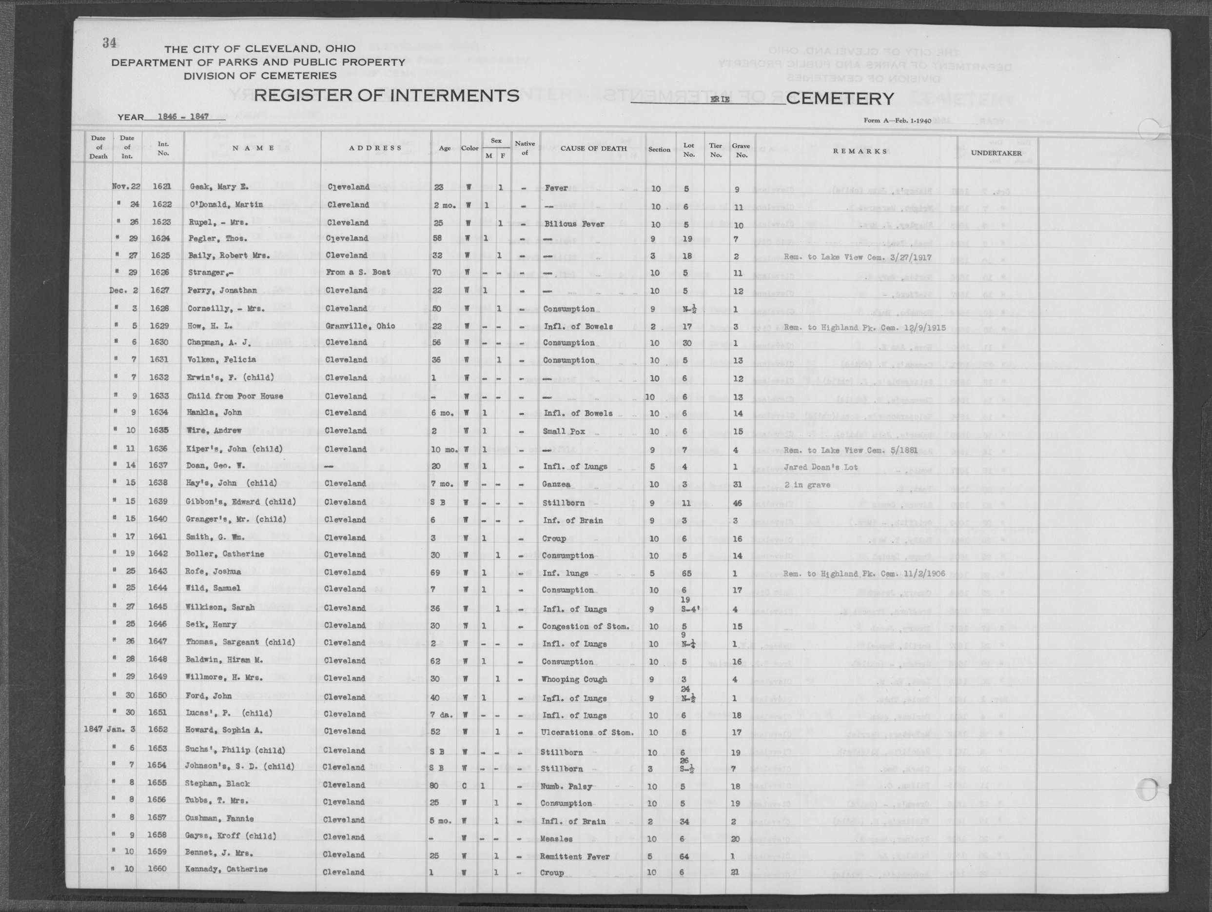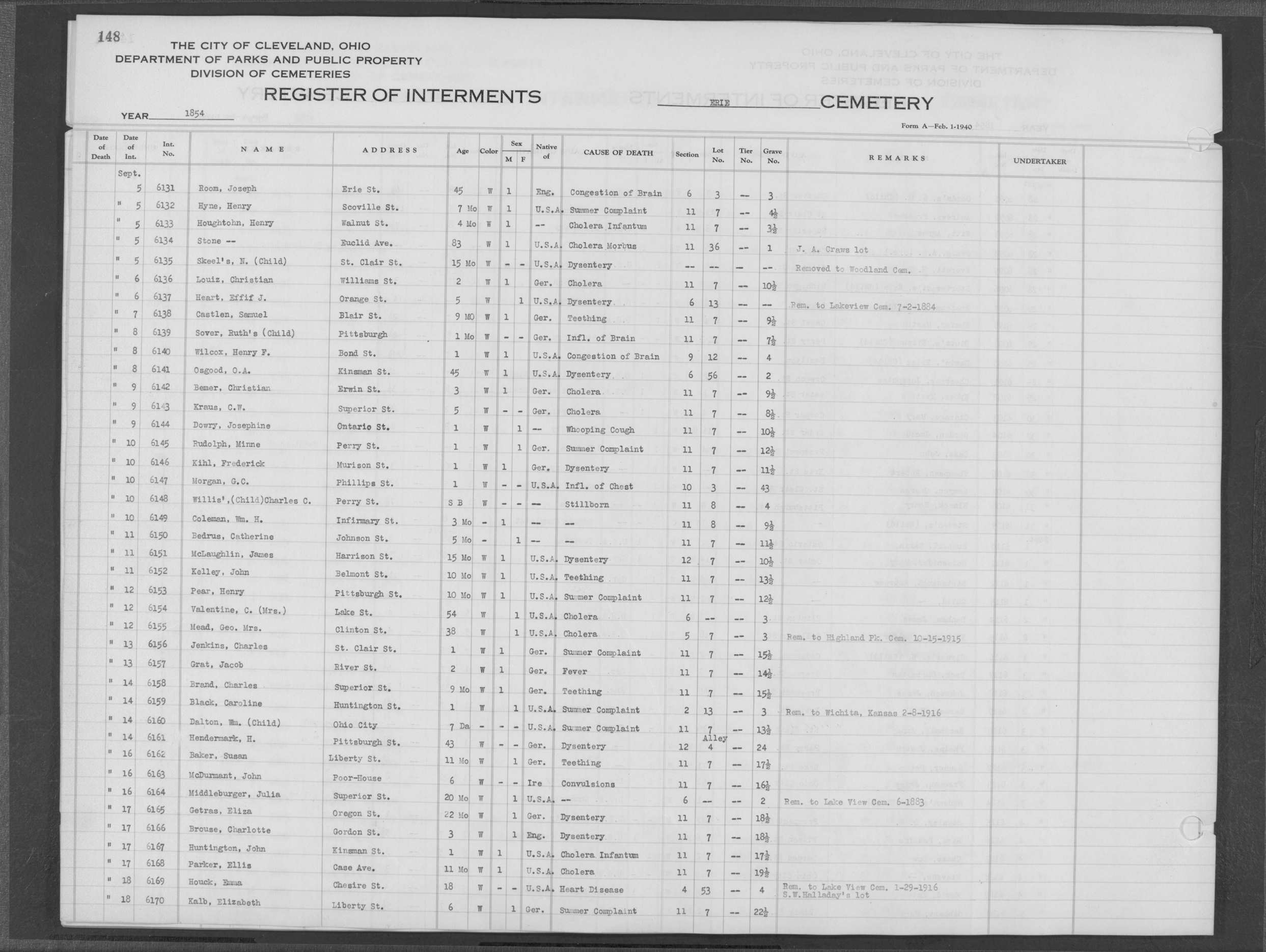 | Erie Street | 1 | 124 | May | 28 | 1853 | 5218 | Perkins, Olive V | 10y | W | F | ||||