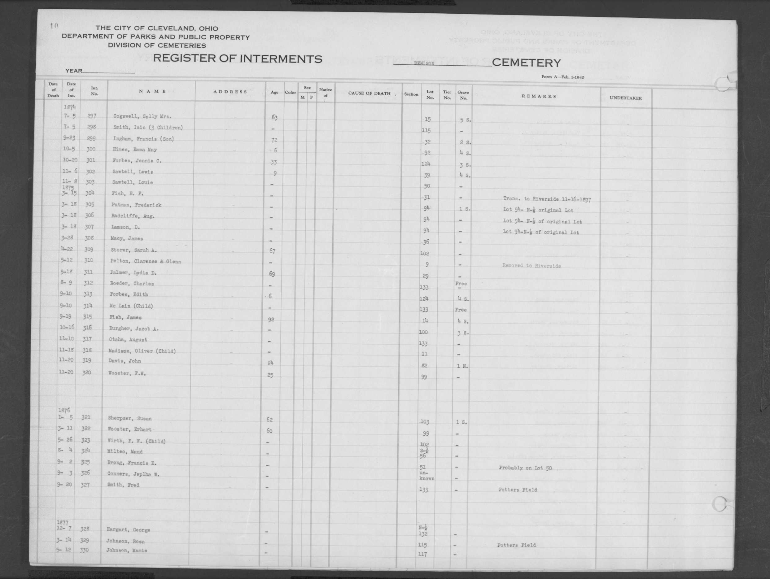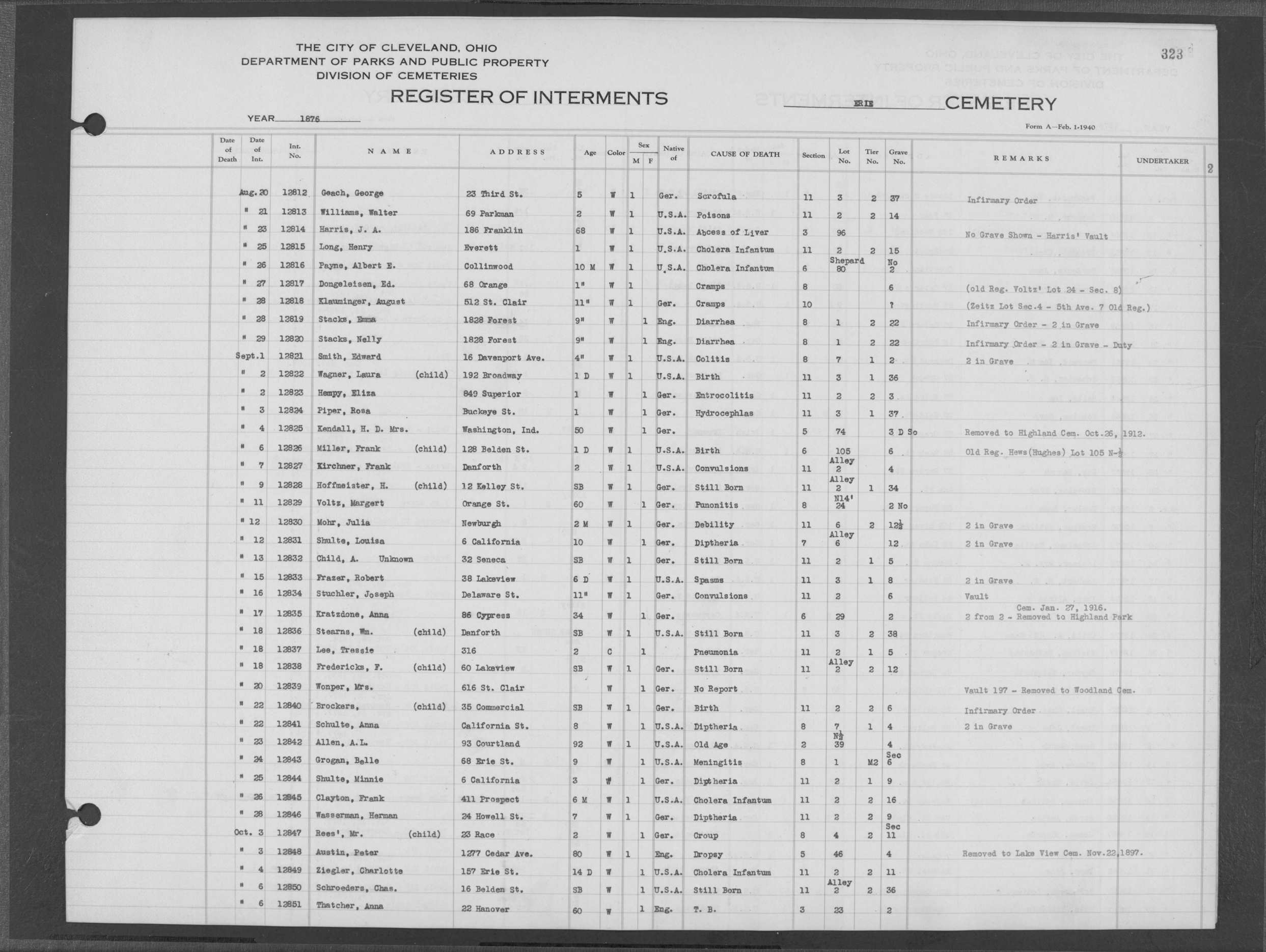 | Erie Street | 1 | 323 | Aug | 26 | 1876 | 12816 | Payne, Albert E | 10m | W | M | ||||