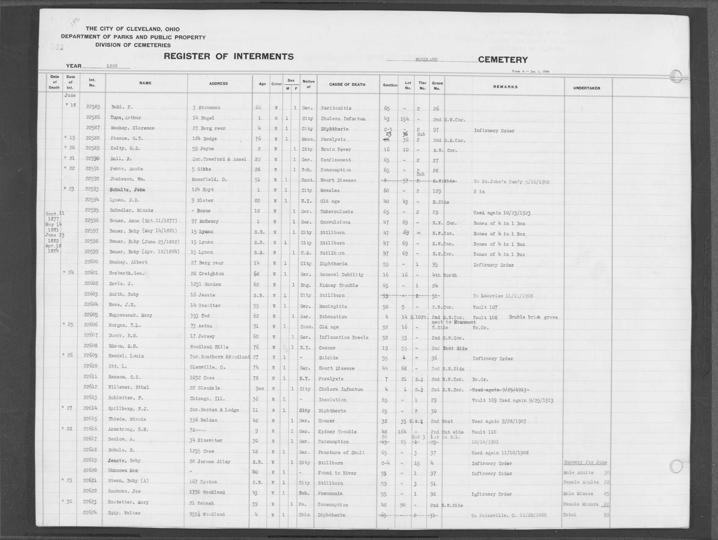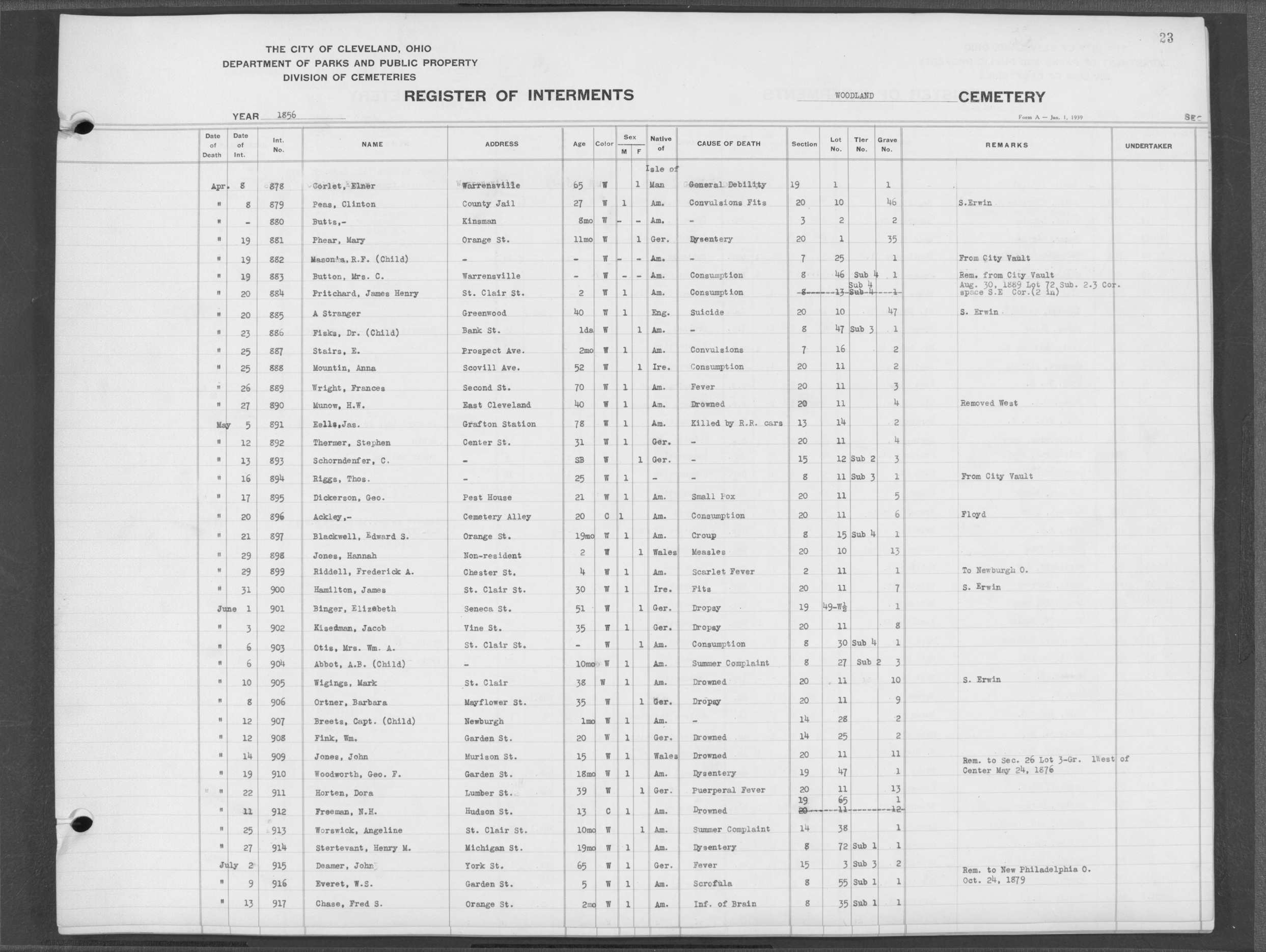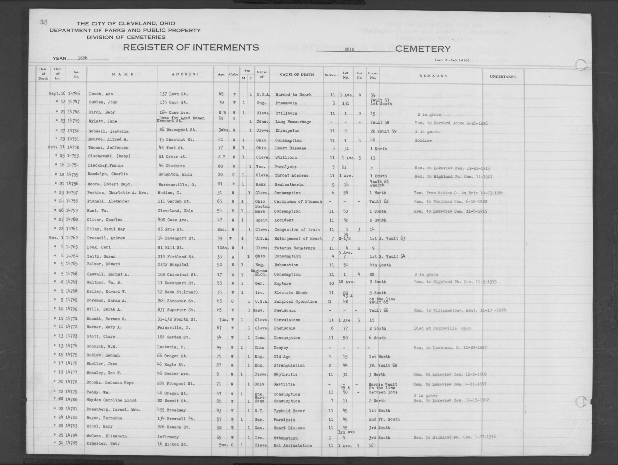 | Erie Street | 2 | 46 | Jul | 16 | 1888 | 15102 | Perkins, Minerva | 65y | W | F | ||||