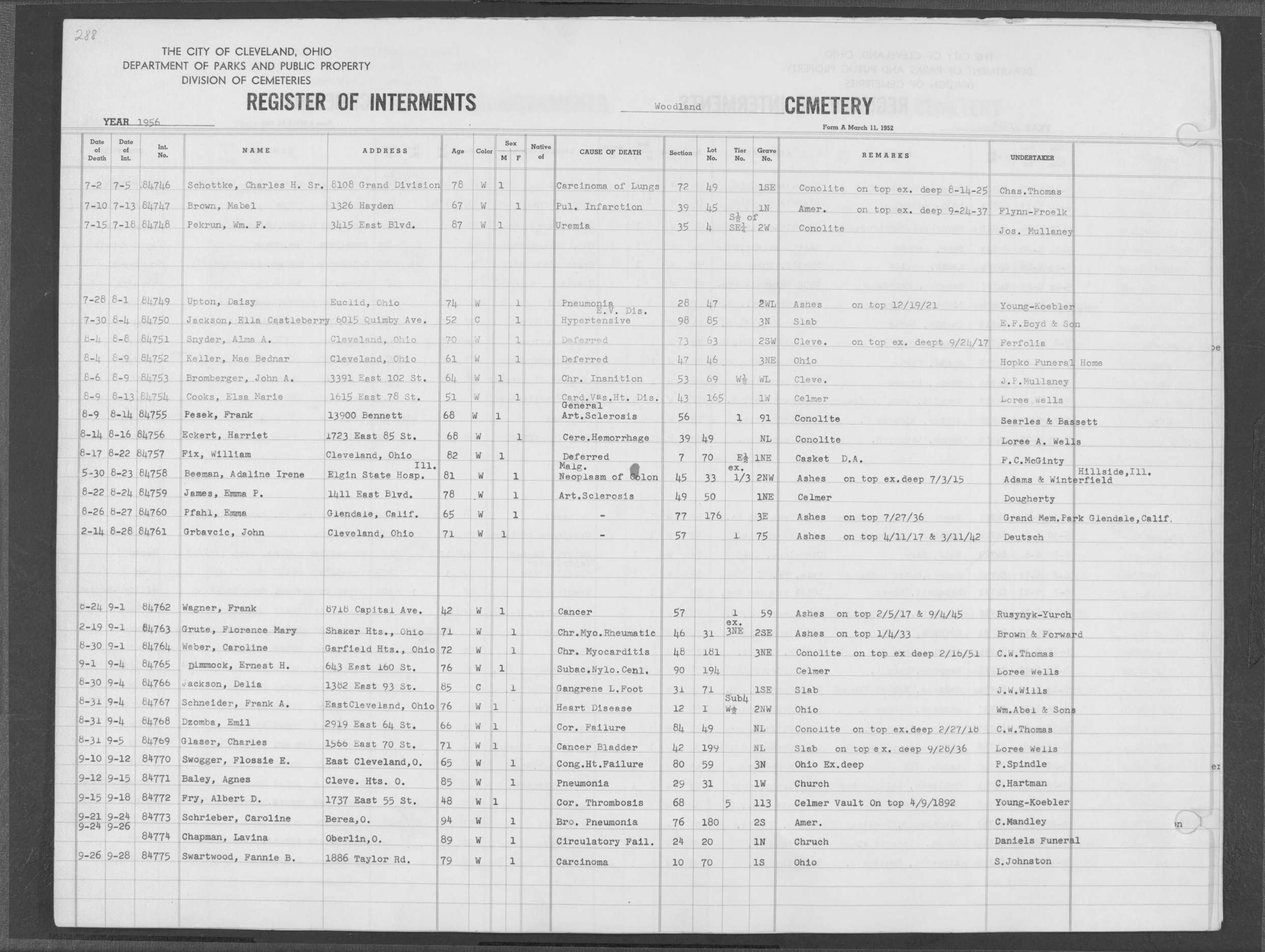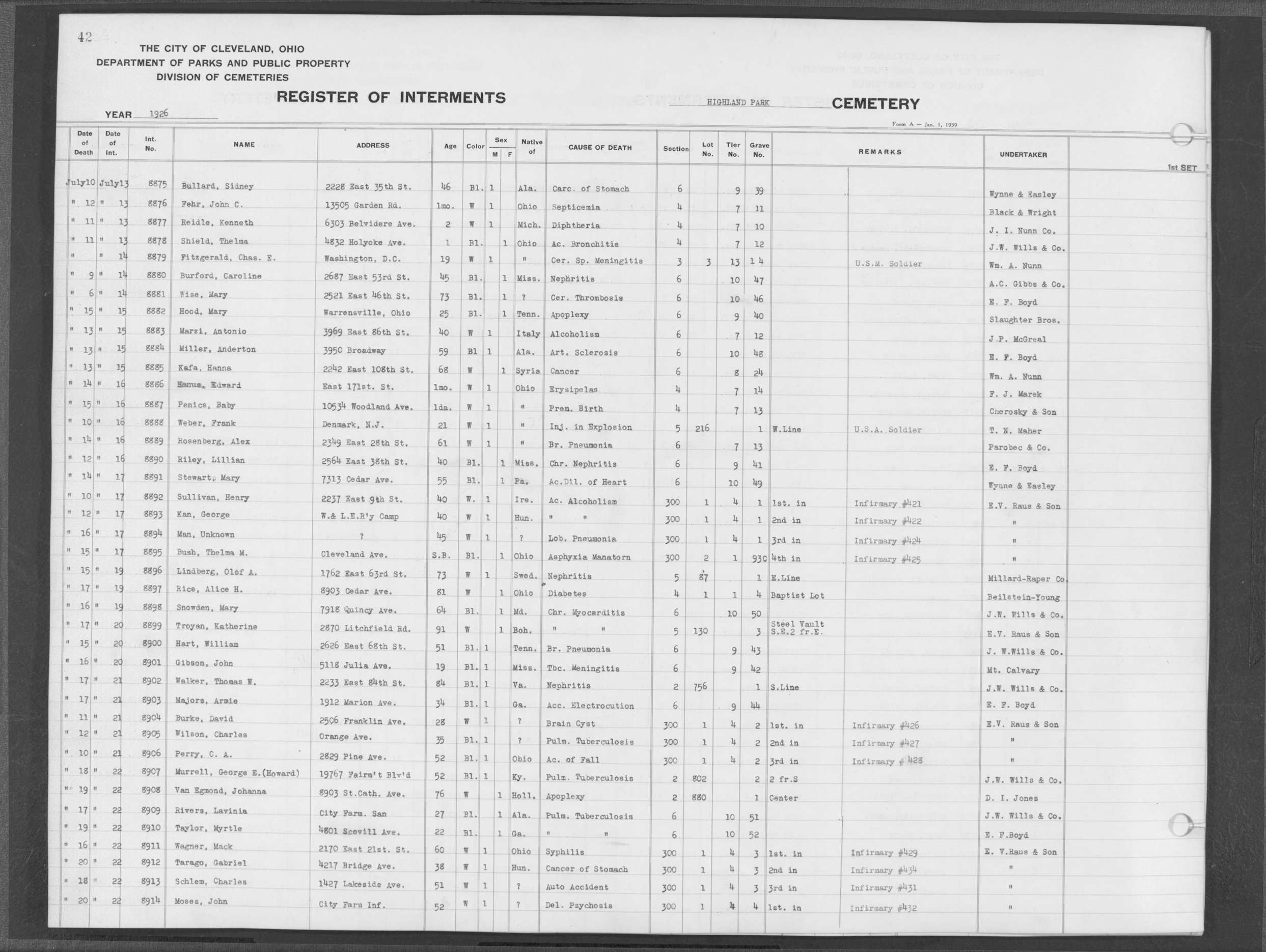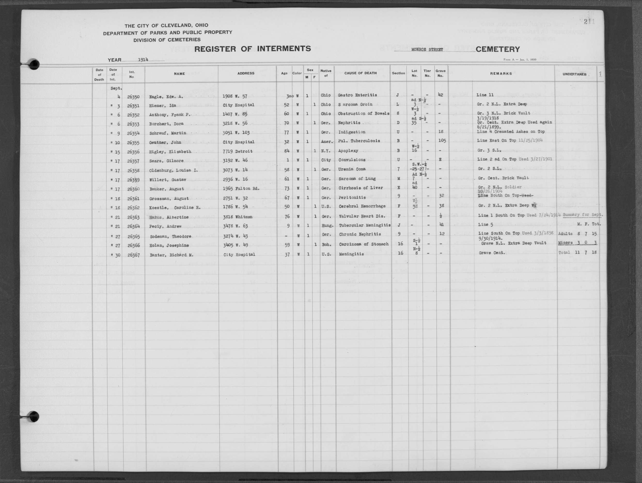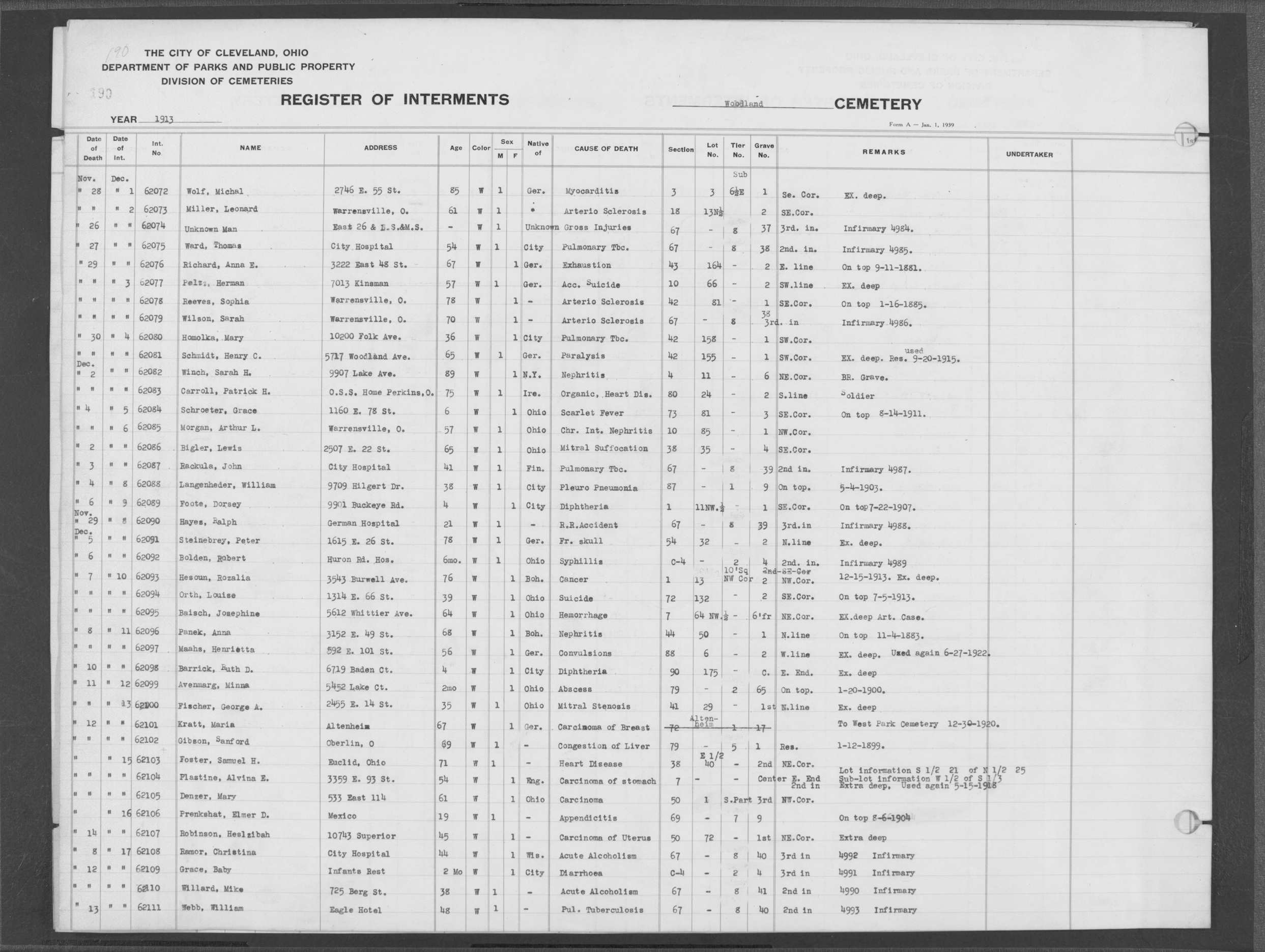 | Monroe Street | 3 | 198 | Aug | 6 | 1913 | 26088 | Payel, Hermina | 83y | W | F | ||||