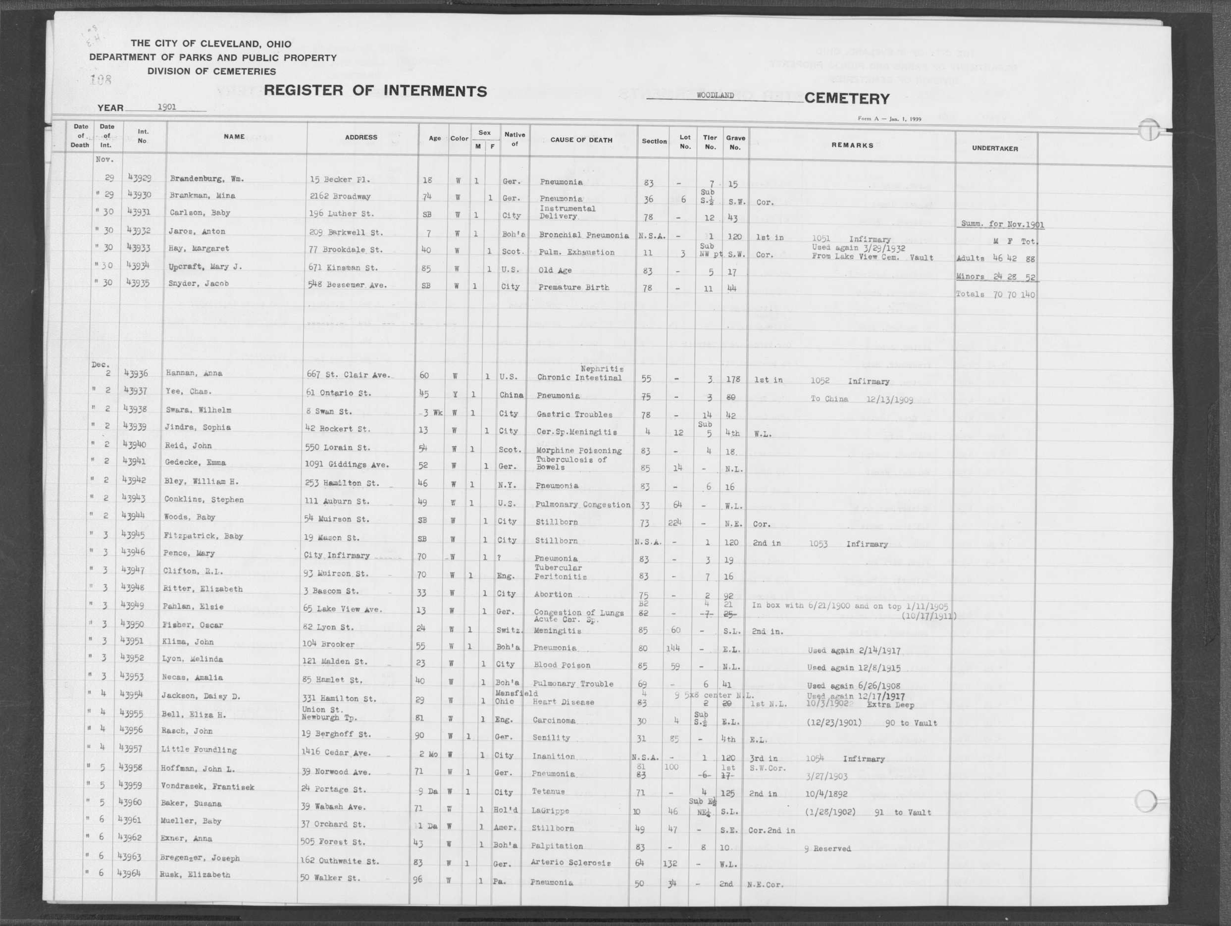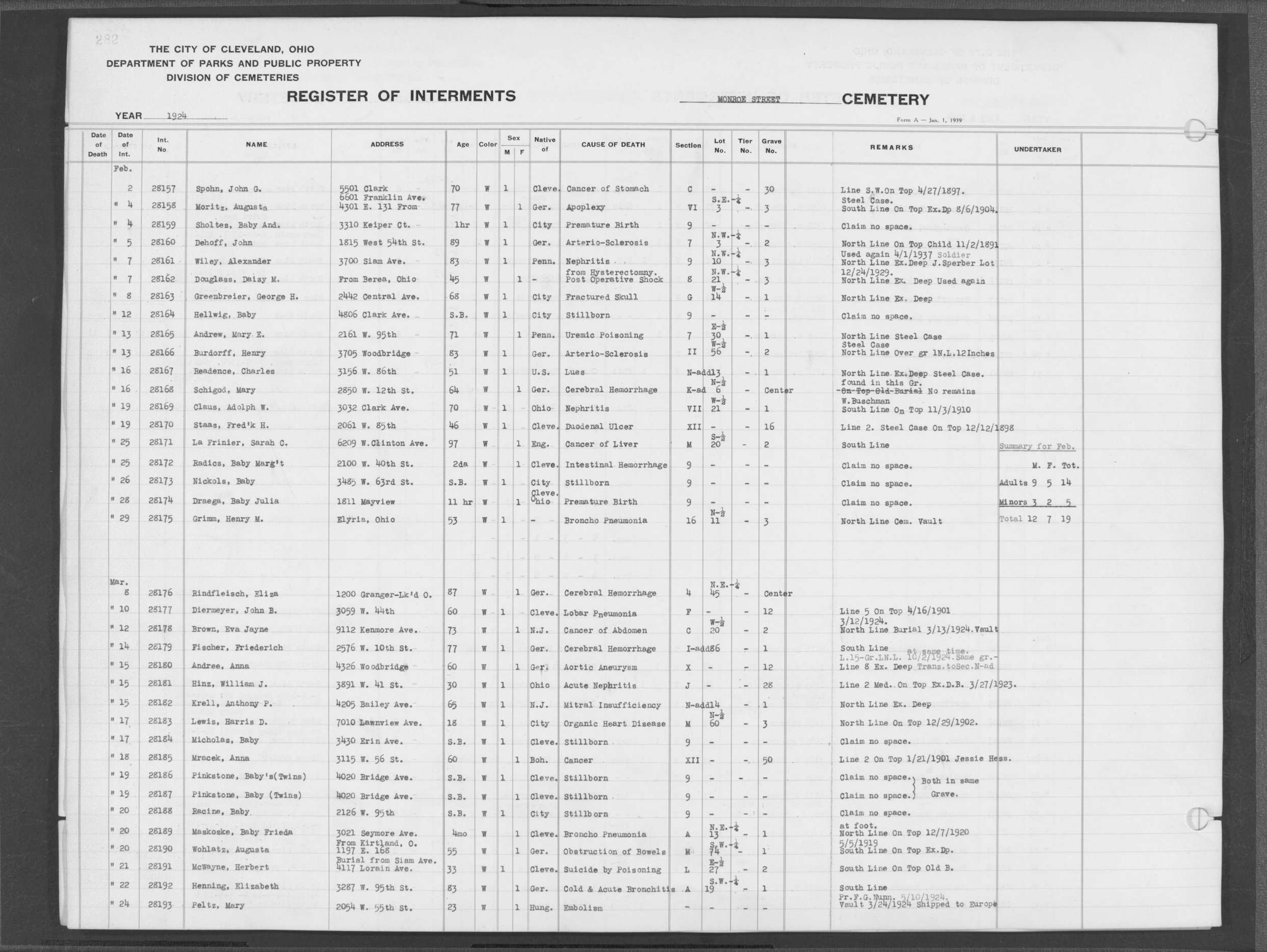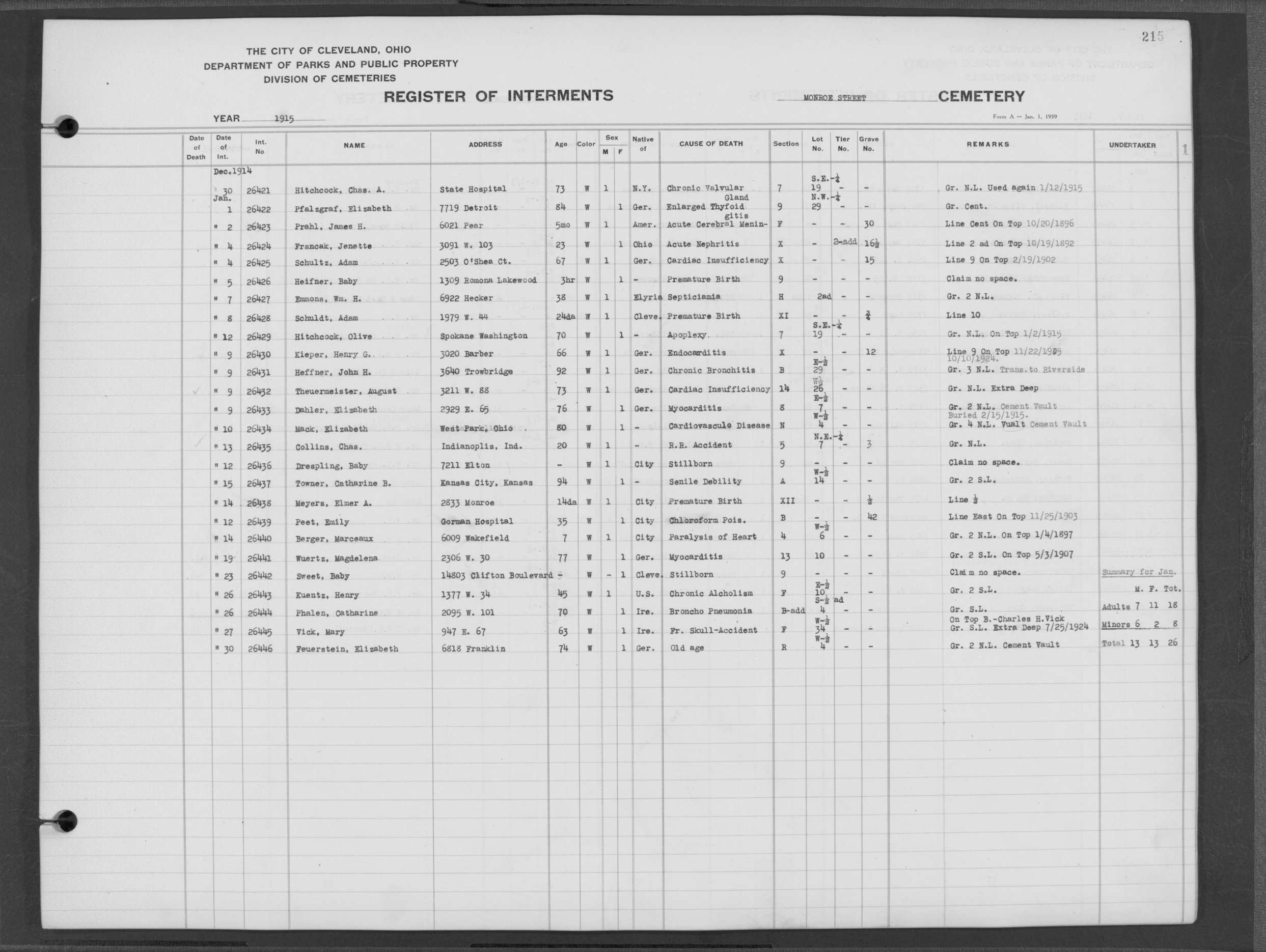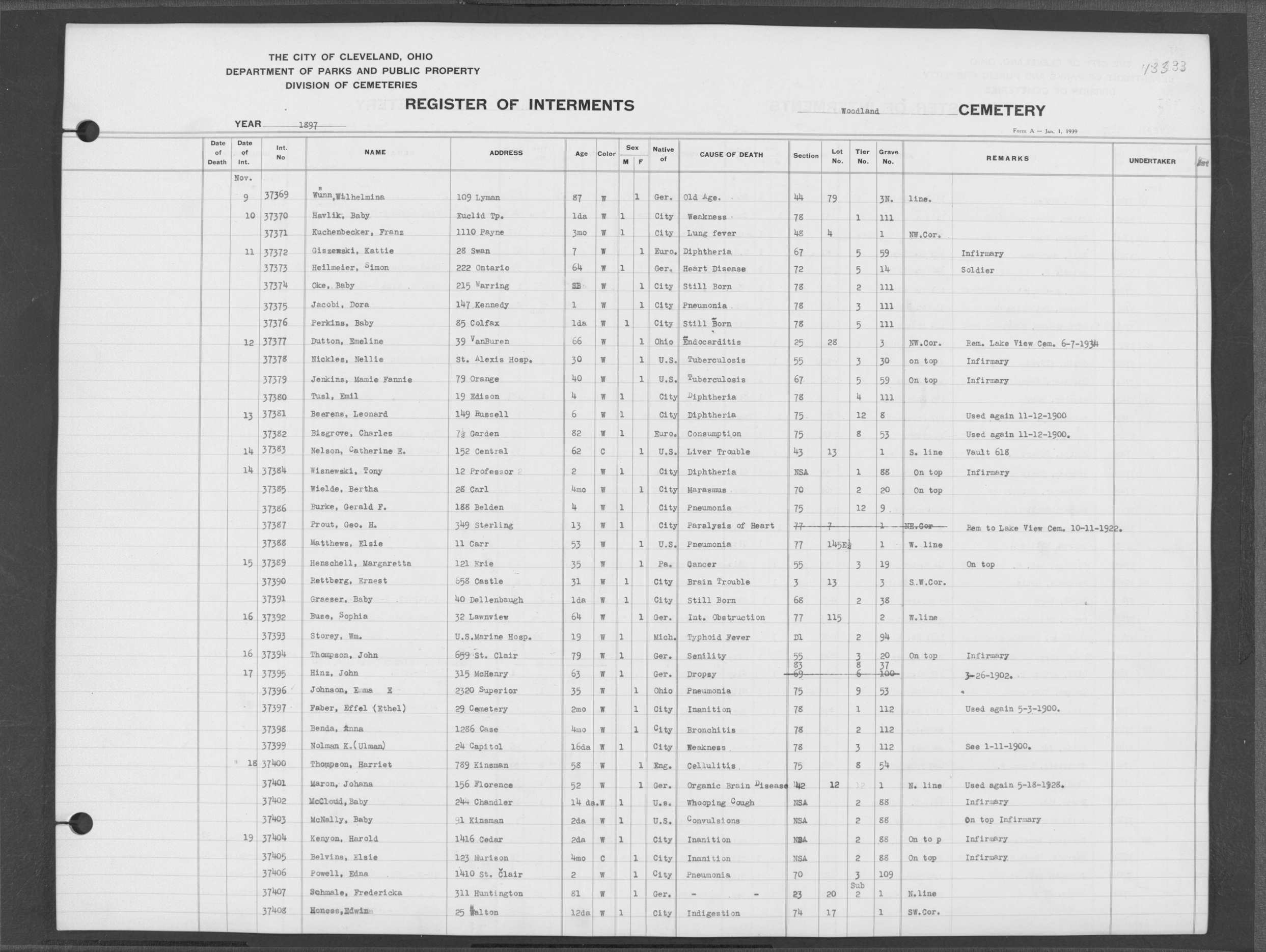 | Monroe Street | 3 | 198 | Aug | 6 | 1913 | 26088 | Payel, Hermina | 83y | W | F | ||||