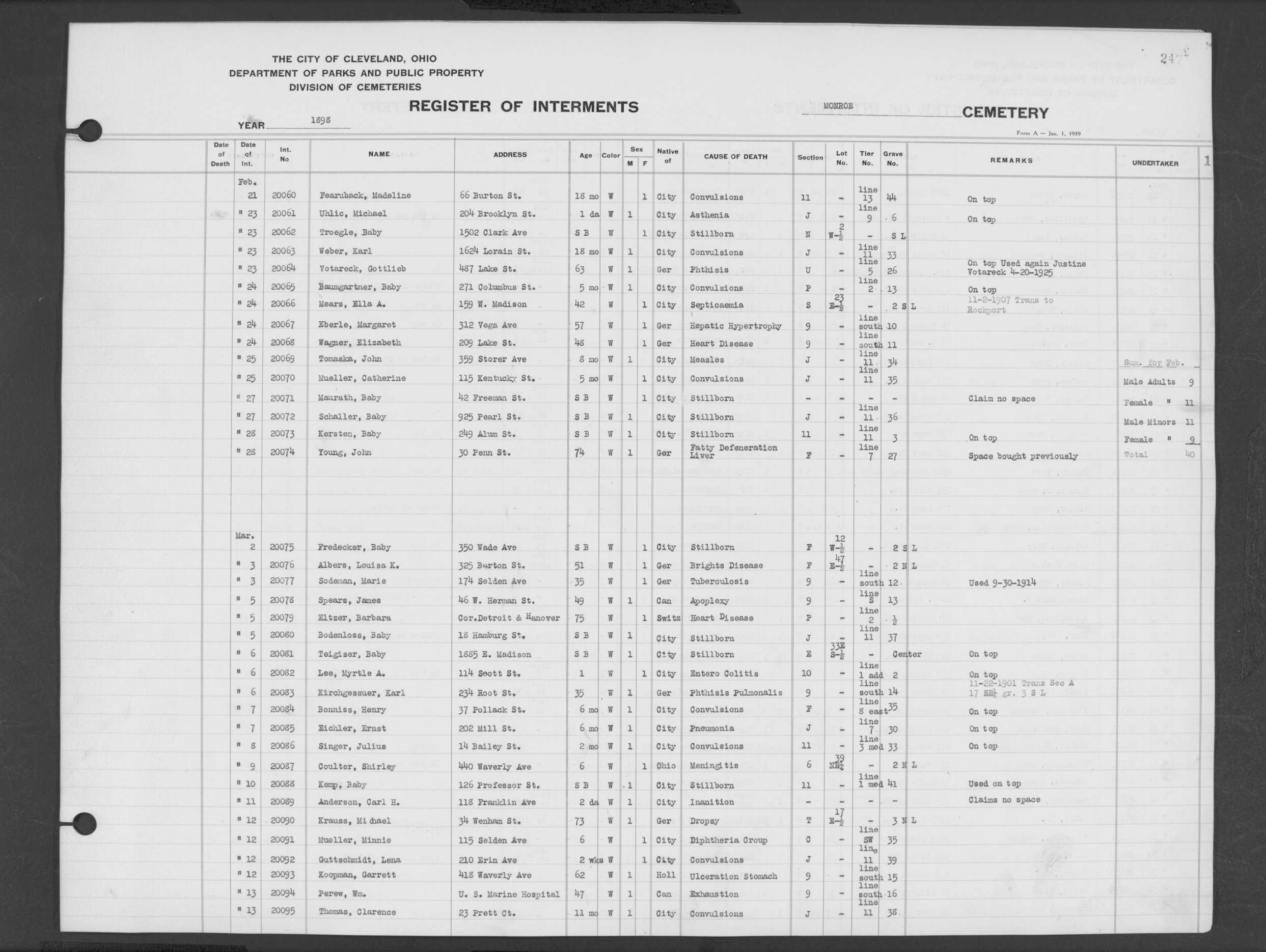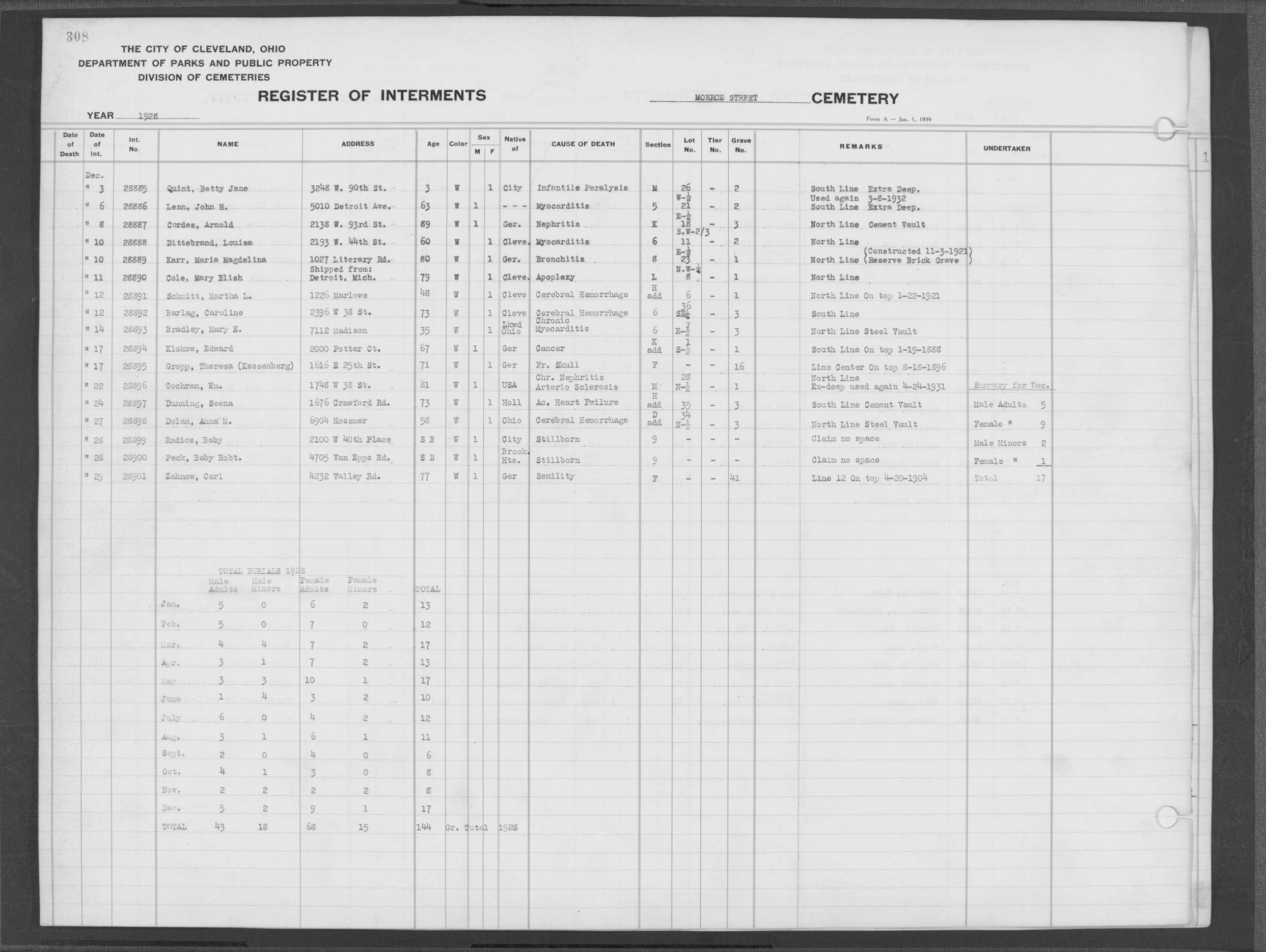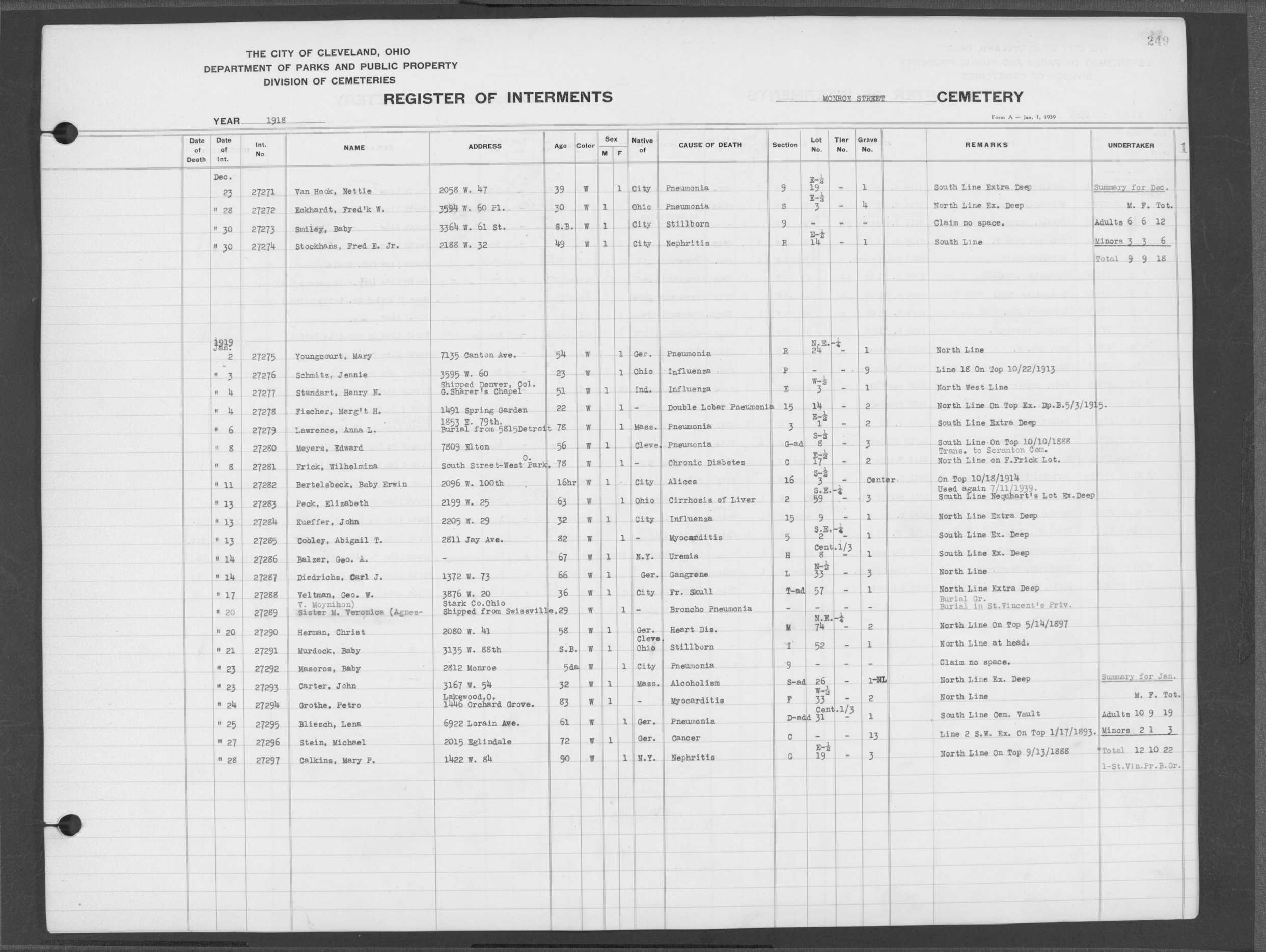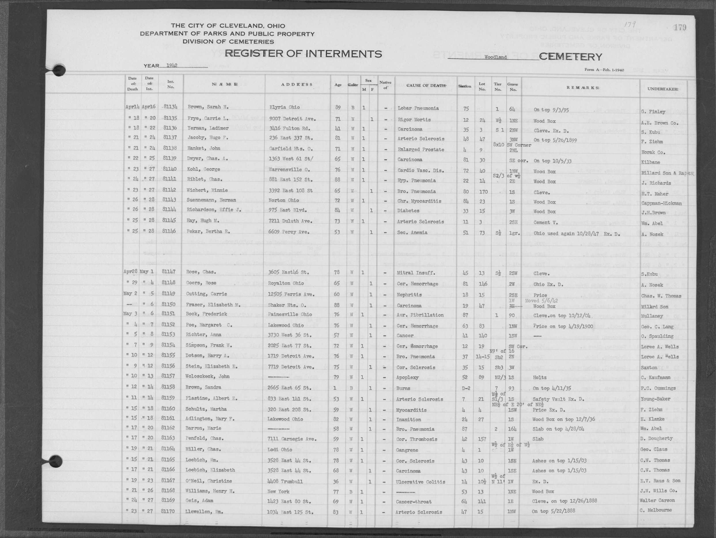 | Monroe Street | 3 | 198 | Aug | 6 | 1913 | 26088 | Payel, Hermina | 83y | W | F | ||||