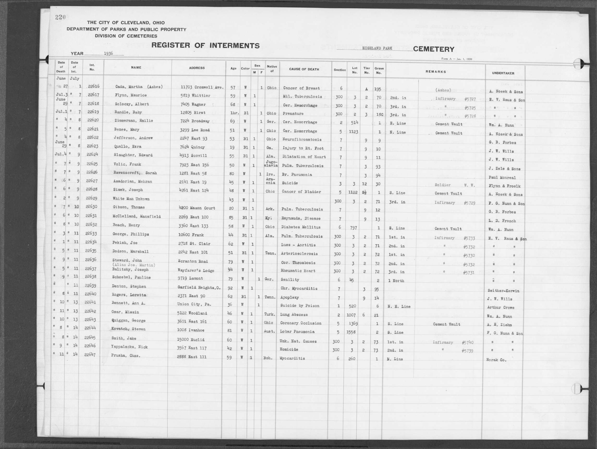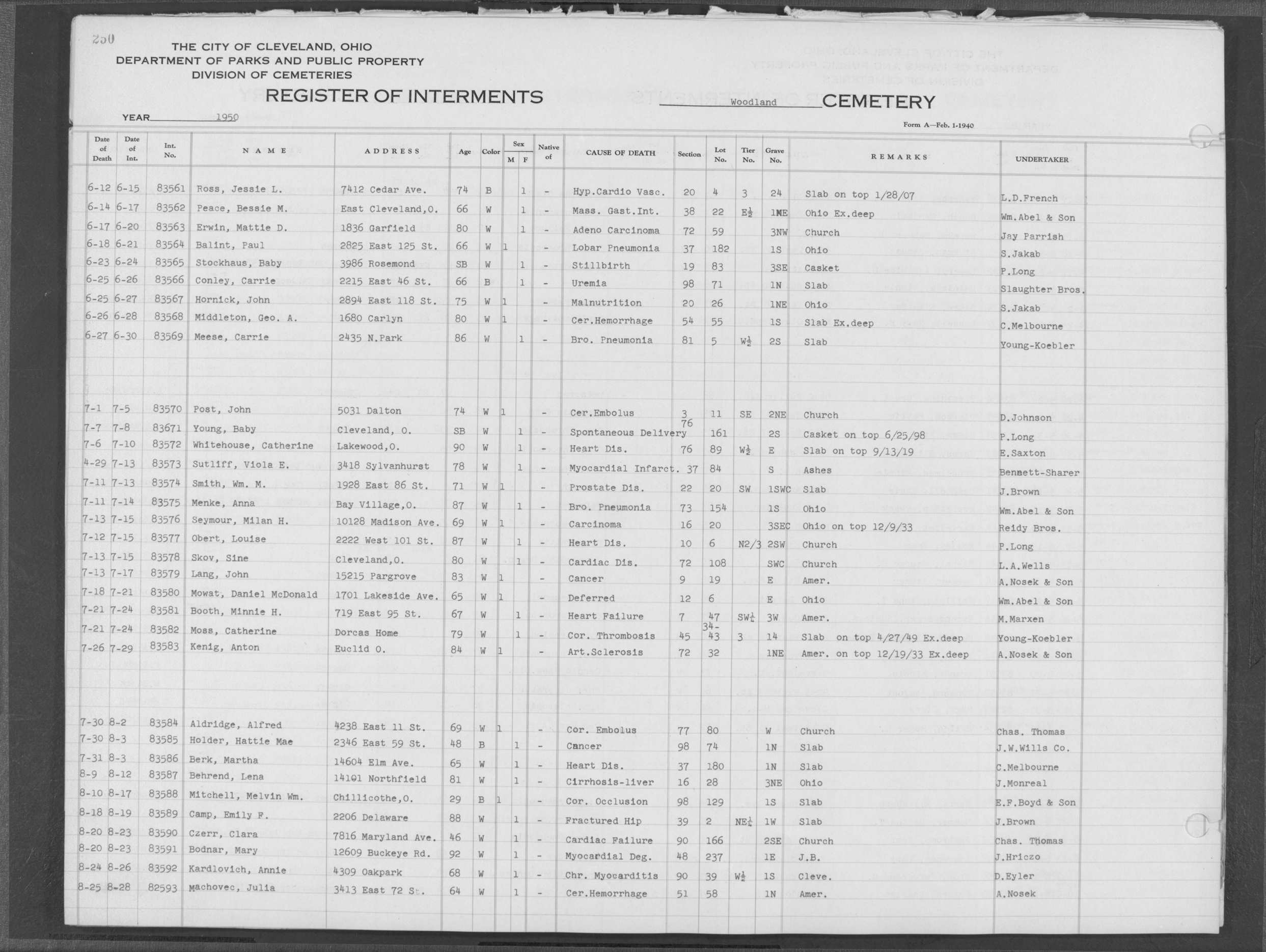 | Highland Park | 5 | 114 | Mar | 1950 | Mar | 30 | 1950 | 37276 | Payne, Blena | 58y | B | F | ||