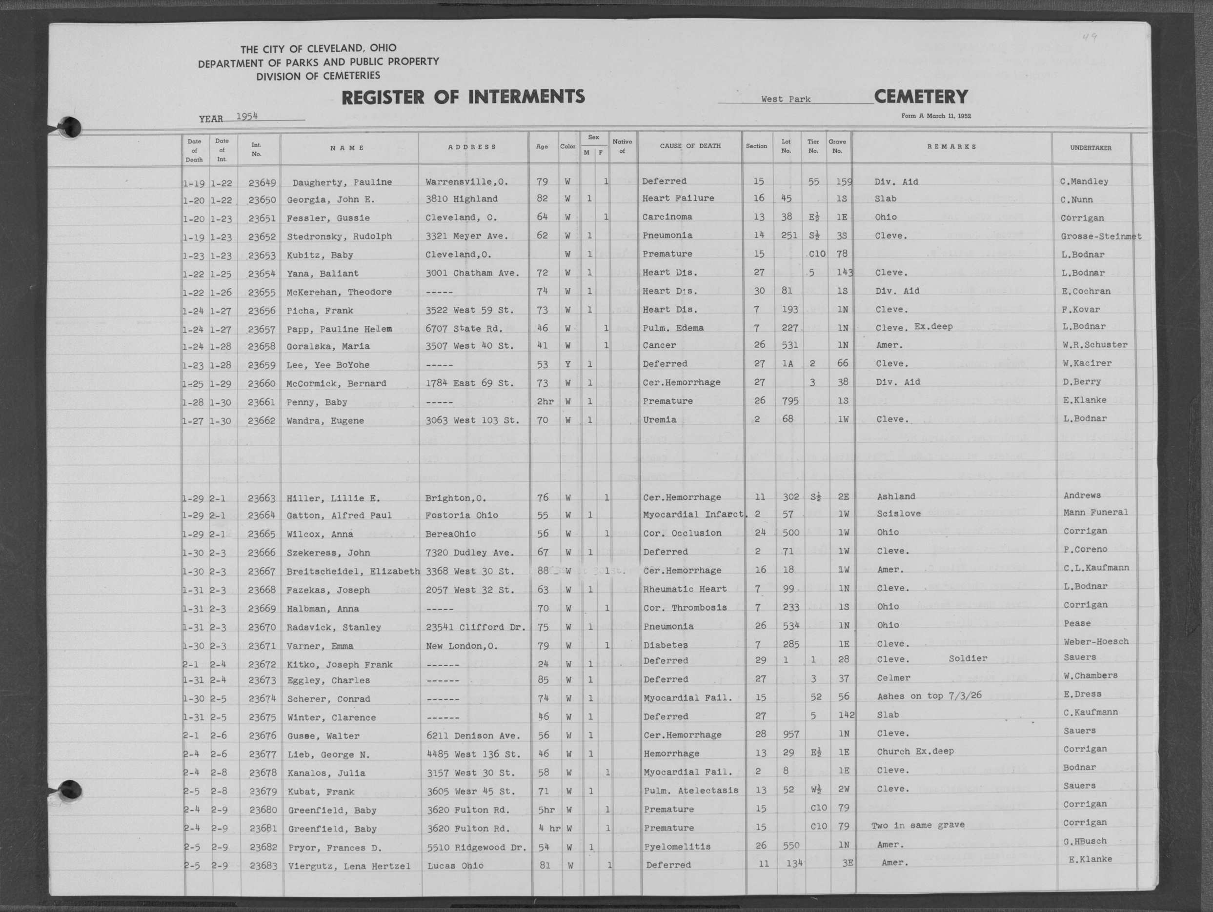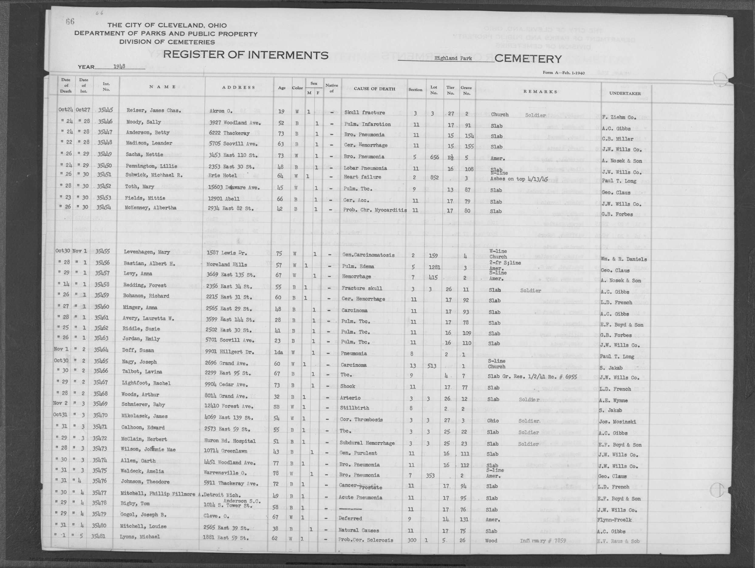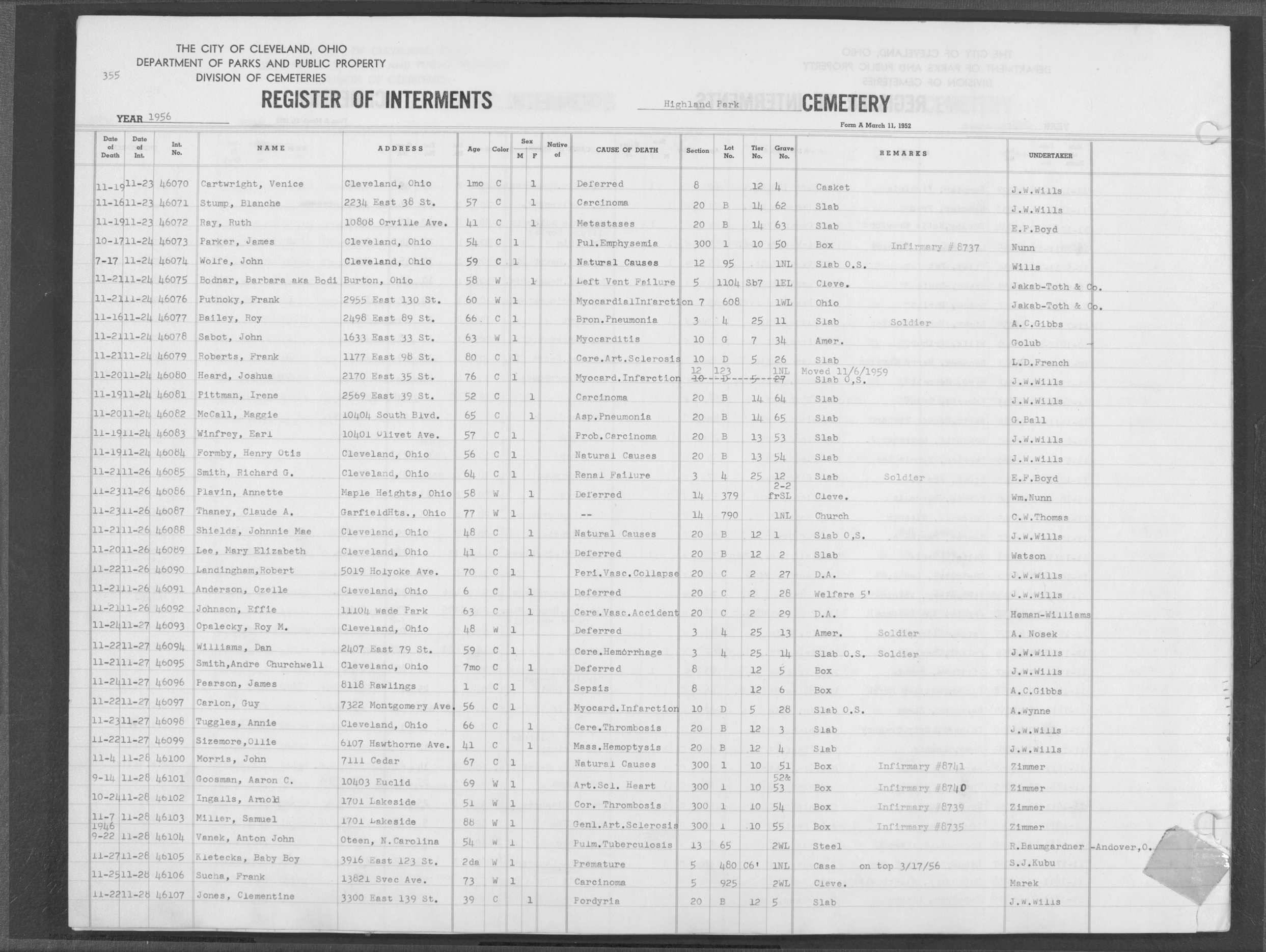 | Highland Park | 5 | 271 | Nov | 5 | 1954 | Nov | 10 | 1954 | 43019 | Perkins, Sadie | 55y | C | F | |