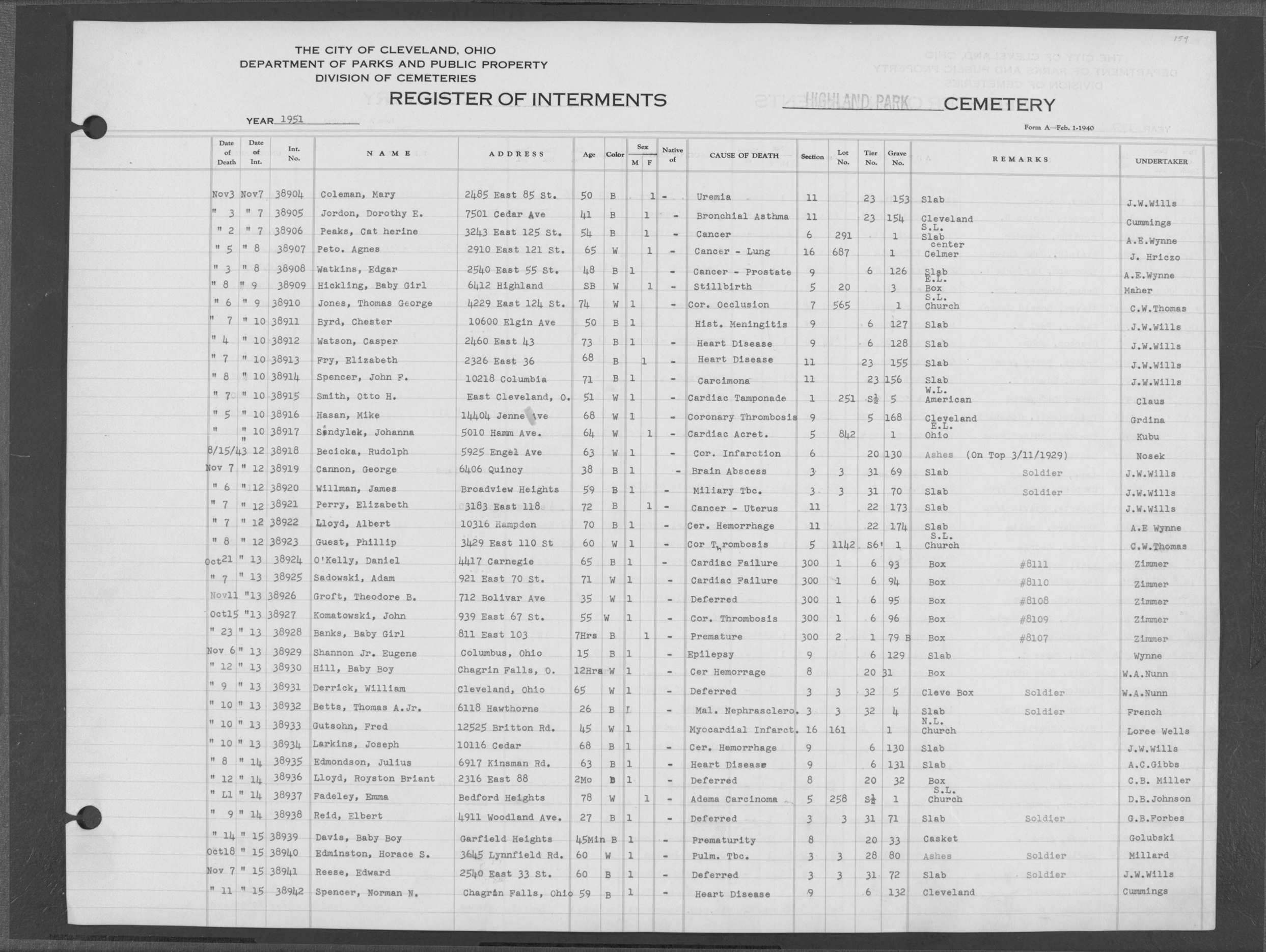 | Highland Park | 5 | 135 | Jan | 3 | 1951 | Jan | 6 | 1951 | 38026 | Payne, Arthur I | Dr | 50y | W | M |