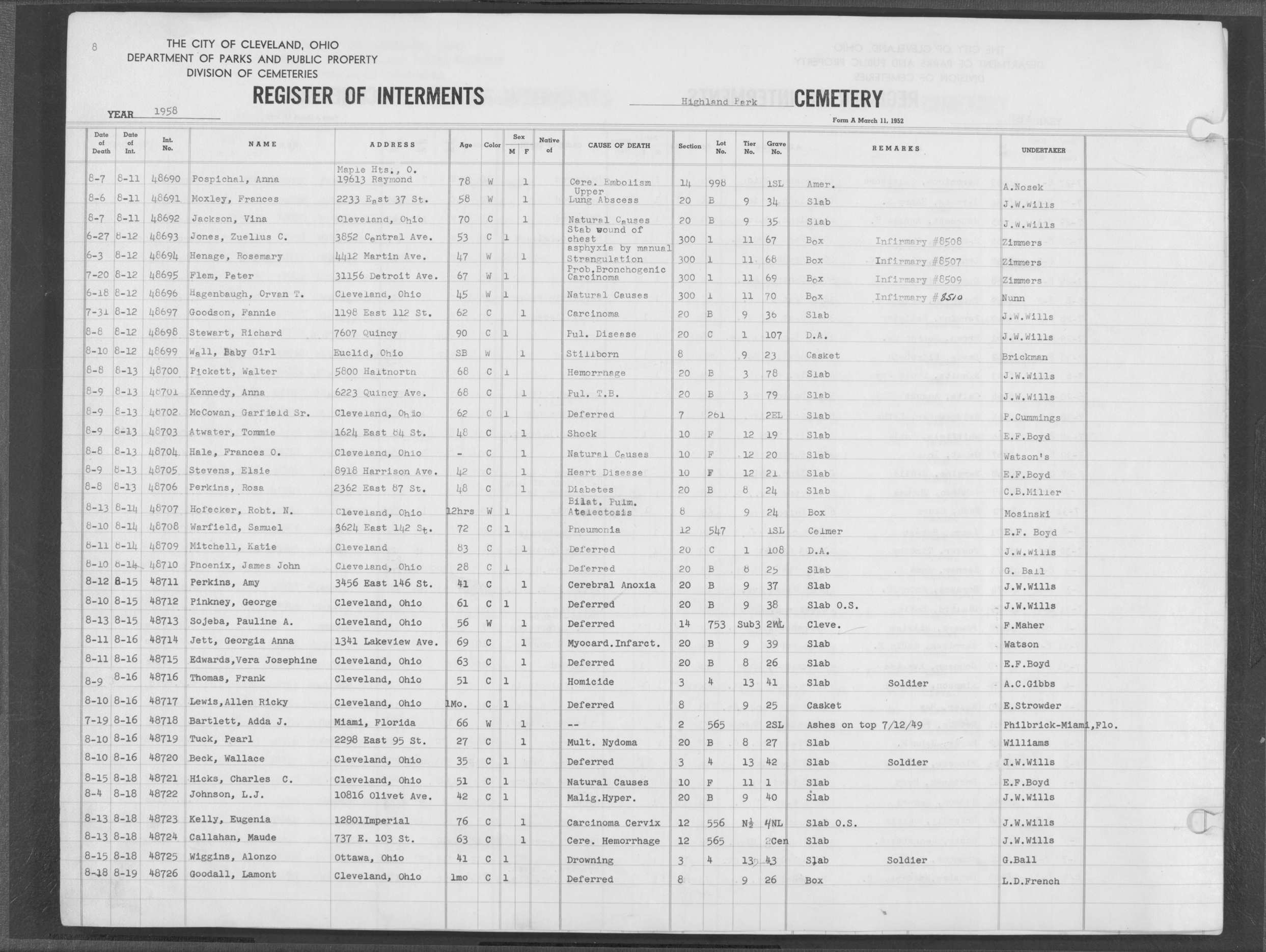 | Highland Park | 6 | 8 | Aug | 8 | 1958 | Aug | 13 | 1958 | 48706 | Perkins, Rosa | 48y | C | F | |